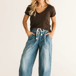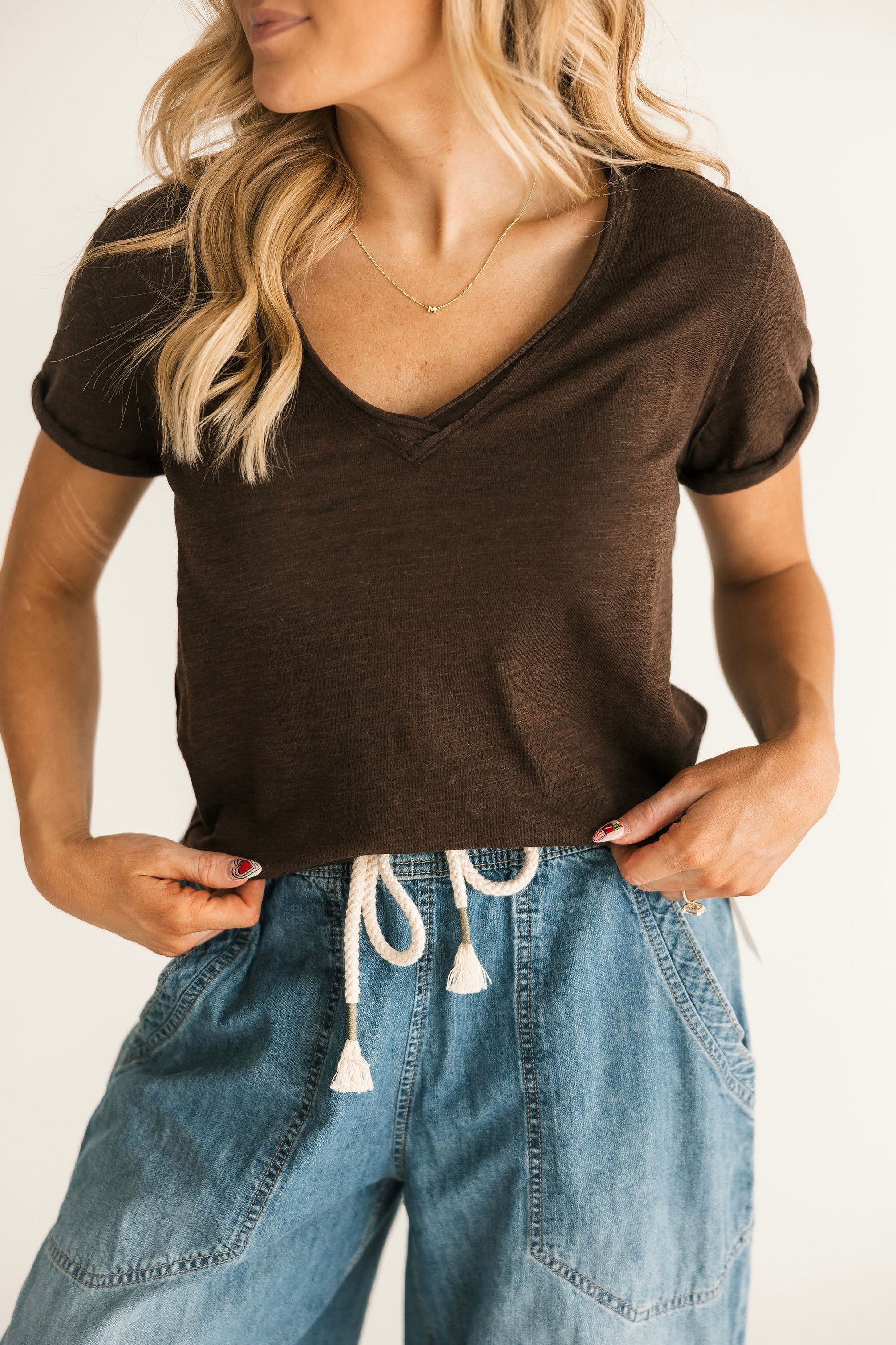 Perfect for layering, this short-sleeved tee from We The Free is featured in a boxy cut and a V-neckline for endless outfitting potential. Lexi is wearing an xs.