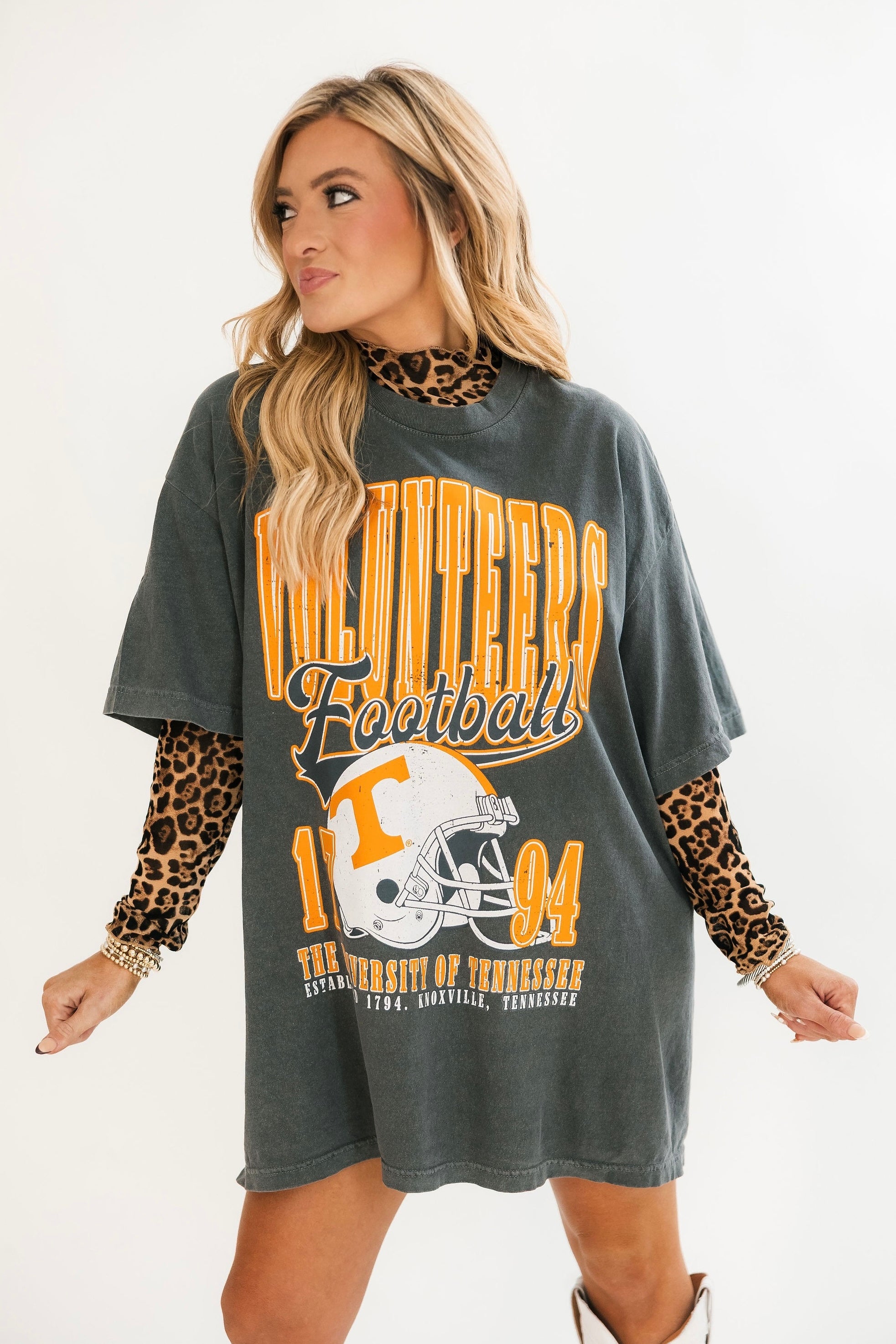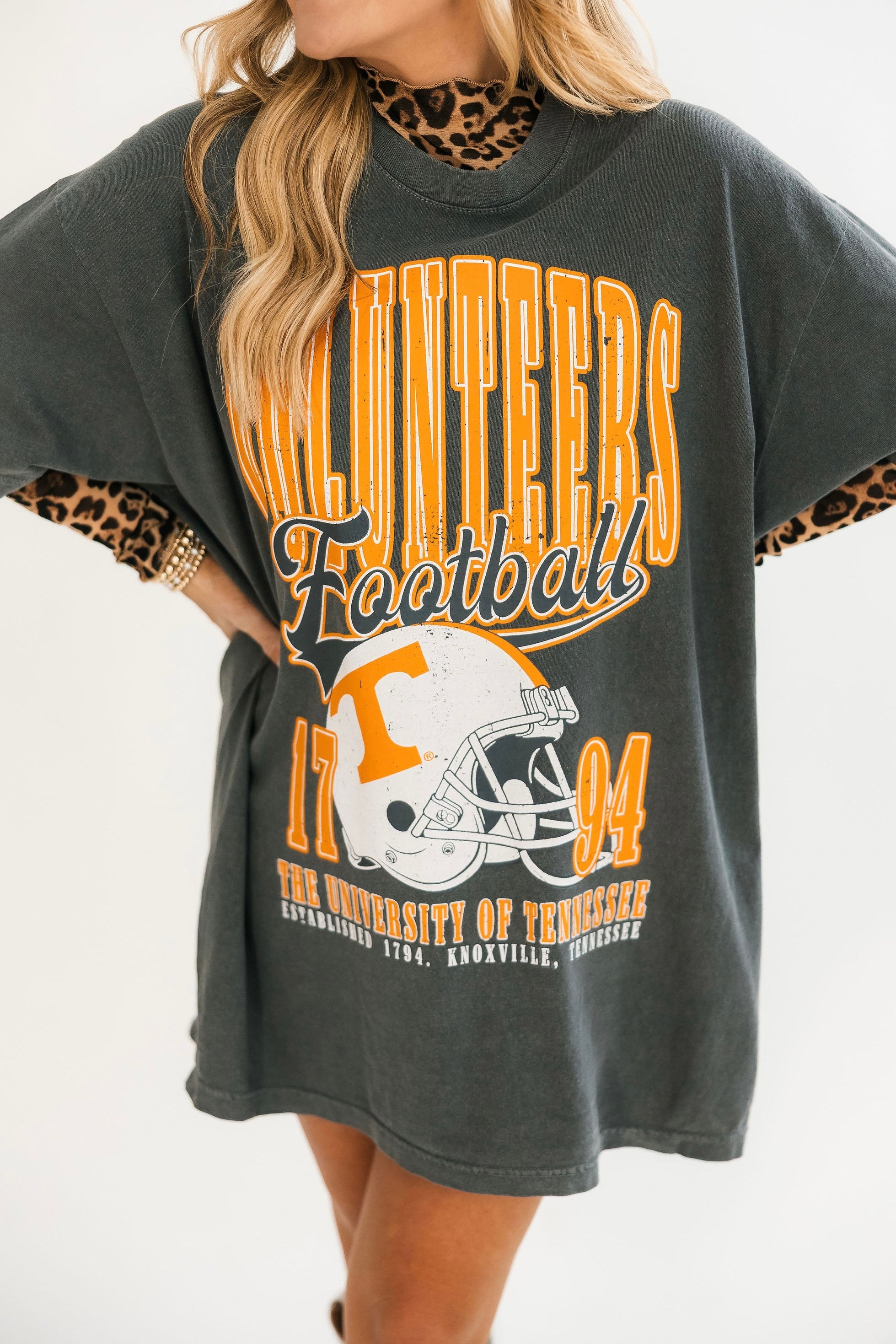 The Tennessee Volunteers Helmet Tee is a must-have for true fans. Featuring a relaxed fit, classic crewneck, and bold Tennessee football helmet graphic, this tee delivers both comfort and team pride. Perfect for tailgates, watch parties, or everyday wear, it’s the ultimate piece to rep your Vols spirit with ease. Lexi is wearing a S/M.