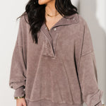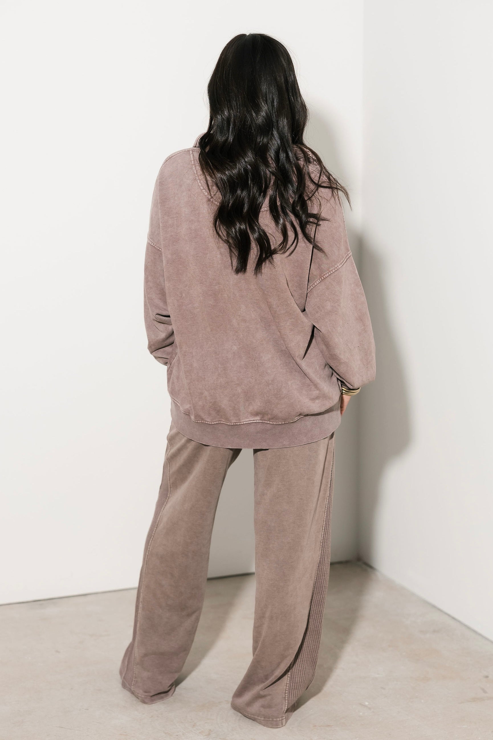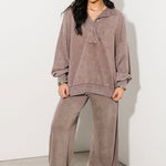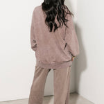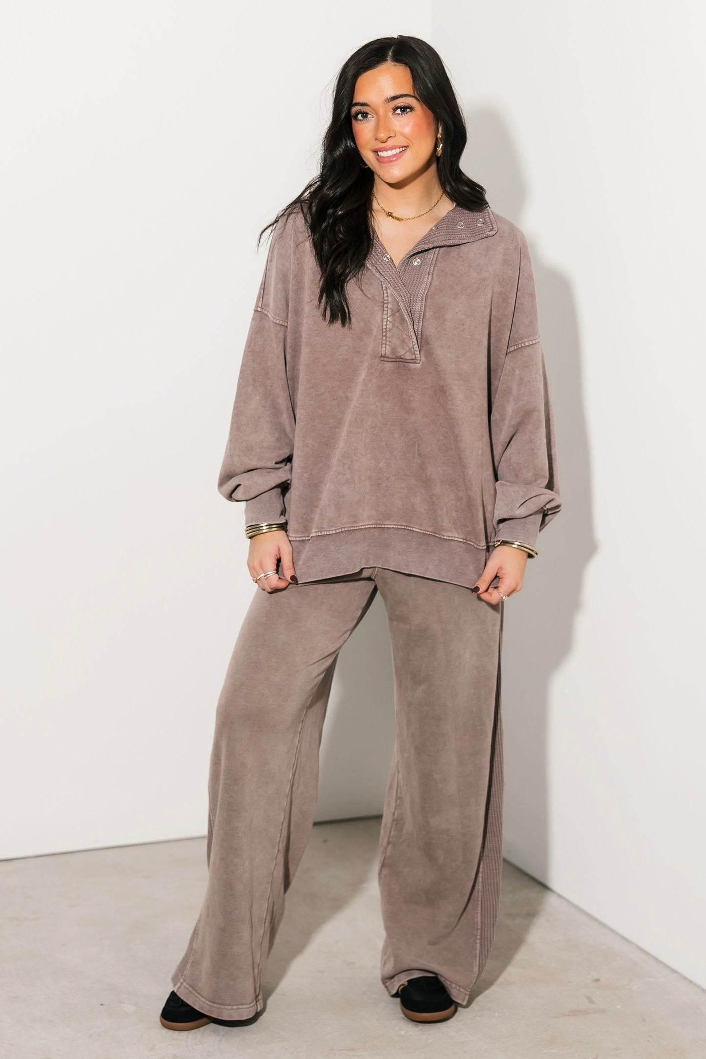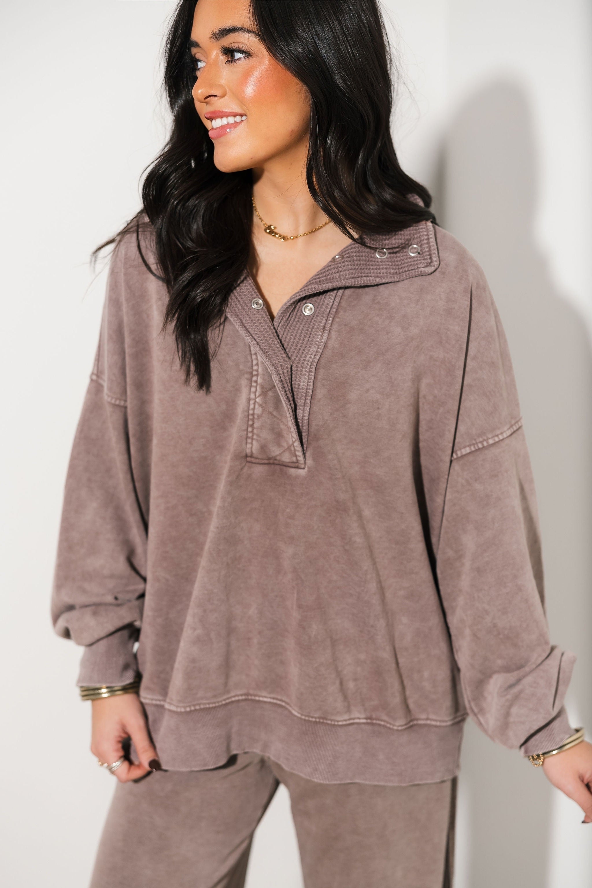 The Terry Quarter Snap Pullover in Mocha features an oversized, relaxed fit with a collared neckline, long sleeves, and a functional quarter snap front. Made from soft, cozy fabric, it’s designed for comfort without sacrificing style. Complete the look with the matching wide-leg sweatpants for the ultimate laid-back set you’ll live in. Sage is wearing a small.