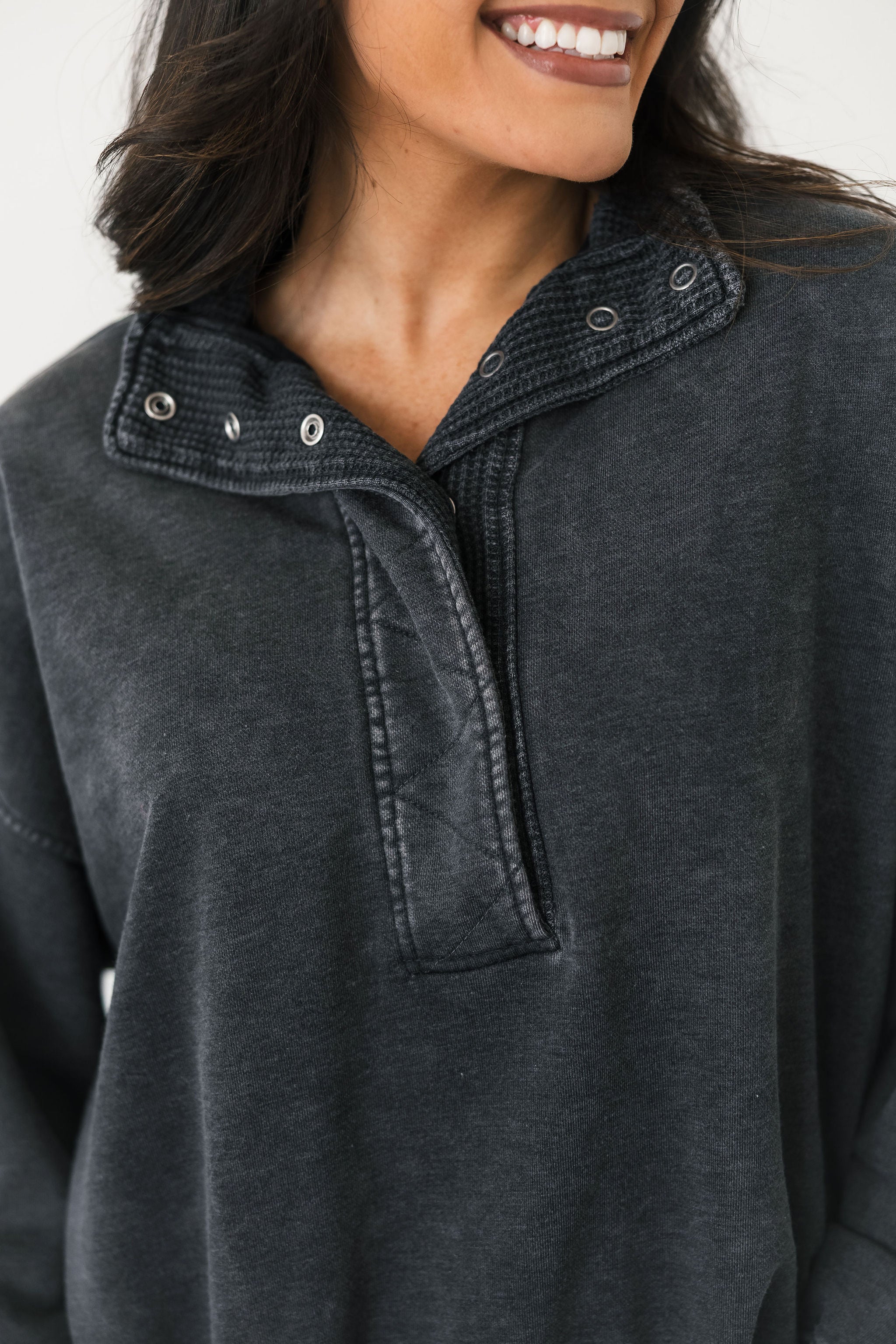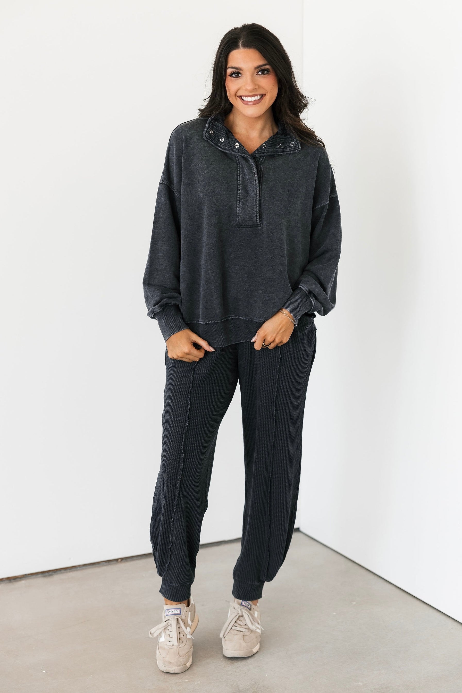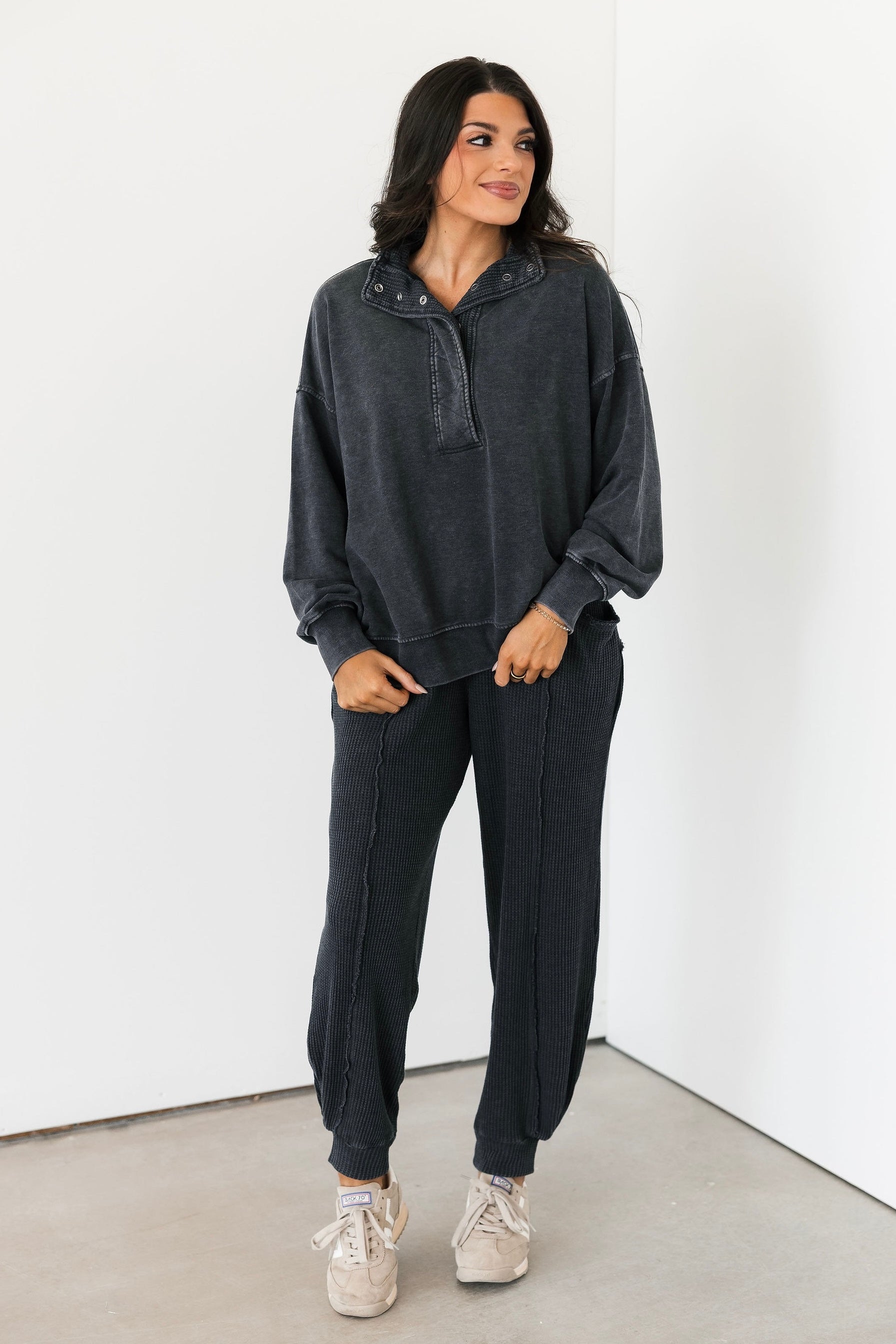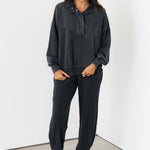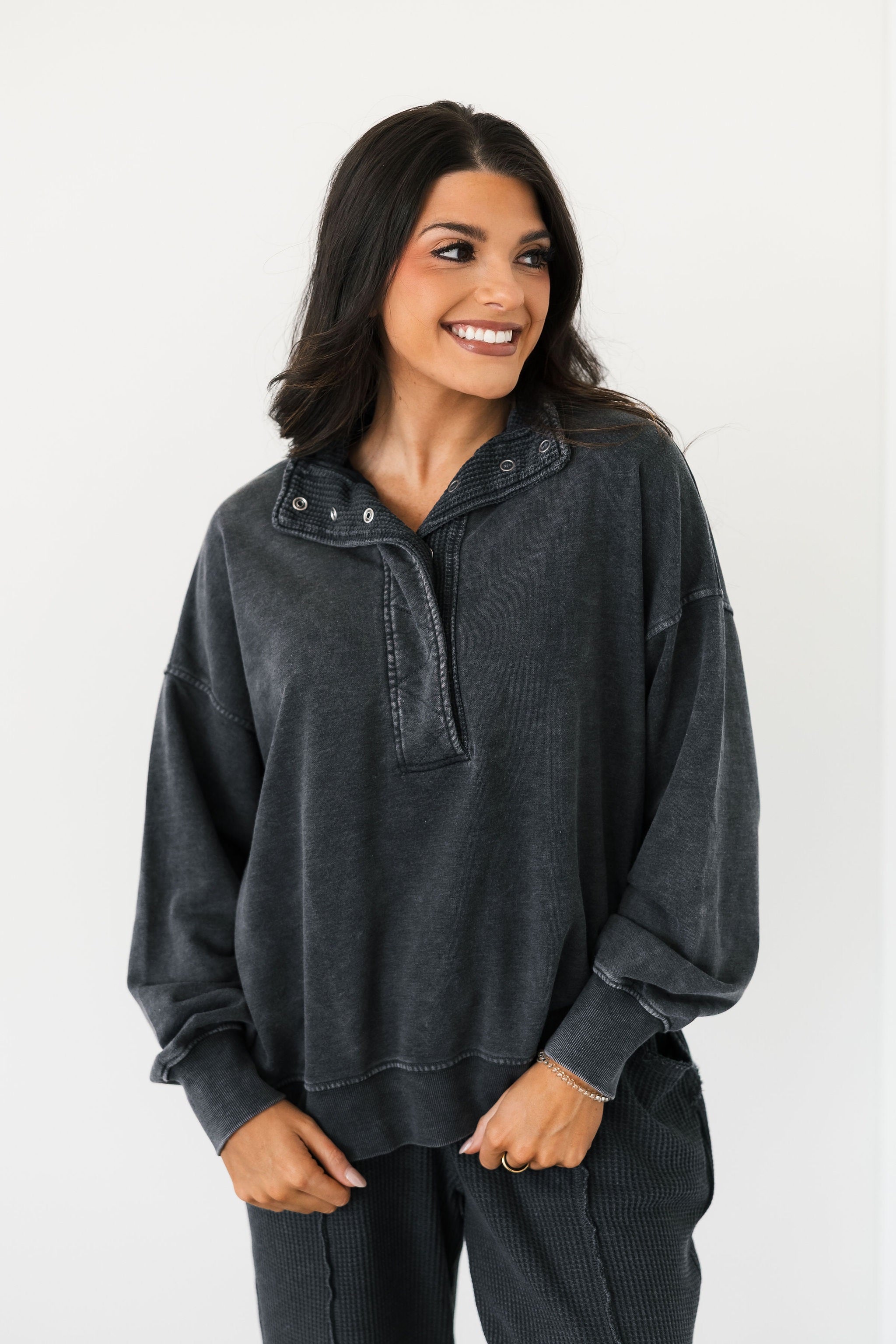 The Terry Quarter Snap Pullover in Washed Black features an oversized, relaxed fit with a collared neckline, long sleeves, and a functional quarter snap front. Made from soft, cozy fabric, it’s designed for comfort without sacrificing style. Complete the look with the matching wide-leg sweatpants for the ultimate laid-back set you’ll live in. Sage is wearing a small. Harli is wearing a medium.