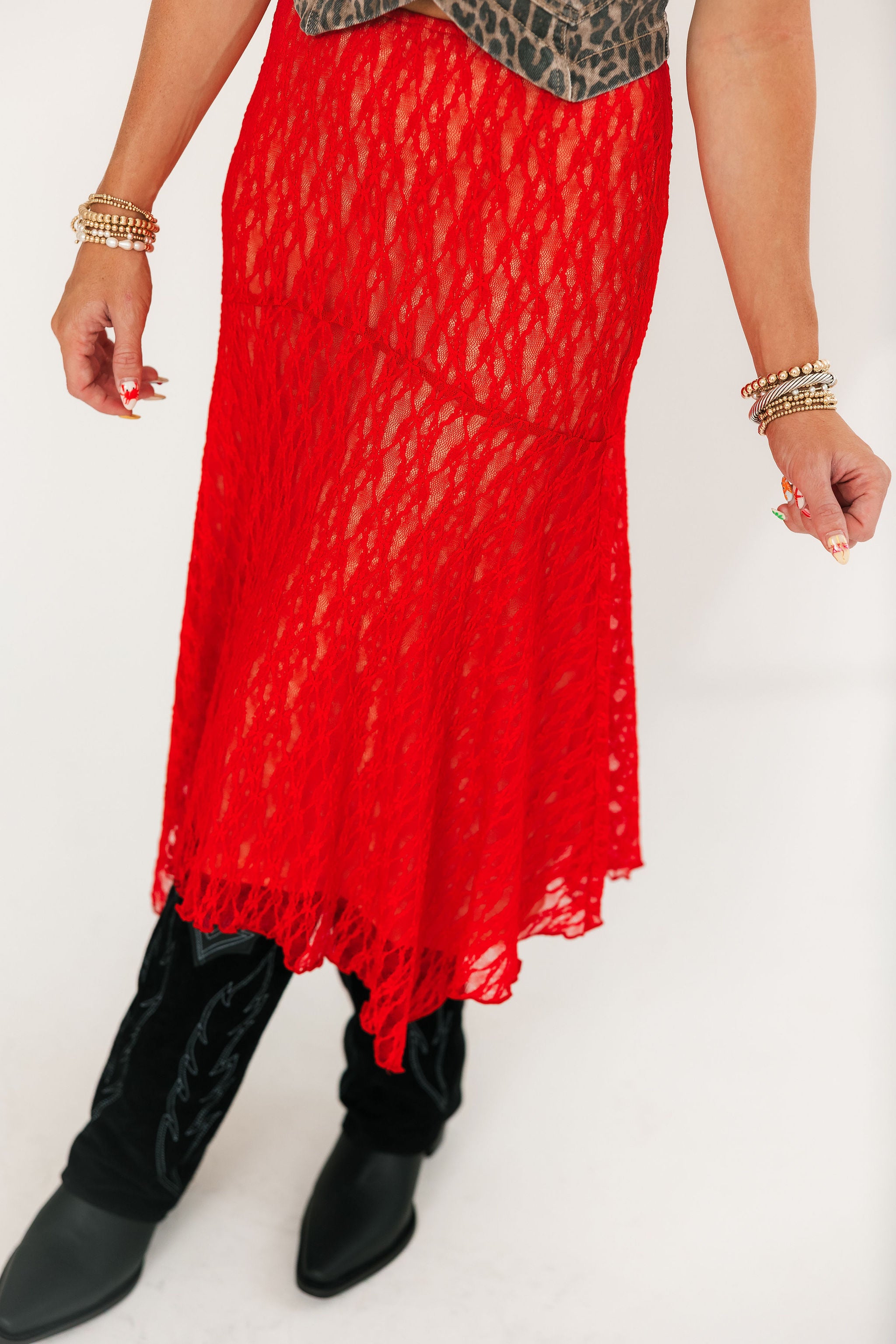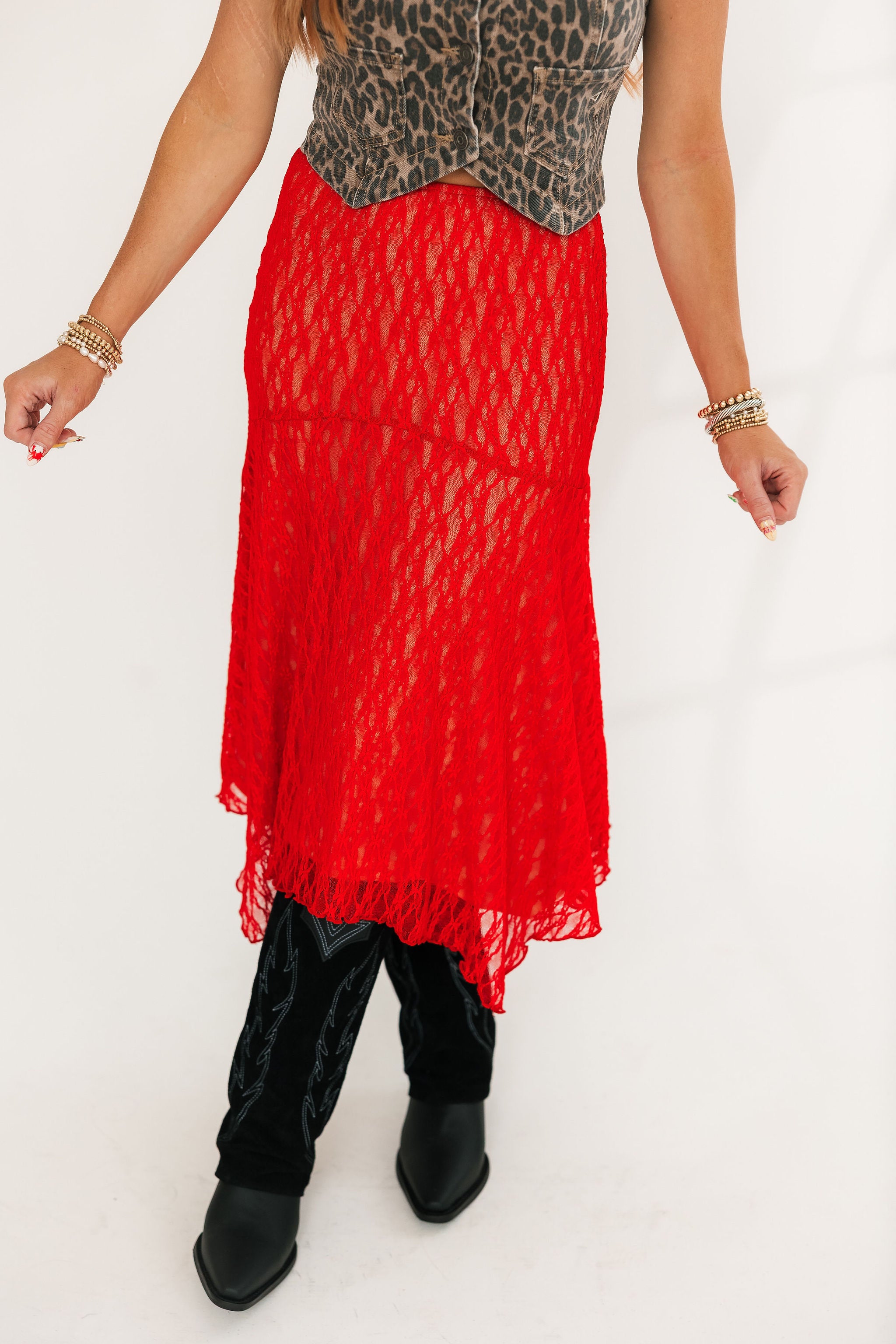 Romantic with a little edge, this fitted midi skirt features a stretchy feel, delicate lace detailing, and an eye-catching asymmetrical hem. Designed to move with you and turn heads. Lexi is wearing an xs.