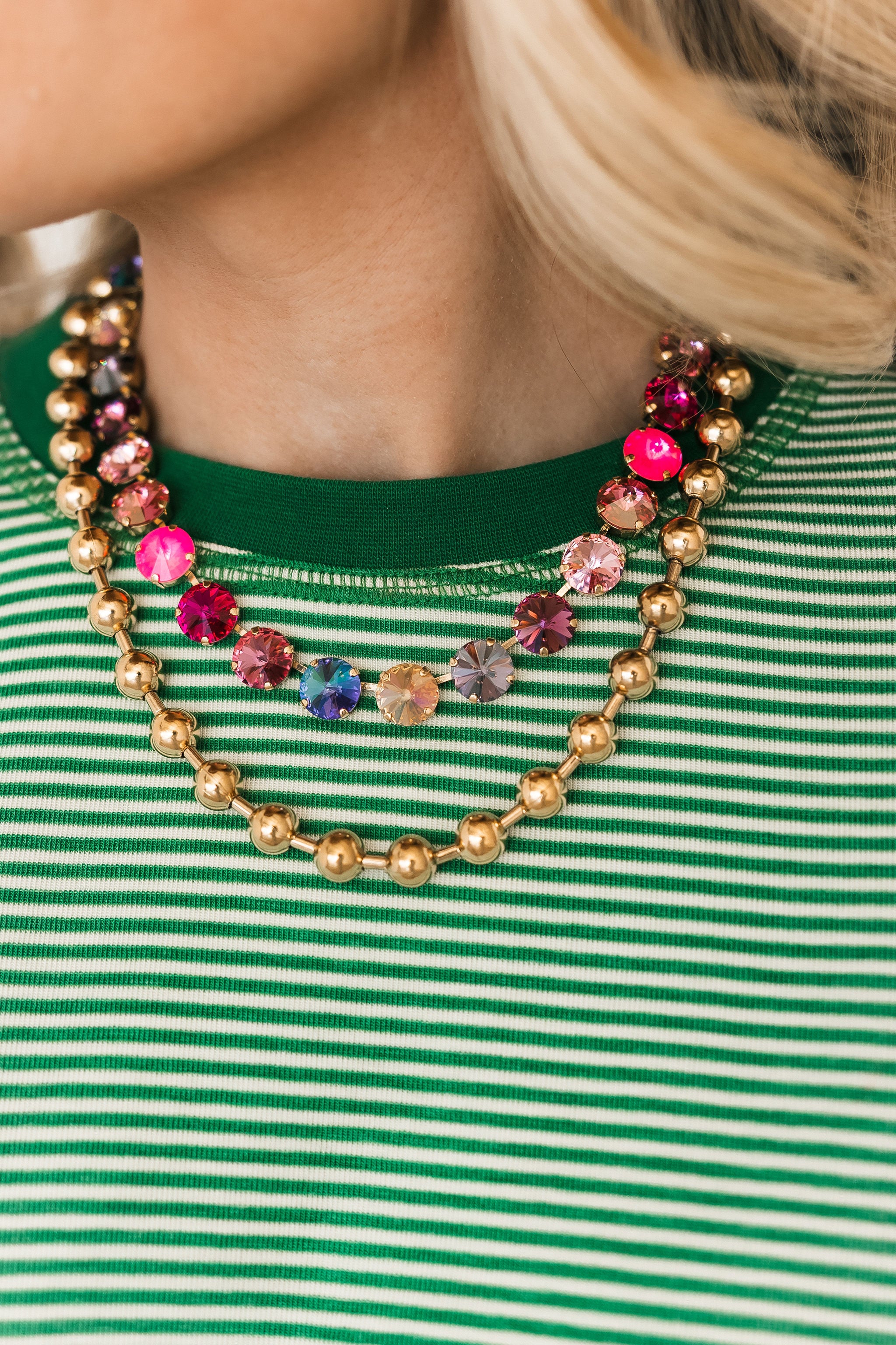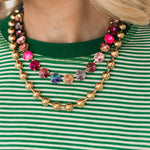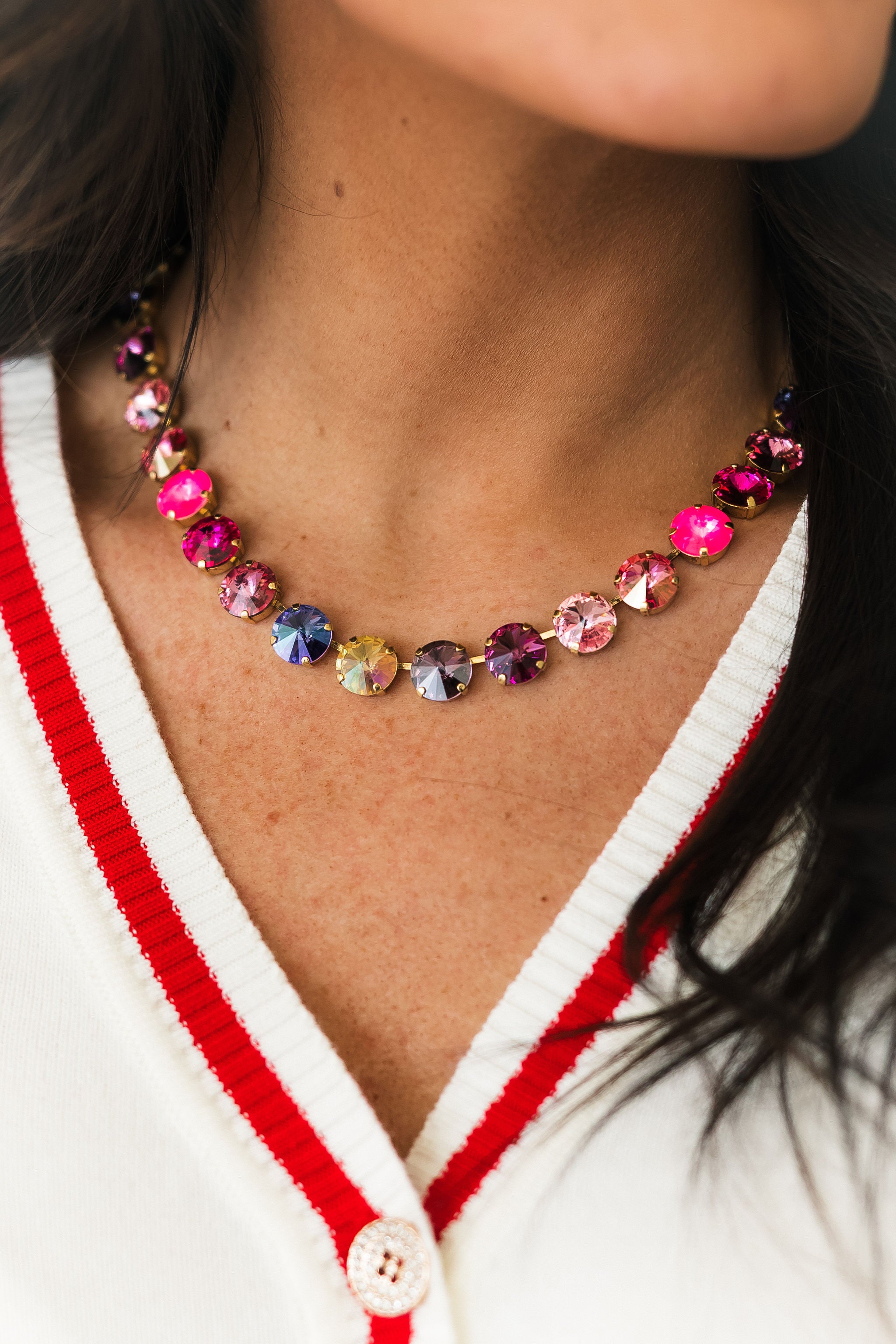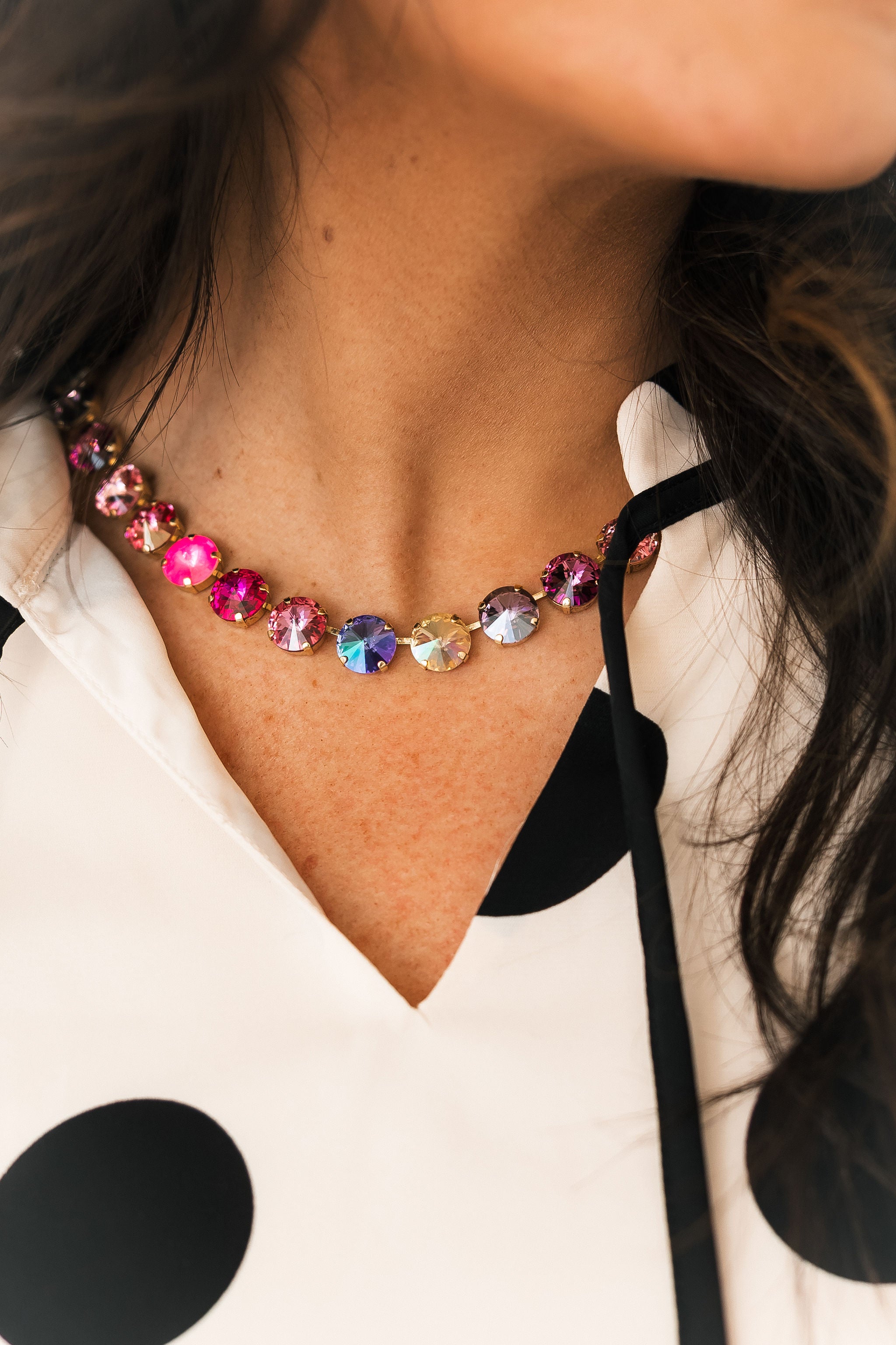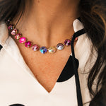 Get ready to turn heads with TOVA's The Sofia Necklace in Pink Mix. This handcrafted necklace features an Antique Gold plated base adorned with sparkling high quality crystals. Its 14.5" length with extender makes it versatile for any occasion. Elevate your look with this Canadian-made statement piece.