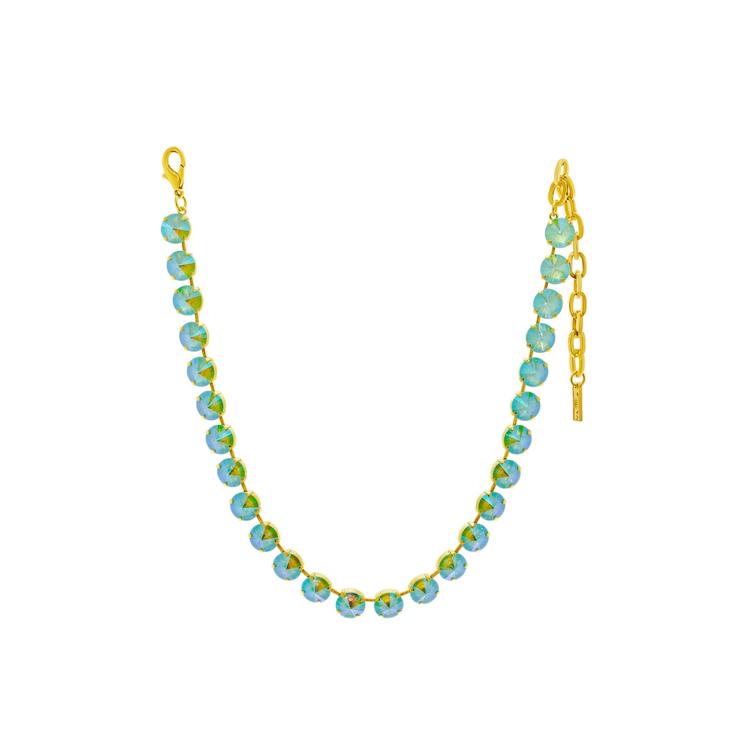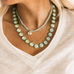 The TOVA The Sofia Necklace In Soft Mint Ignite Glacier Blue features a delicate design with radiant tones that bring a light, feminine touch to any outfit. Perfect for layering or wearing on its own, this necklace adds an effortless hint of color and shine to both everyday looks and dressier moments.