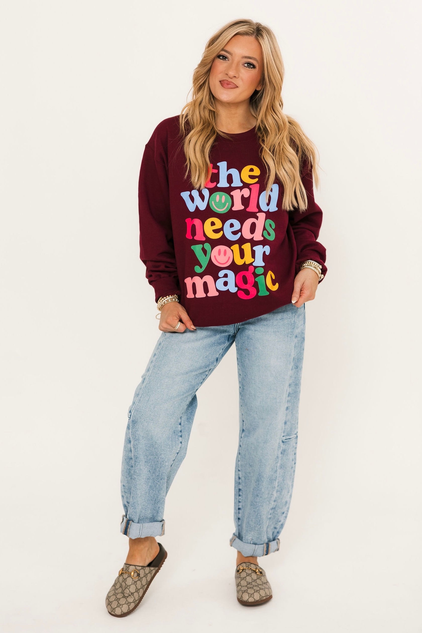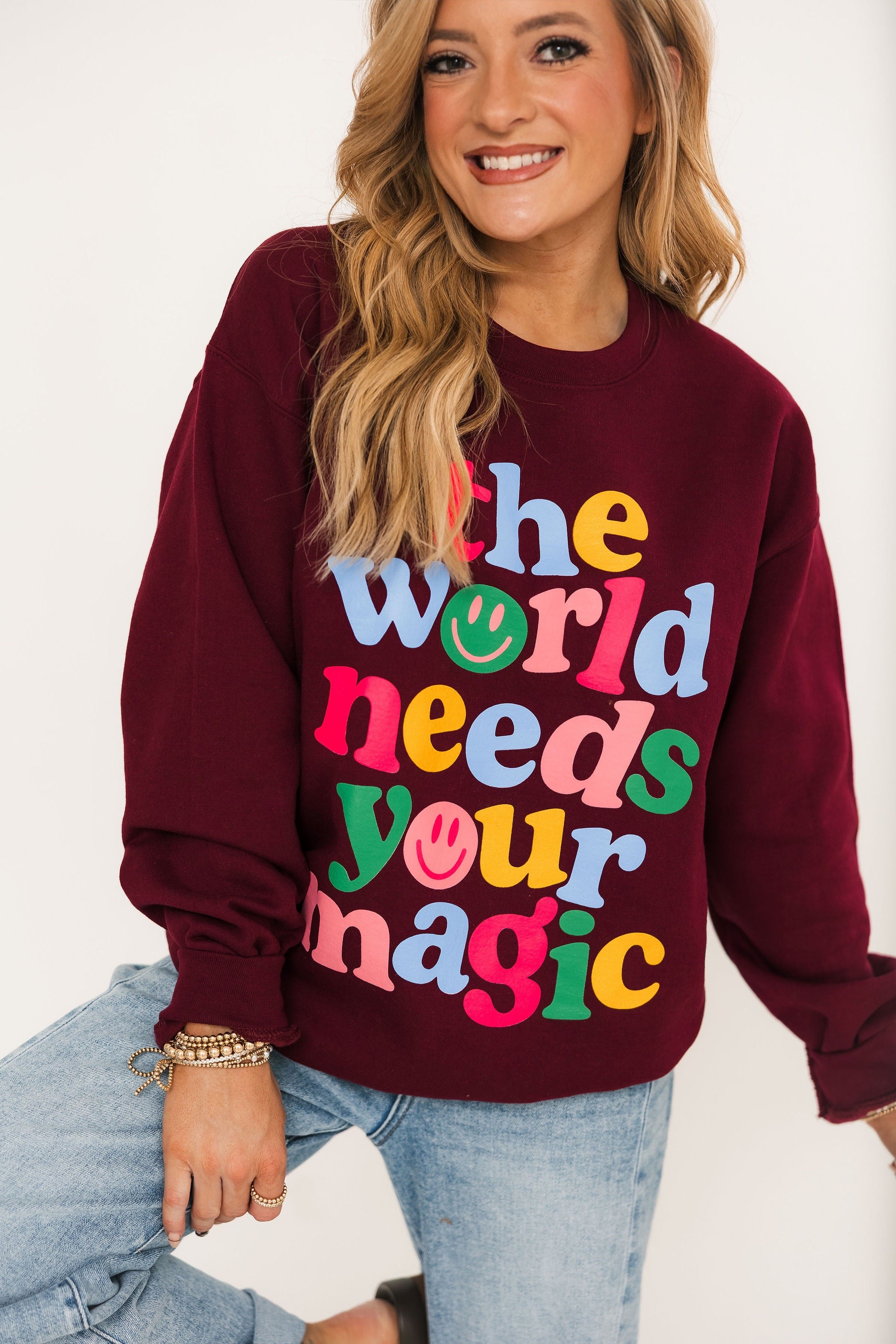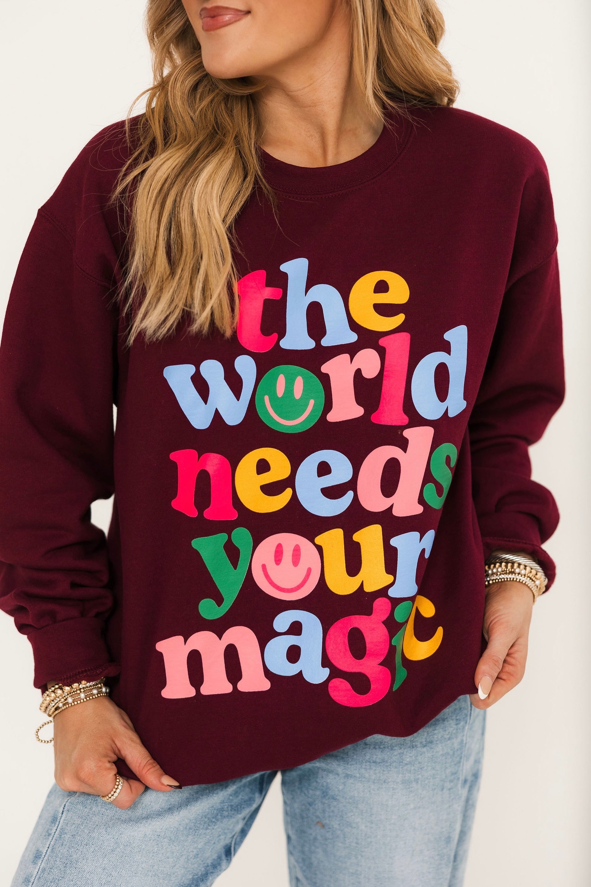 Spread positivity and cozy vibes with the World Needs Your Magic Sweatshirt. Designed with a relaxed fit and a classic crewneck, this piece is all about comfort with a meaningful touch. The uplifting graphic is a reminder to shine your light and share your magic, making it the perfect feel-good layer for everyday wear. Pair with jeans, leggings, or joggers for an effortlessly inspiring look. Lexi is wearing a small.
