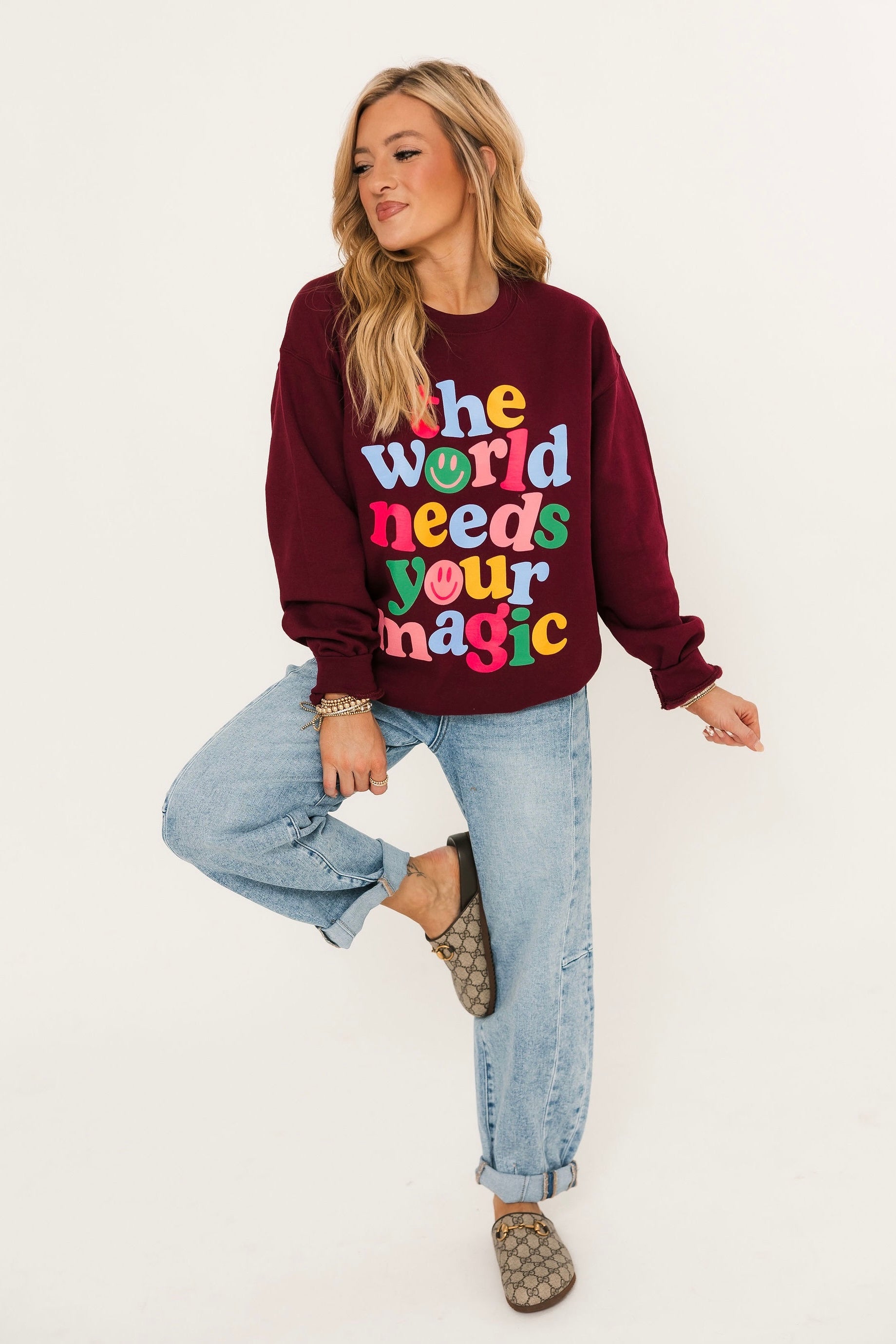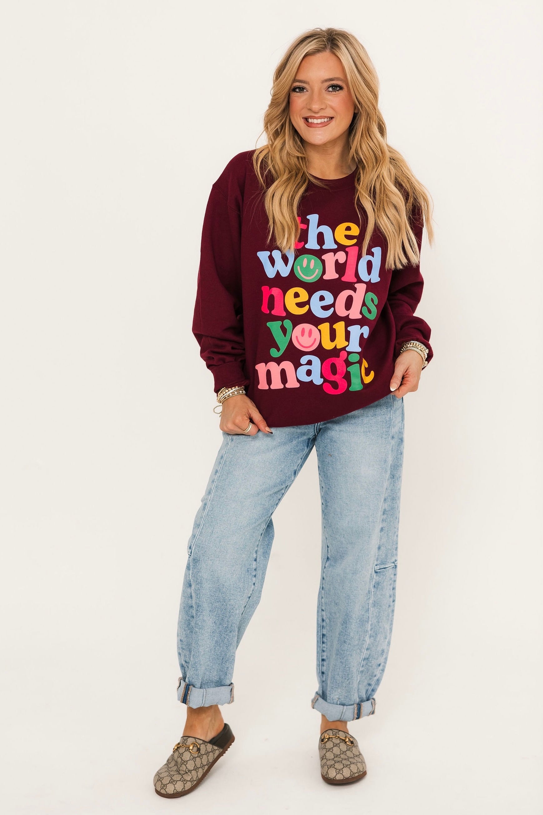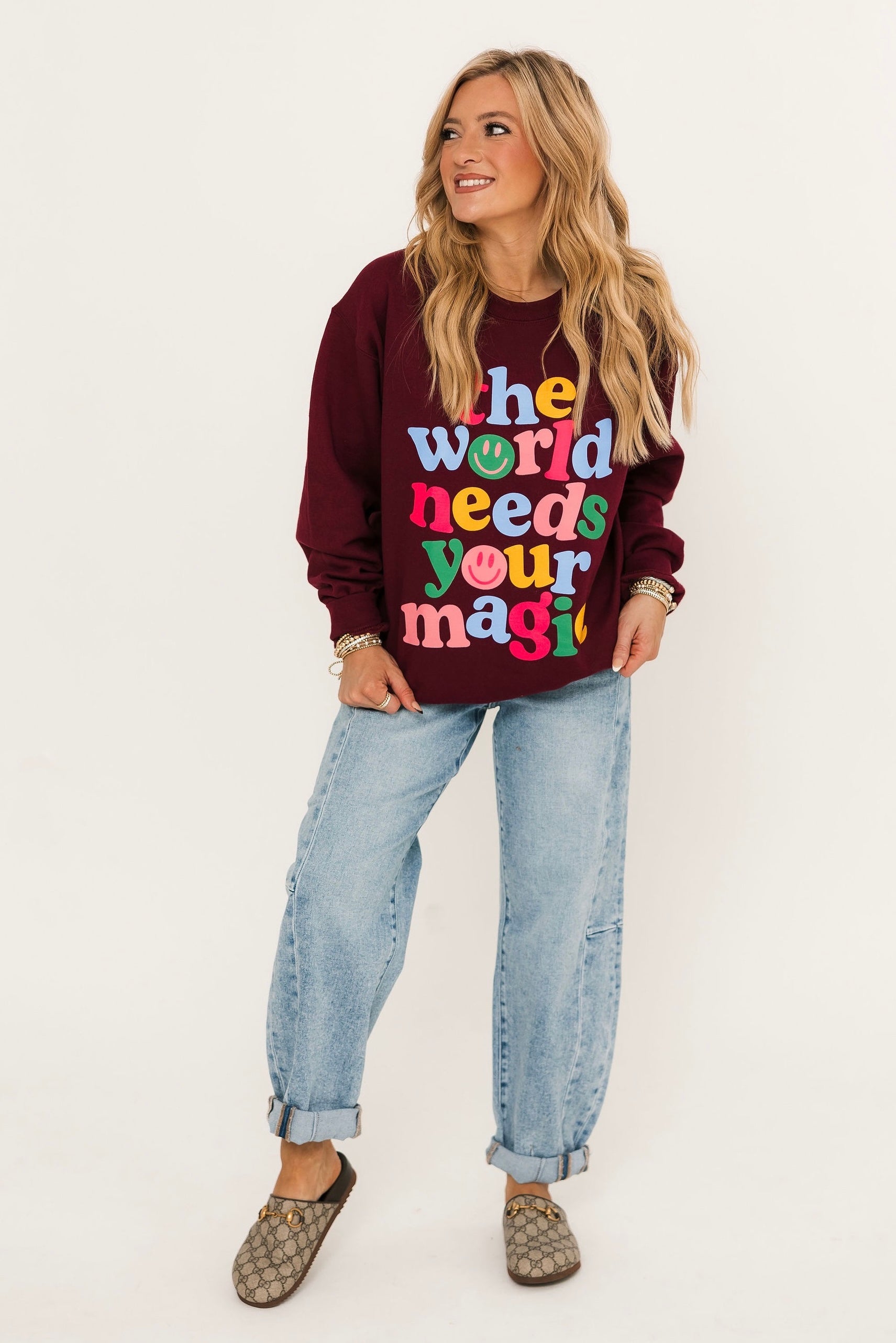 Spread positivity and cozy vibes with the World Needs Your Magic Sweatshirt. Designed with a relaxed fit and a classic crewneck, this piece is all about comfort with a meaningful touch. The uplifting graphic is a reminder to shine your light and share your magic, making it the perfect feel-good layer for everyday wear. Pair with jeans, leggings, or joggers for an effortlessly inspiring look. Lexi is wearing a small.
