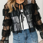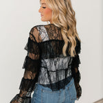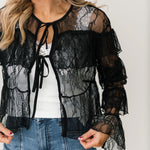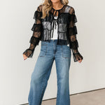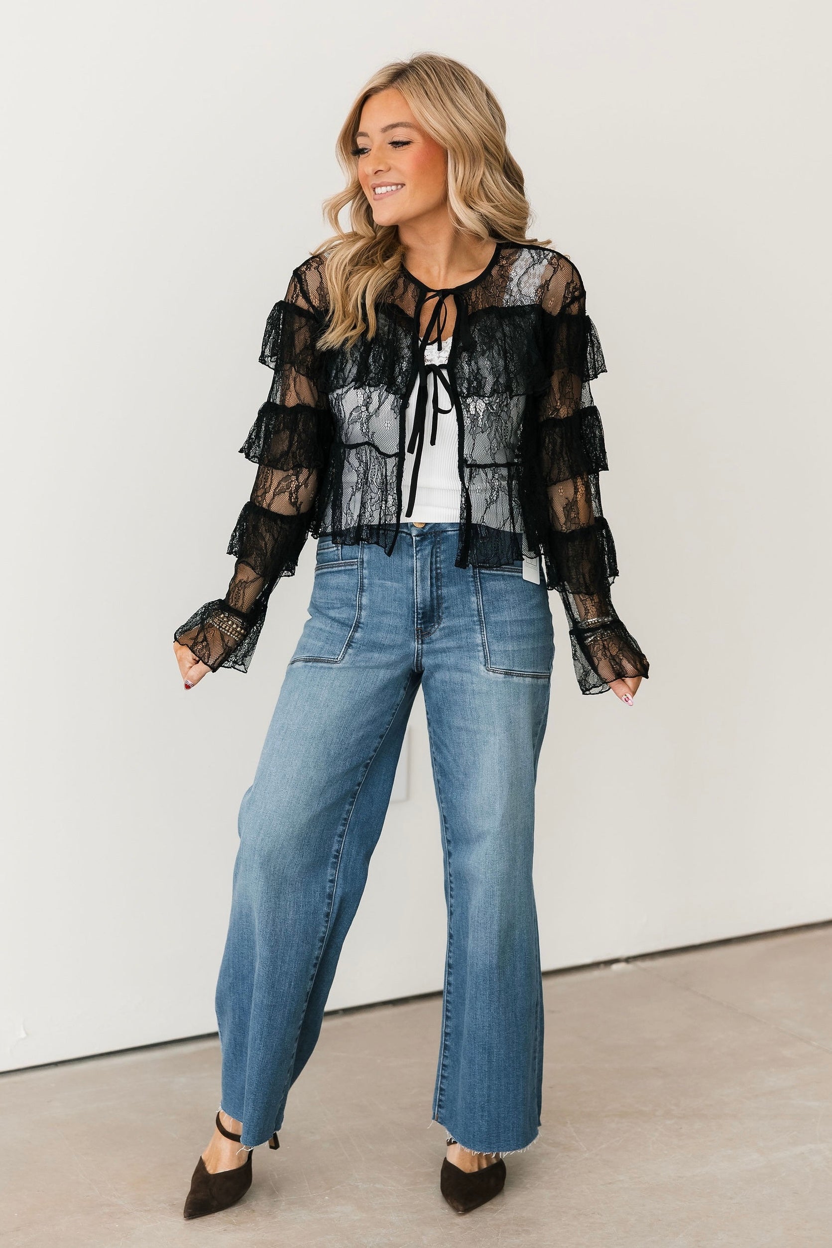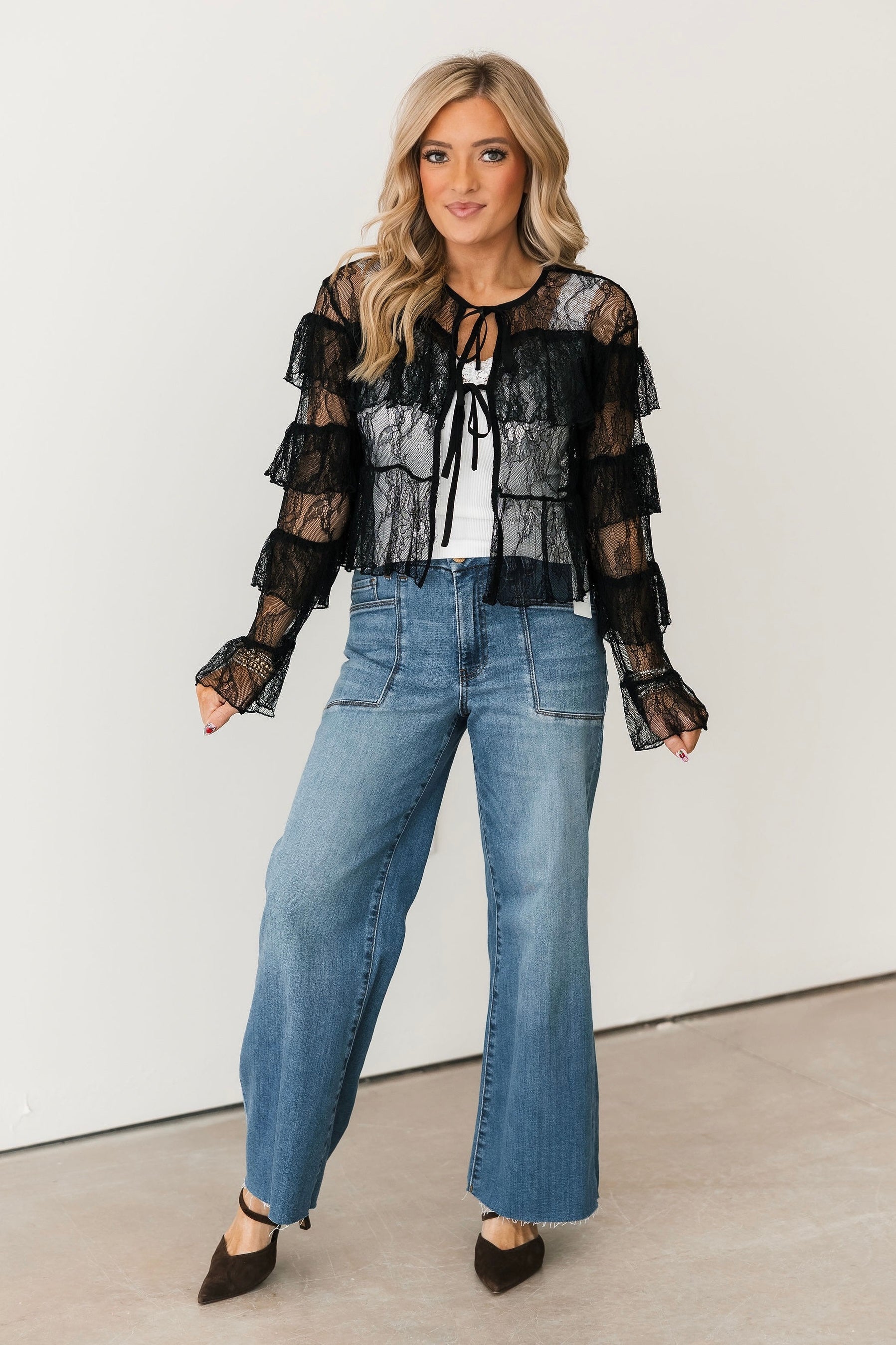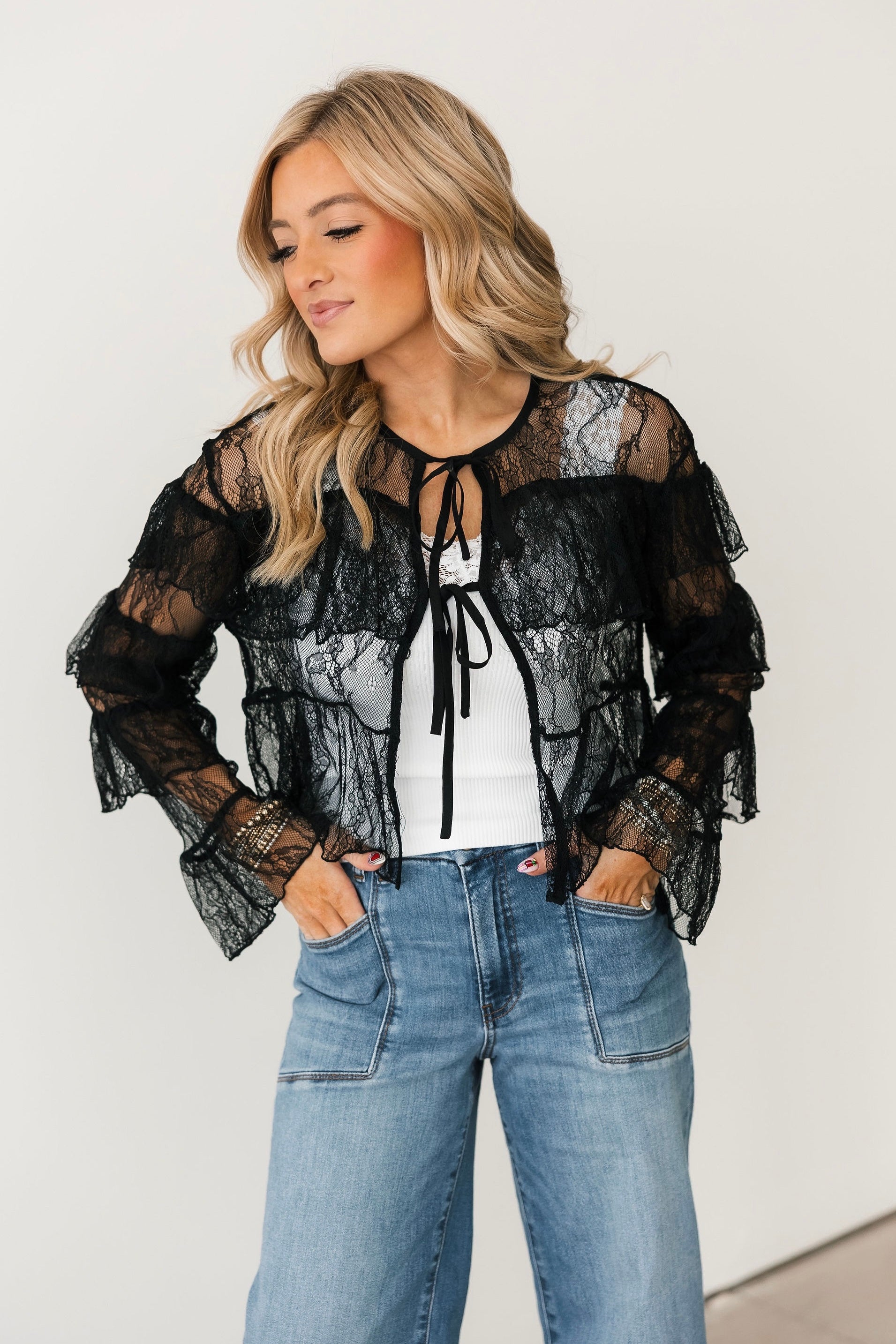 The Thought You Should Know Lace Top in Black features a relaxed fit with beautifully sheer lace detailing throughout. Designed with a tie-front closure, long sleeves, and delicate tiering, it drapes effortlessly for a whimsical, airy silhouette. Lightweight, elegant, and versatile — it’s a statement top that feels both timeless and unique. Lexi is wearing an xs.