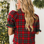 Bring a little sparkle to your season with the Tinsel & Twinkle Top. Designed in a festive plaid print, this relaxed-fit blouse features short puff sleeves, ruffle detailing, and a flattering V-neckline. Perfect for holiday gatherings or cozy nights out, it’s the ideal mix of classic and playful. Lexi is wearing a small.