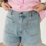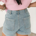 The Top Notch Shorts are your classic denim shorts, just a little elevated. They feature front patch pockets, belt loops, a button and zipper fly closure, and back patch pockets for that timeless look. Easy to style and perfect for everyday wear, these are the kind of shorts you’ll reach for all season long! Sage is wearing a small.