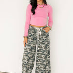 Step into bold, laid-back style with the Trailblazer Pants In Camo. Designed with a relaxed wide-leg silhouette and a shoestring belt tie for a custom fit, these pants bring a cool, effortless edge to any outfit. The classic camo print makes them an easy go-to for casual days or styled-up streetwear looks. Sage and Lexi are both wearing a small.