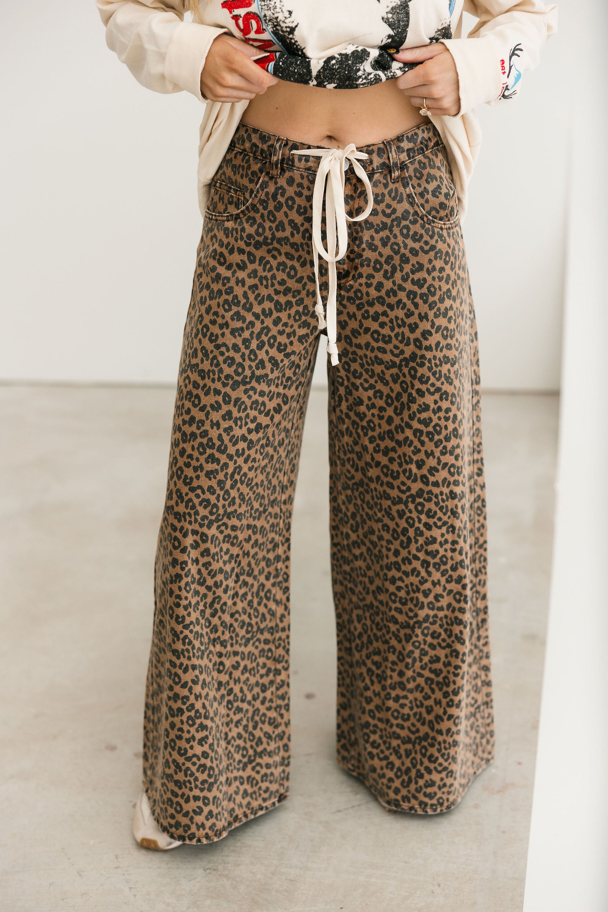 Step into bold, laid-back style with the Trailblazer Pants In Cheetah. Designed with a relaxed wide-leg silhouette and a shoestring belt tie for a custom fit, these pants bring a cool, effortless edge to any outfit. The classic cheetah print makes them a fun pant to style. Lexi is wearing a small.