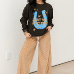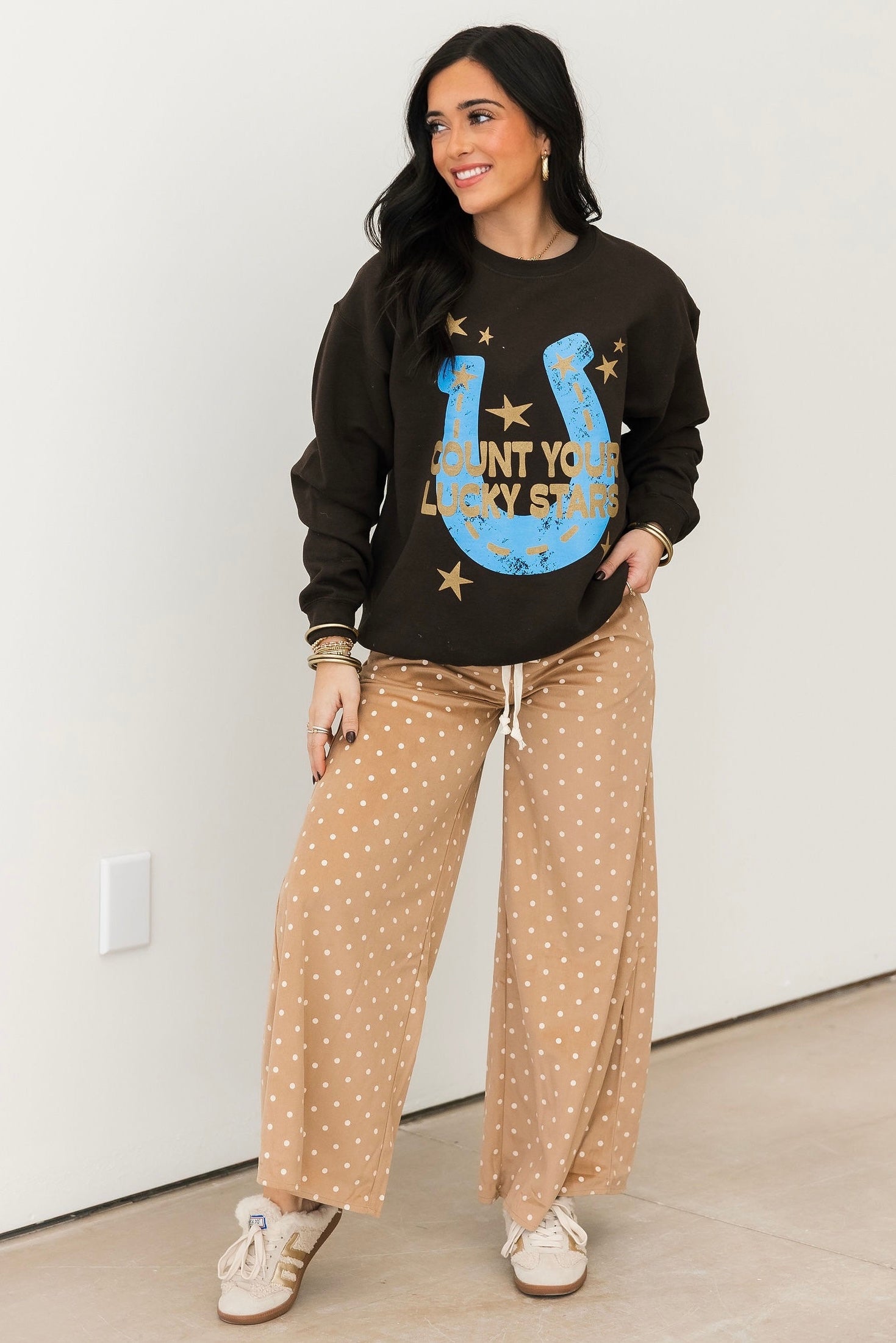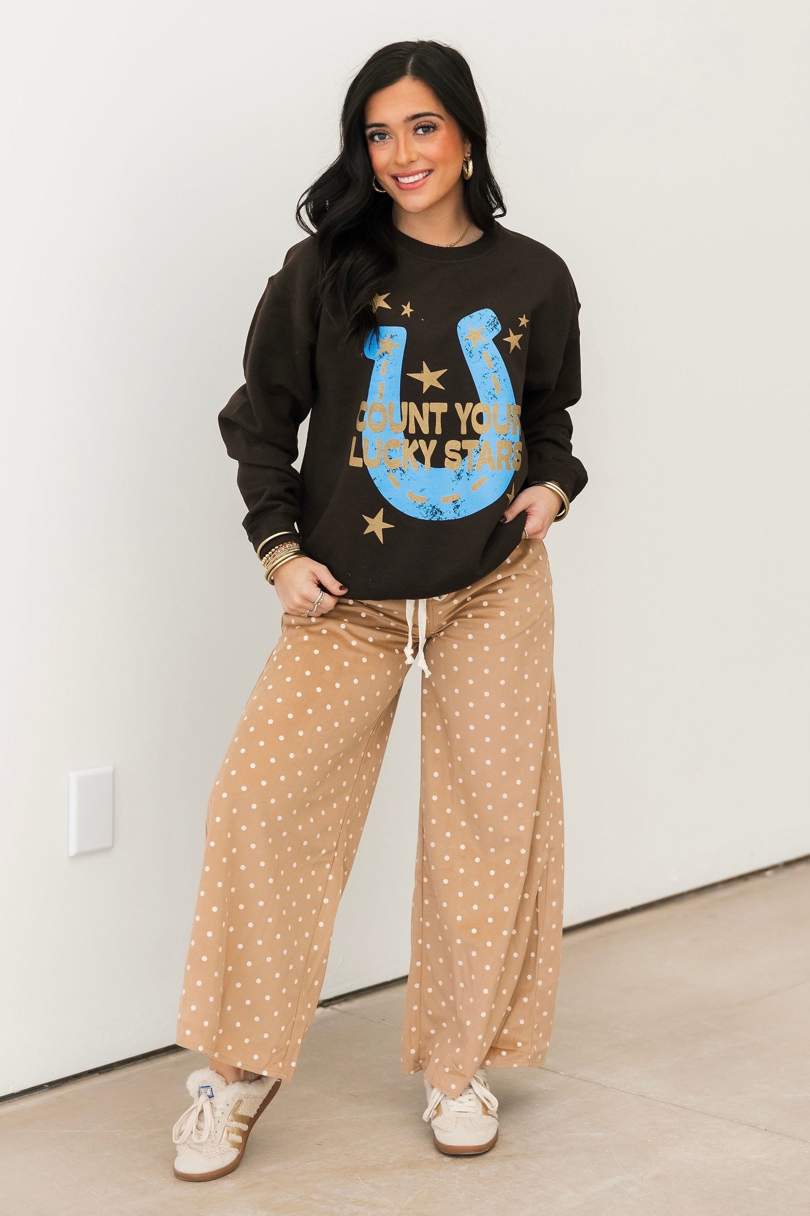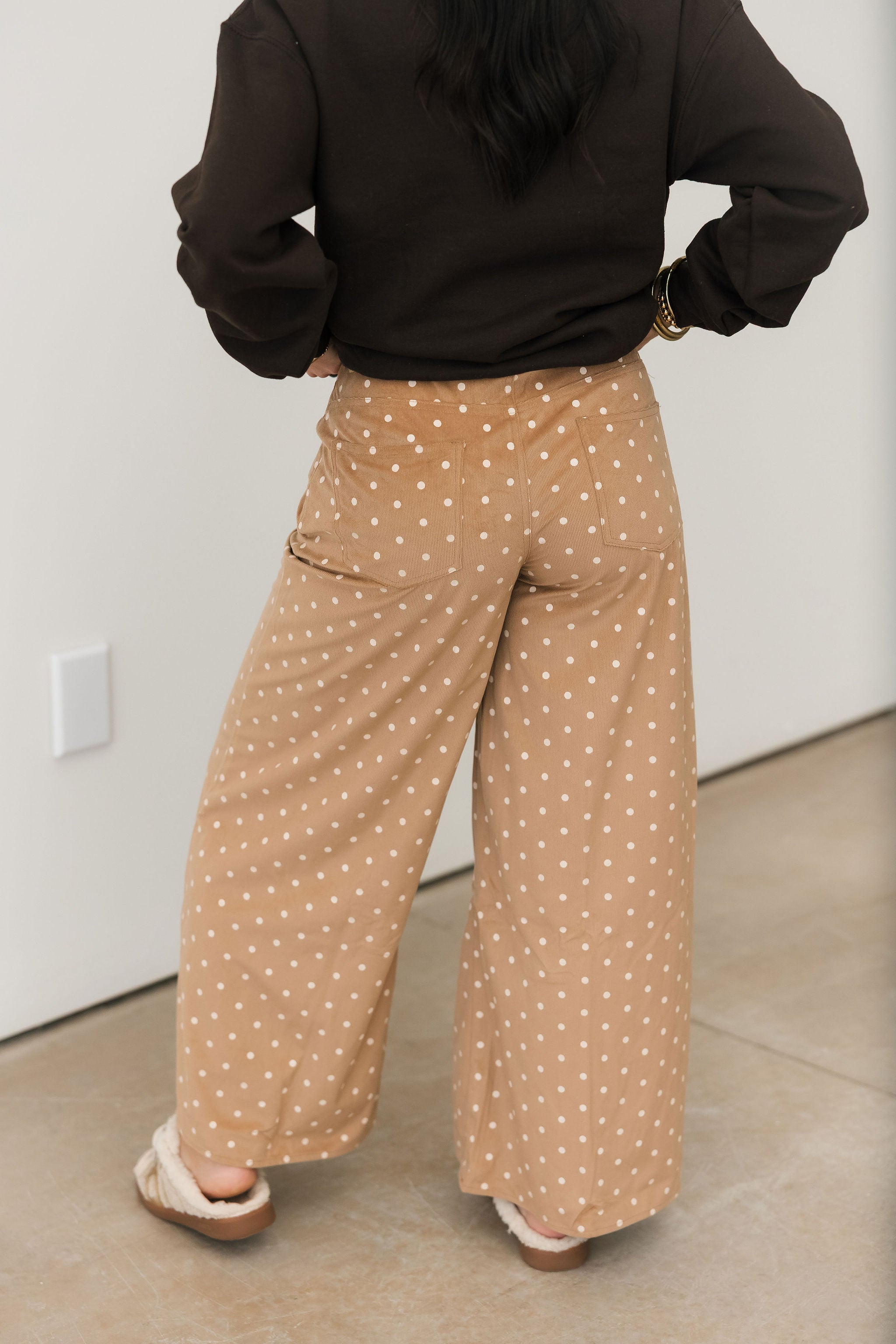 Step into bold, laid-back style with the Trailblazer Pants In Mocha Polka Dot. Designed with a relaxed wide-leg silhouette and a shoestring belt tie for a custom fit, these pants bring a cool, effortless edge to any outfit. The classic polka dots print makes them a fun pant to style. Sage is wearing a small.