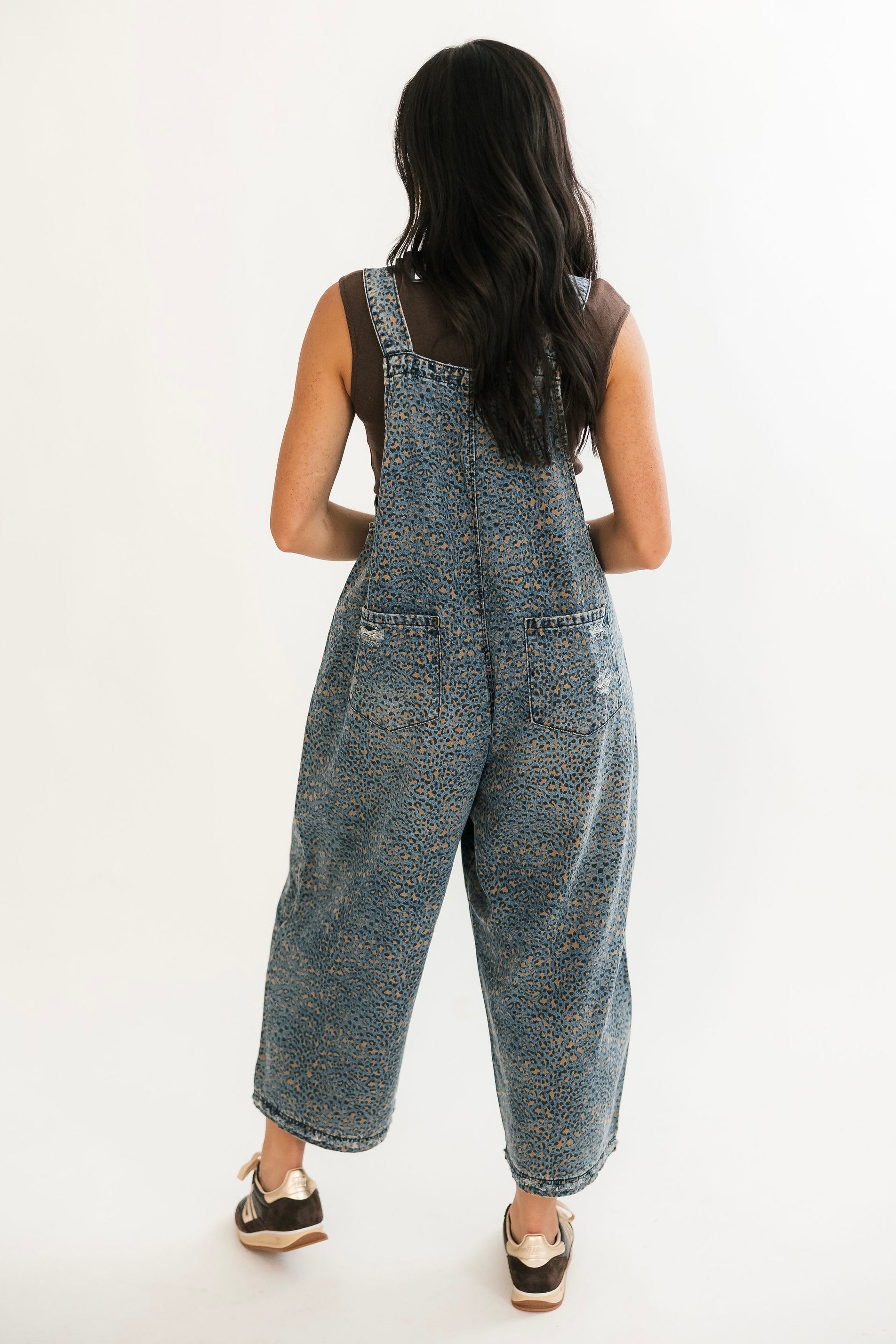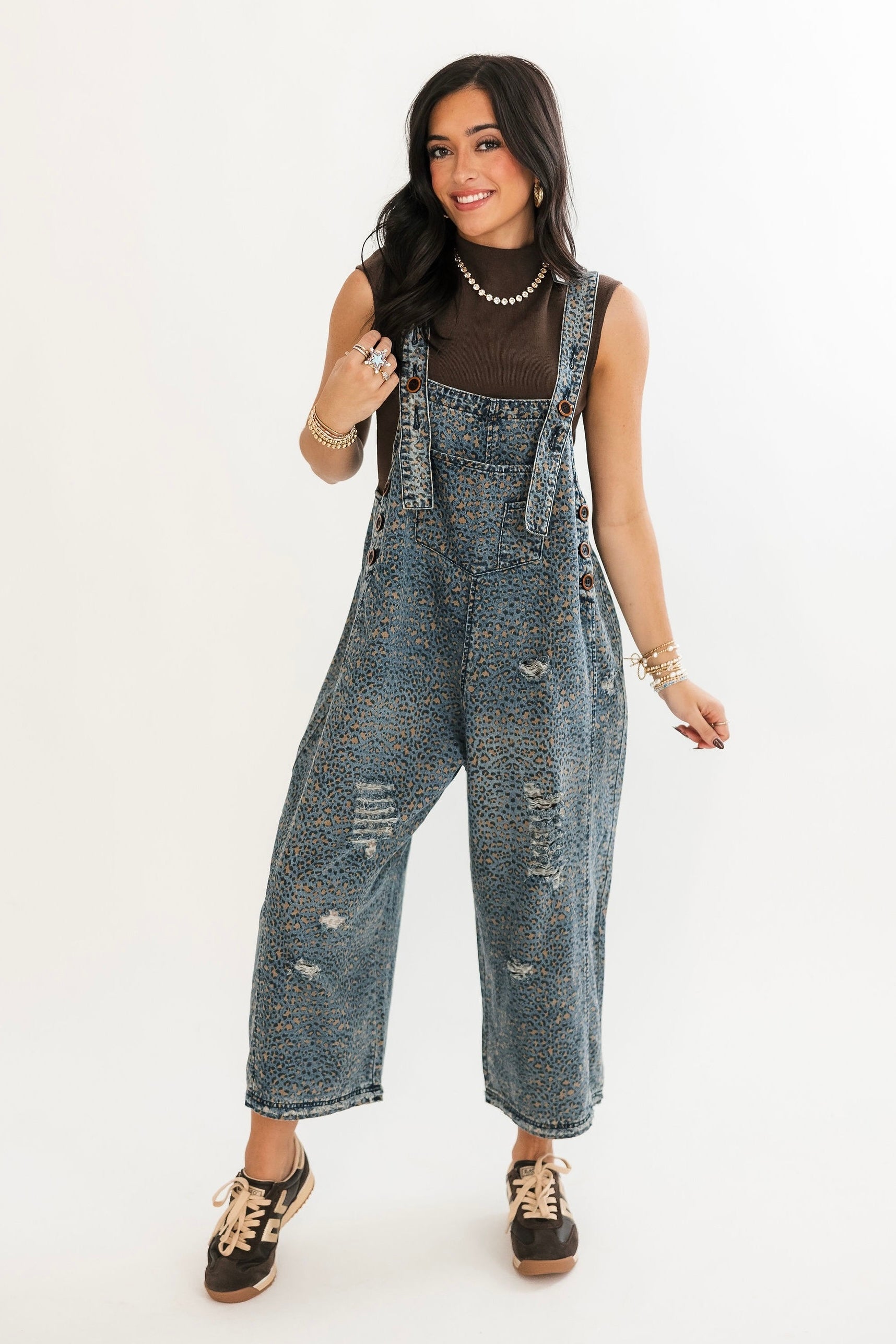 Bring a bold twist to a classic staple with the Untamed Chic Overalls. Crafted in denim with an allover leopard print, these overalls are made to stand out while keeping things casual and comfortable. The cropped wide leg silhouette adds a modern touch, while functional details like a front bib with patch pockets, side button closures, and adjustable straps keep it practical. Perfect for layering with tees, sweaters, or tanks, it’s an effortlessly cool piece for year-round wear. Sage is wearing a small.