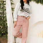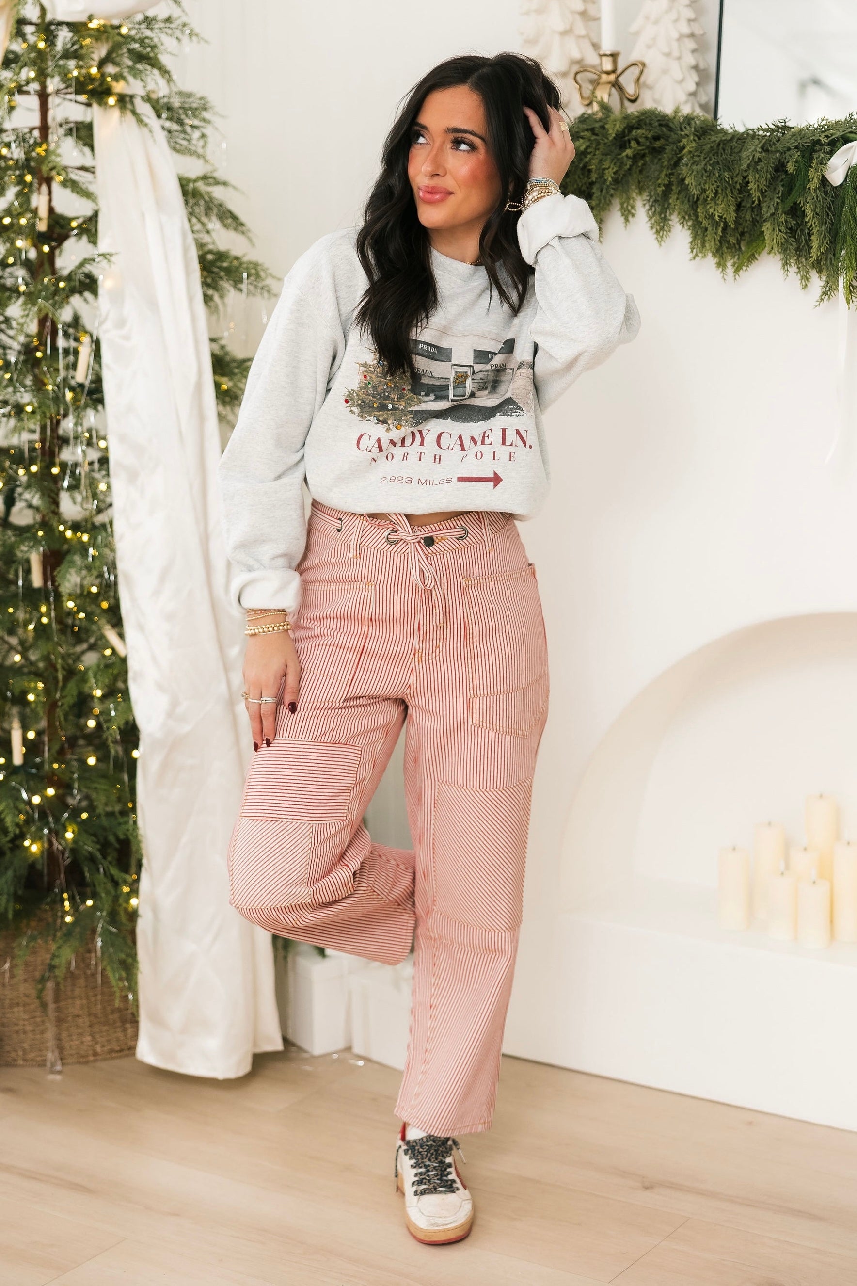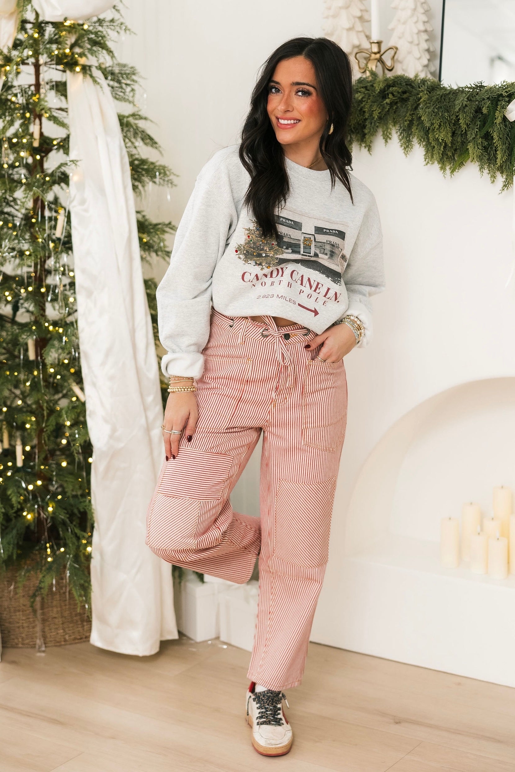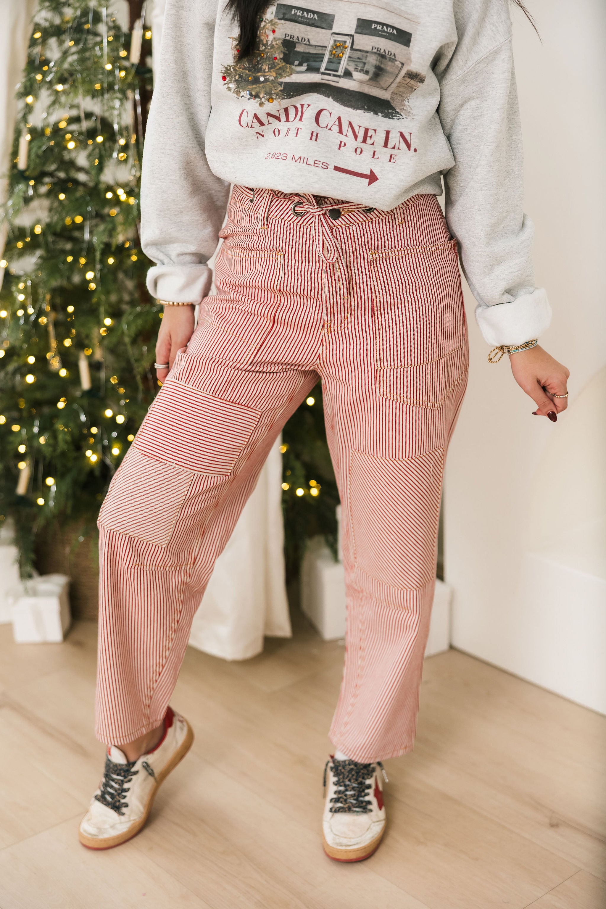 Make a statement in the Vintage Barrel Jeans in Red Stripes — a playful twist on a classic denim look. Designed with a relaxed, loose fit and bold striped pattern, these jeans bring a fun retro vibe to your everyday style. Sage is wearing a small.