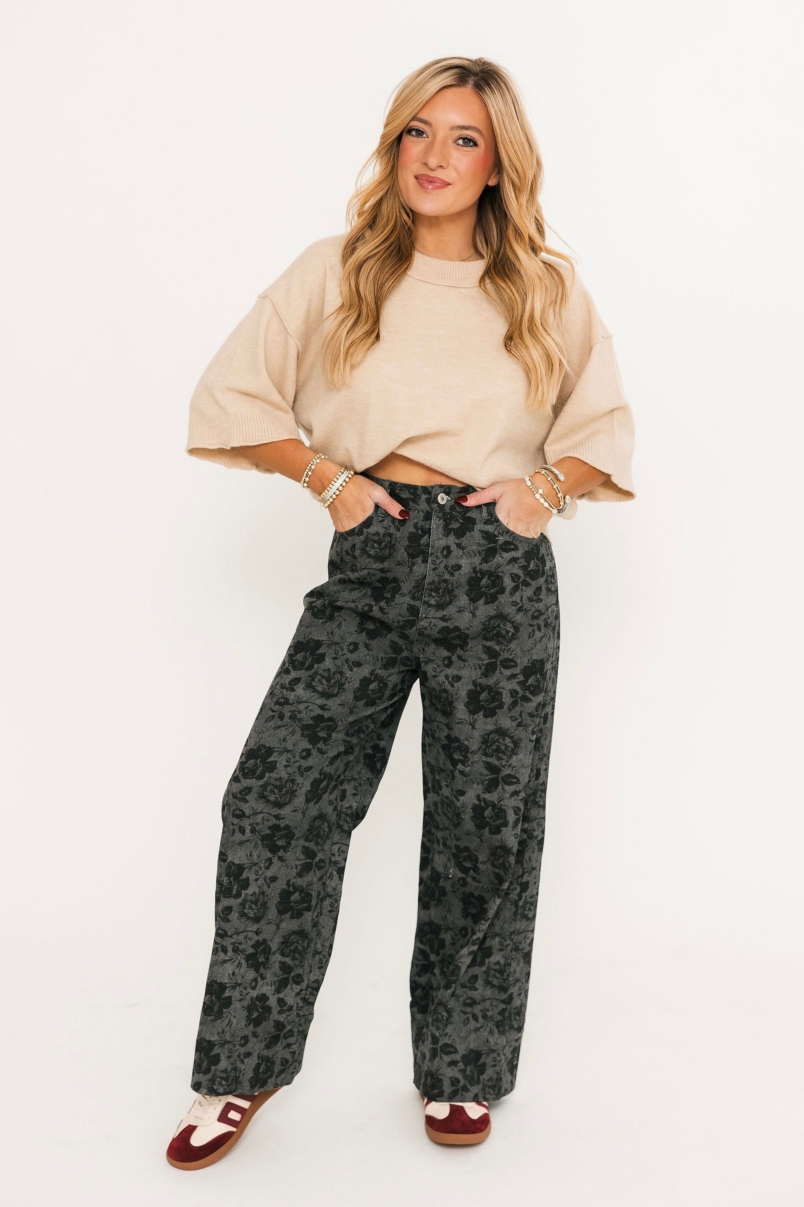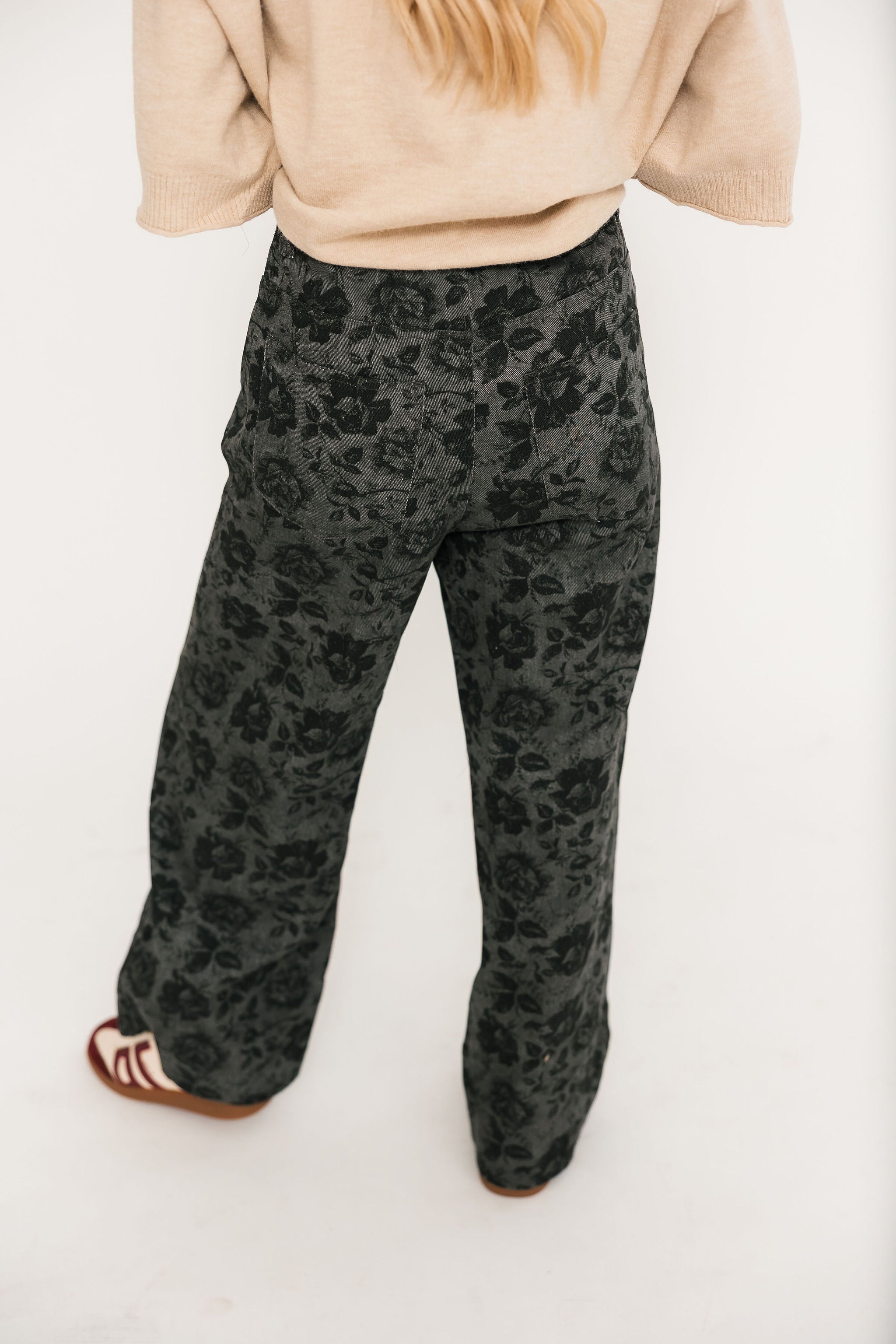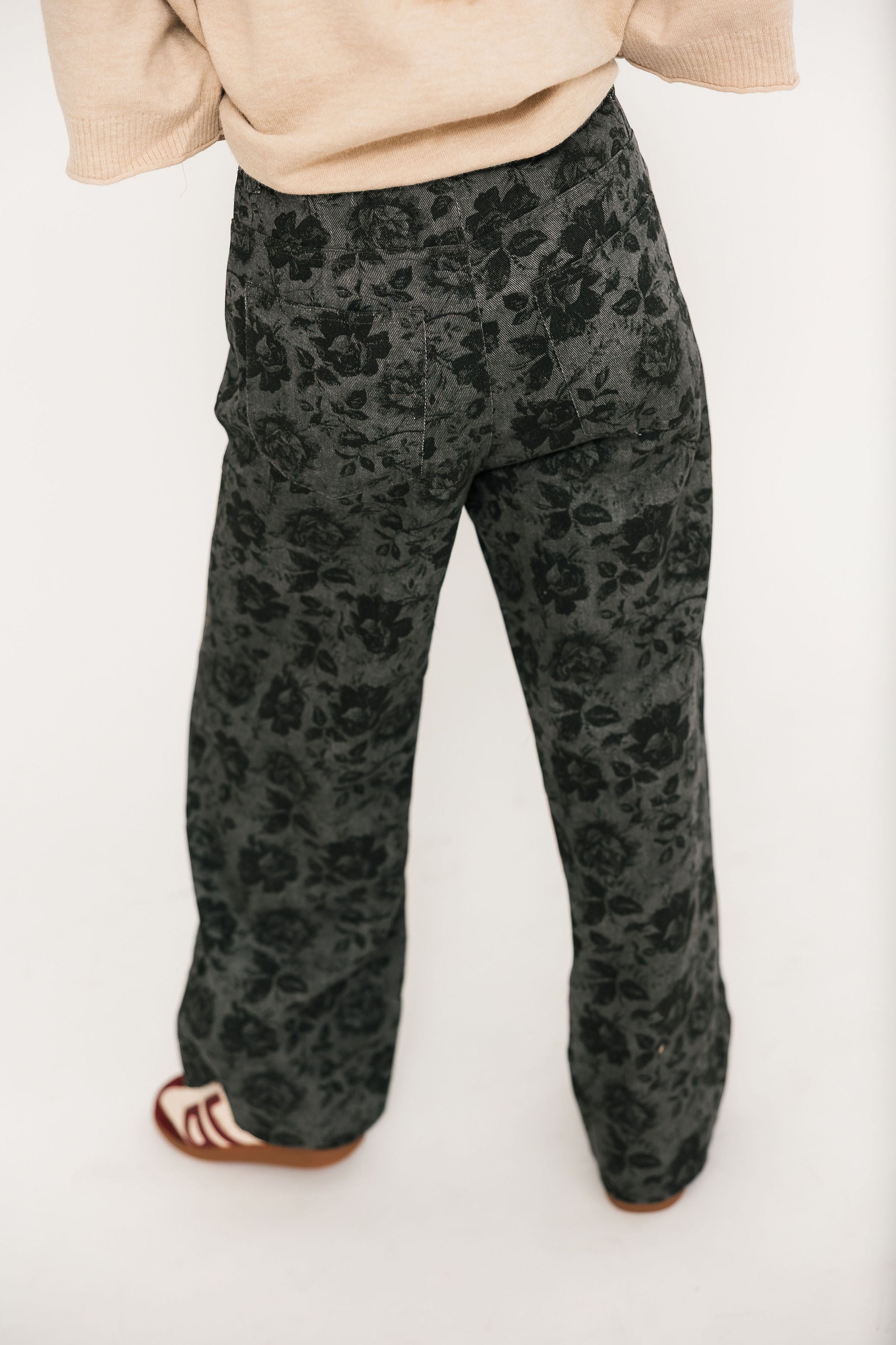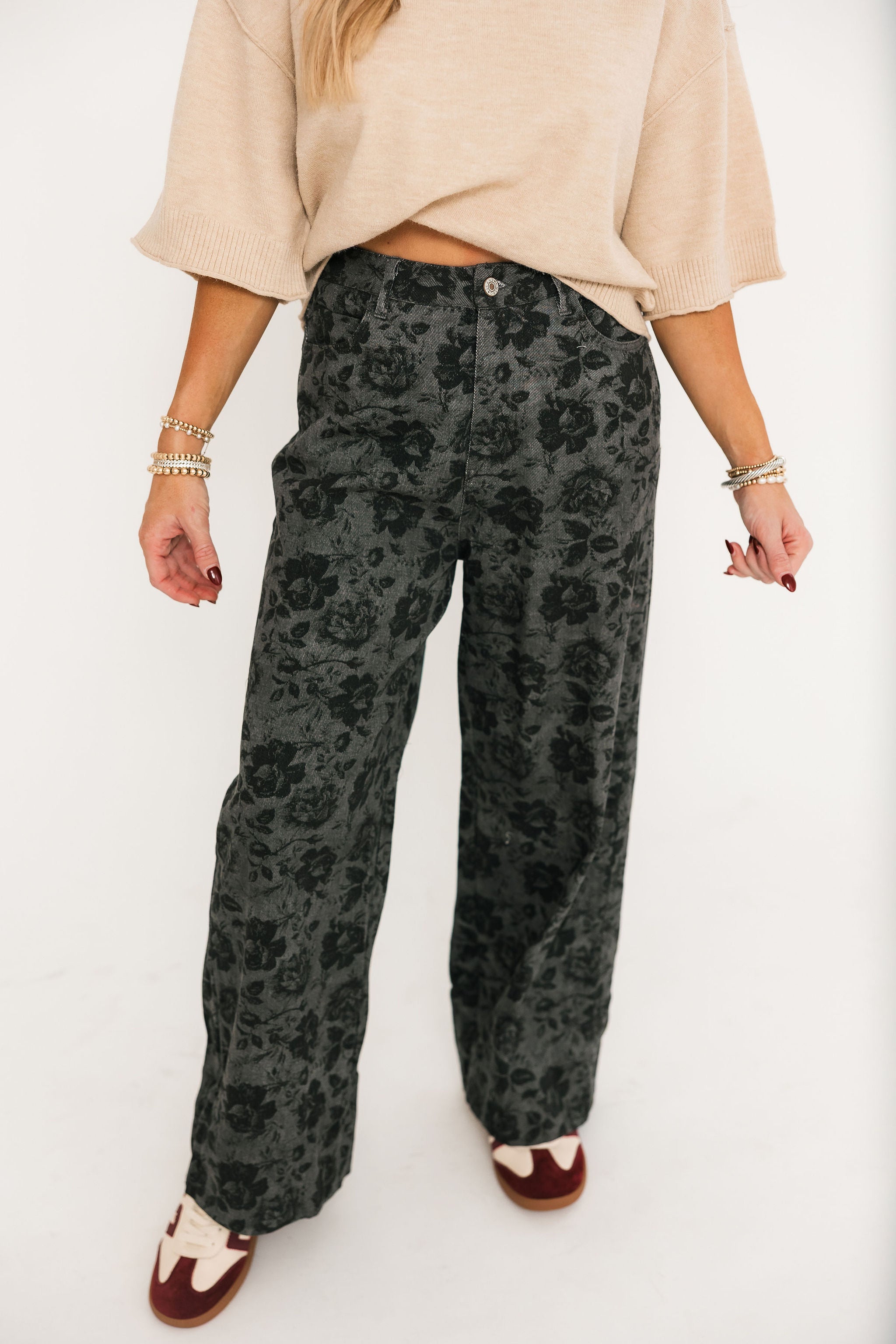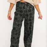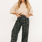 The Vintage Bloom Denim Pant In Charcoal blends everyday ease with standout detail. Designed in a high-waisted, wide-leg silhouette, these ankle-length jeans feature an allover floral print that adds a playful yet vintage-inspired touch. The button fly with zipper closure keeps the look classic, while functional side pockets and back patch pockets make them as practical as they are stylish. Perfect for dressing up with a blouse and heels or keeping it casual with your favorite tee. Lexi is wearing a small.