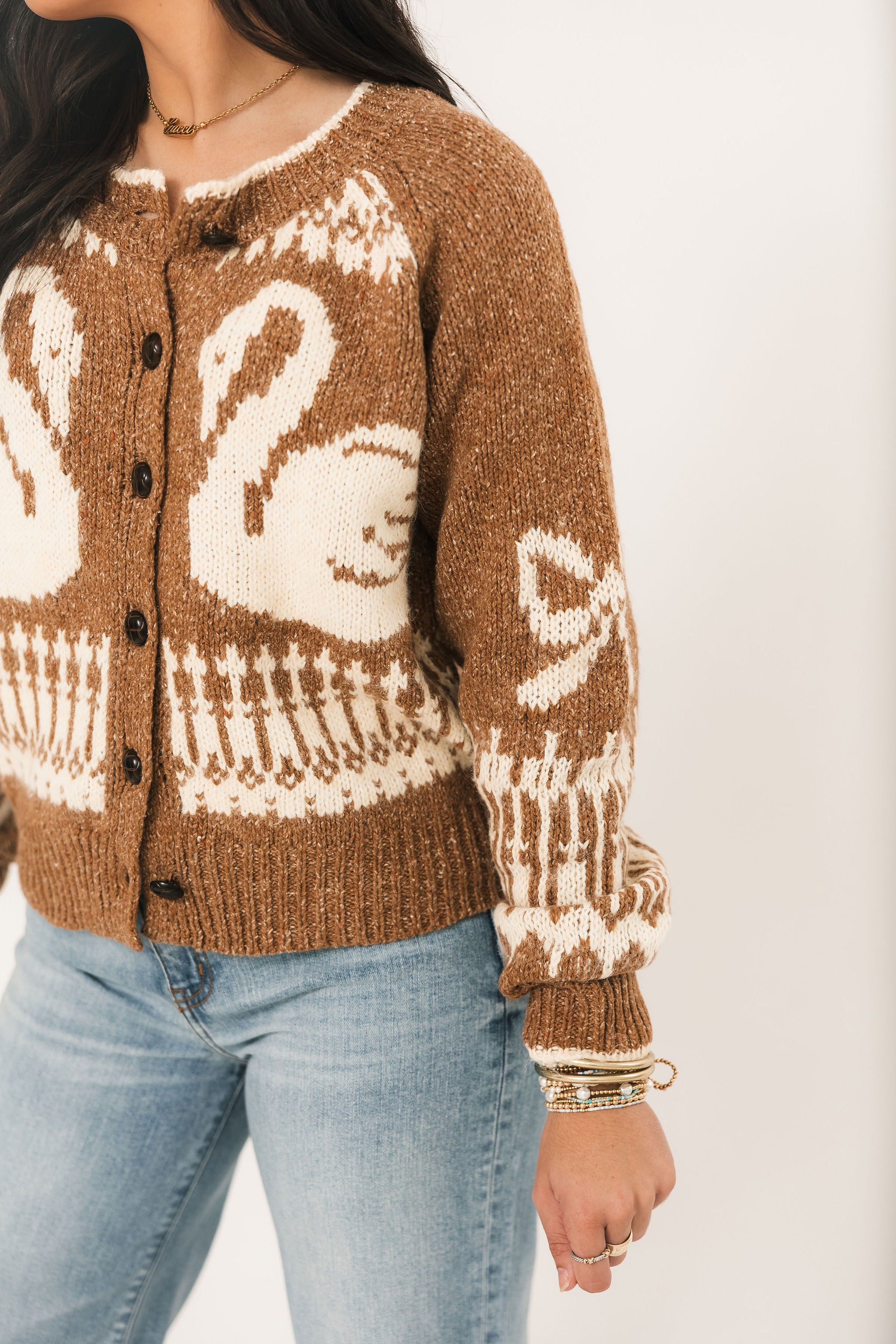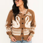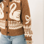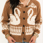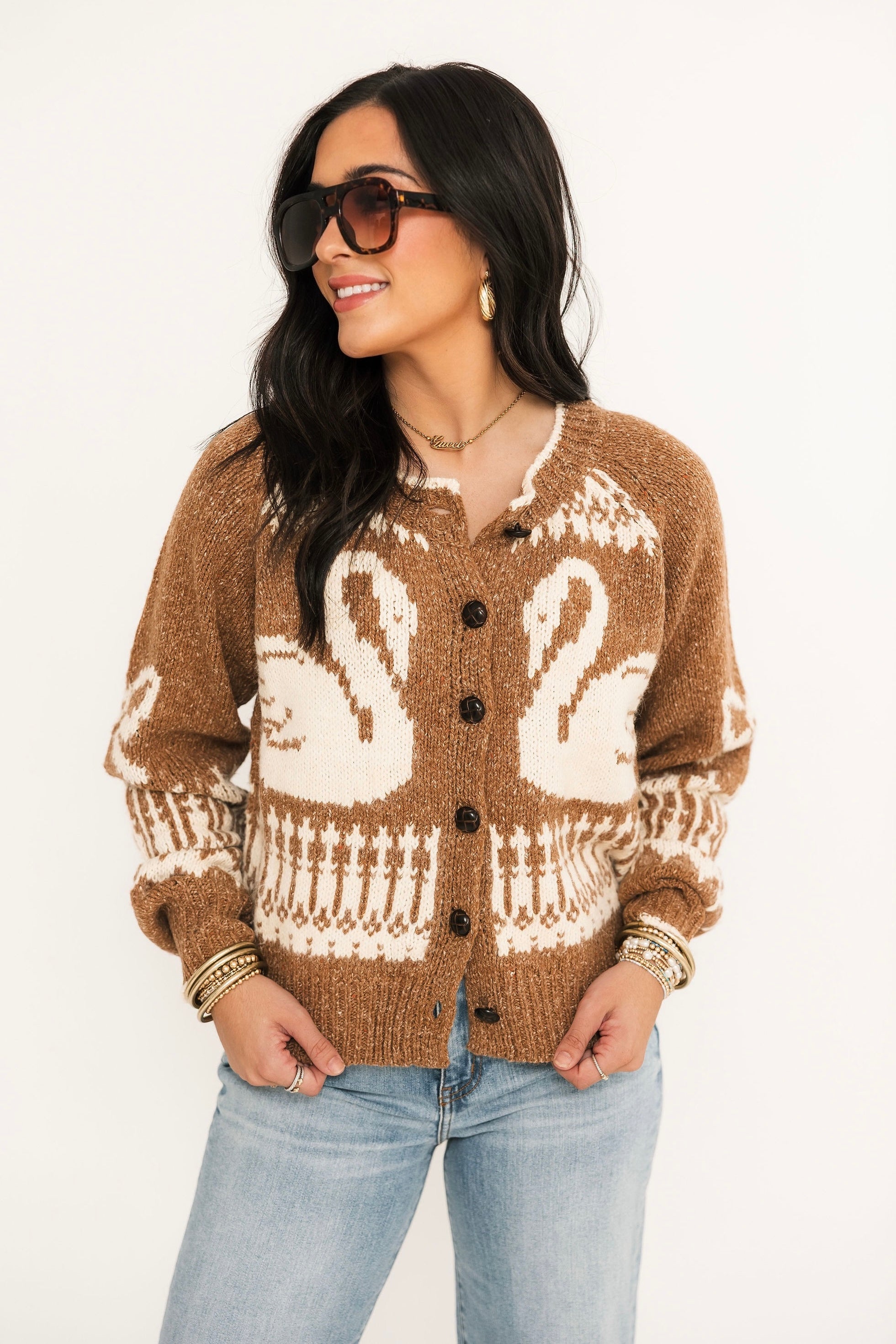 The Vintage Love Cardigan Swan is designed in a relaxed fit with a round neckline, functional button-up front, and long sleeves. Finished with graceful swan graphics, this cozy knit strikes the perfect balance between playful and classic. A versatile piece that adds a touch of whimsy and warmth to any outfit. Sage is wearing a small.