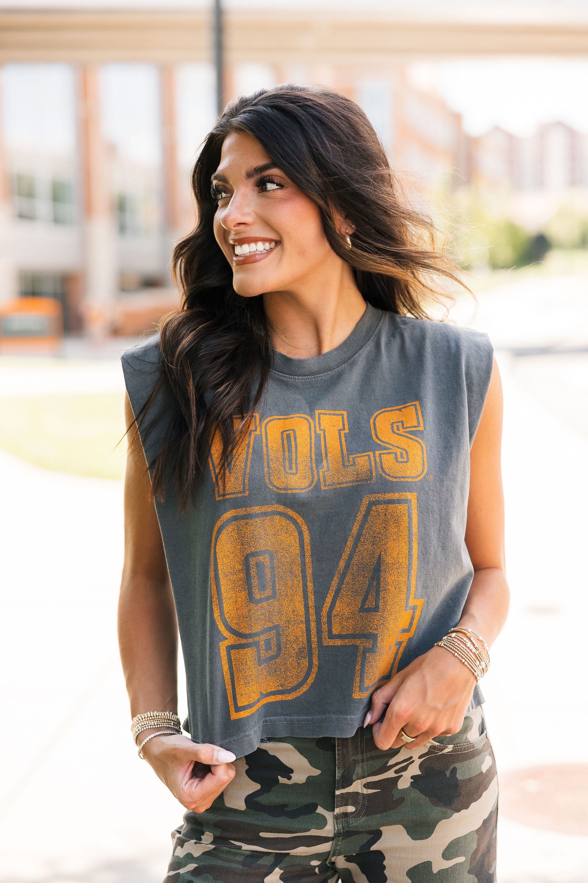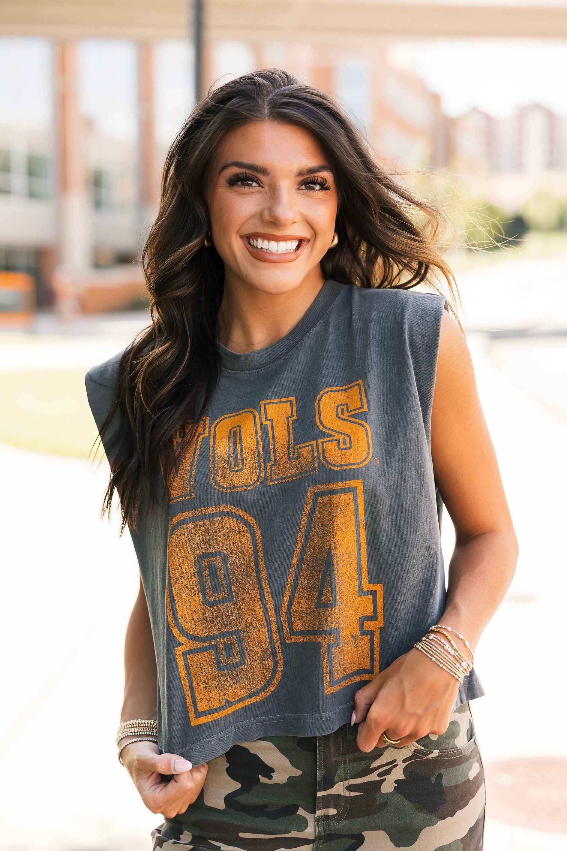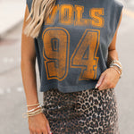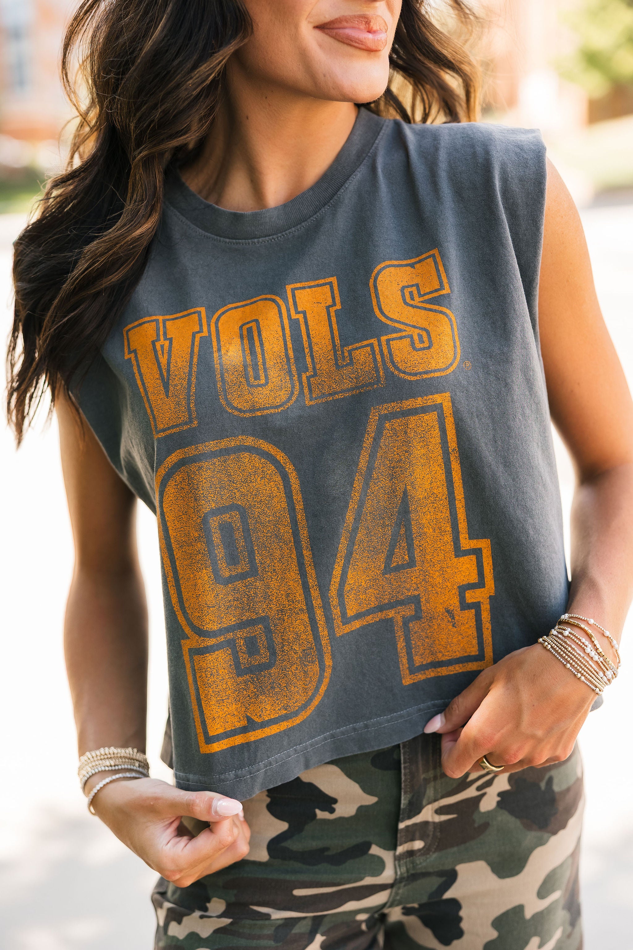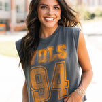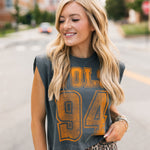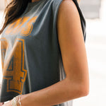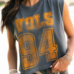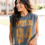 Keep it cool and classic with the Vols 94 Charcoal Tank. Featuring a relaxed, boxy fit and muscle tank cut, this sleeveless staple brings vintage vibes with modern edge. Perfect for sunny game days or laid-back weekends repping your team. Lexi is wearing a small. Harli is wearing a medium.