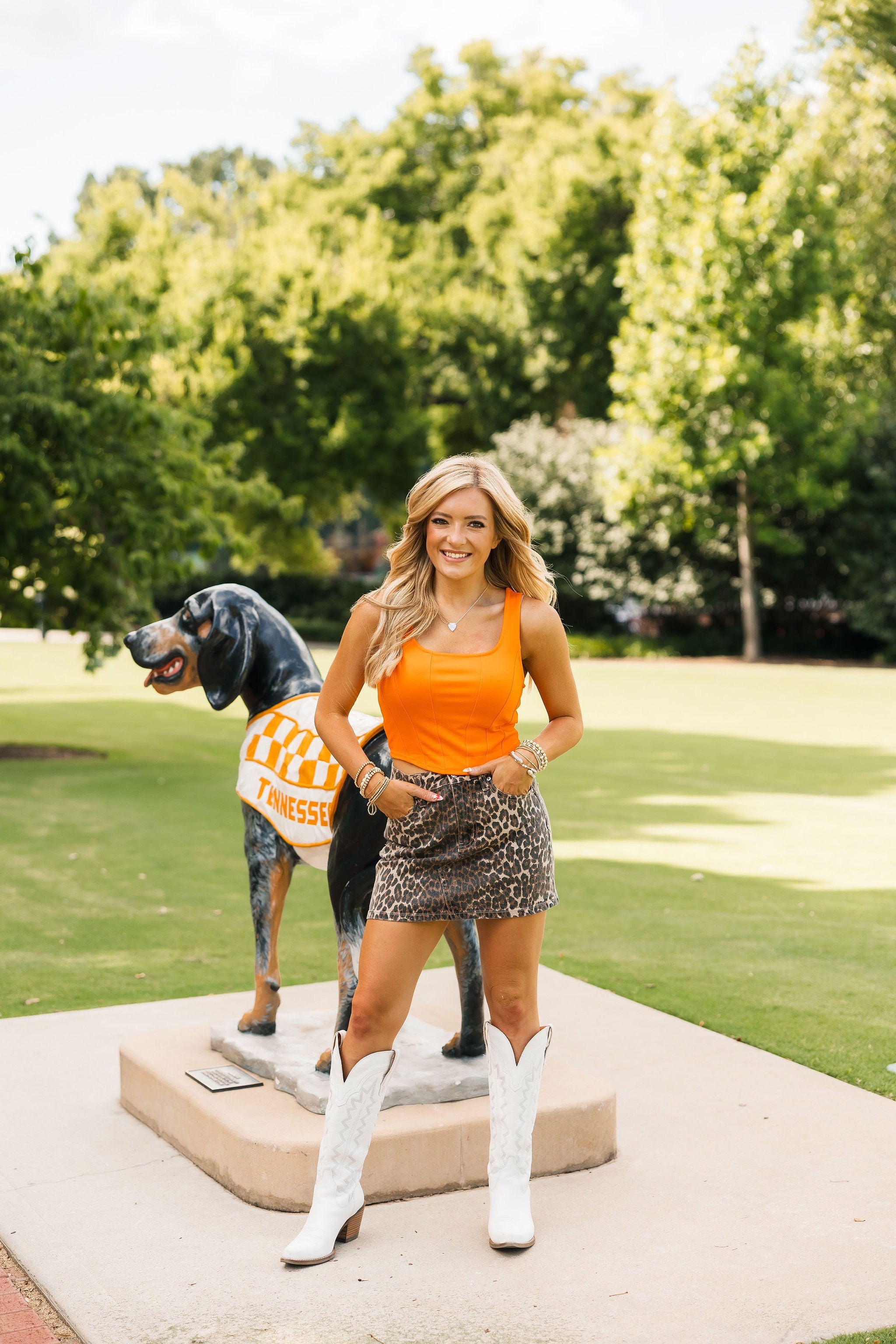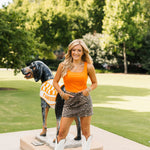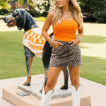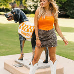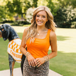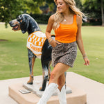 Bring bold energy to your game day look with the Vols Club Top in Orange. This fitted, sleeveless top features a flattering scoop-square neckline, corset-inspired seams, and a cropped cut that’s perfect for pairing with high-waisted denim or a mini skirt. Vibrant and spirited, it’s the ultimate Vols statement piece. Lexi is wearing a small.