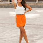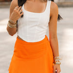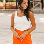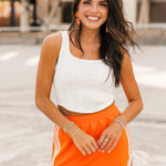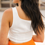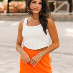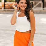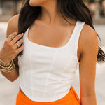 Bring a little edge to your game day lineup with the Vols Club Top in White. This fitted, sleeveless top features a flattering scoop-square neckline, corset-inspired seams, and a cropped cut that pairs perfectly with high-waisted denim or a mini skirt. Clean, crisp, and full of Vols energy—this top is made to turn heads from kickoff to postgame. Sage is wearing a small. Harli is wearing a medium.
