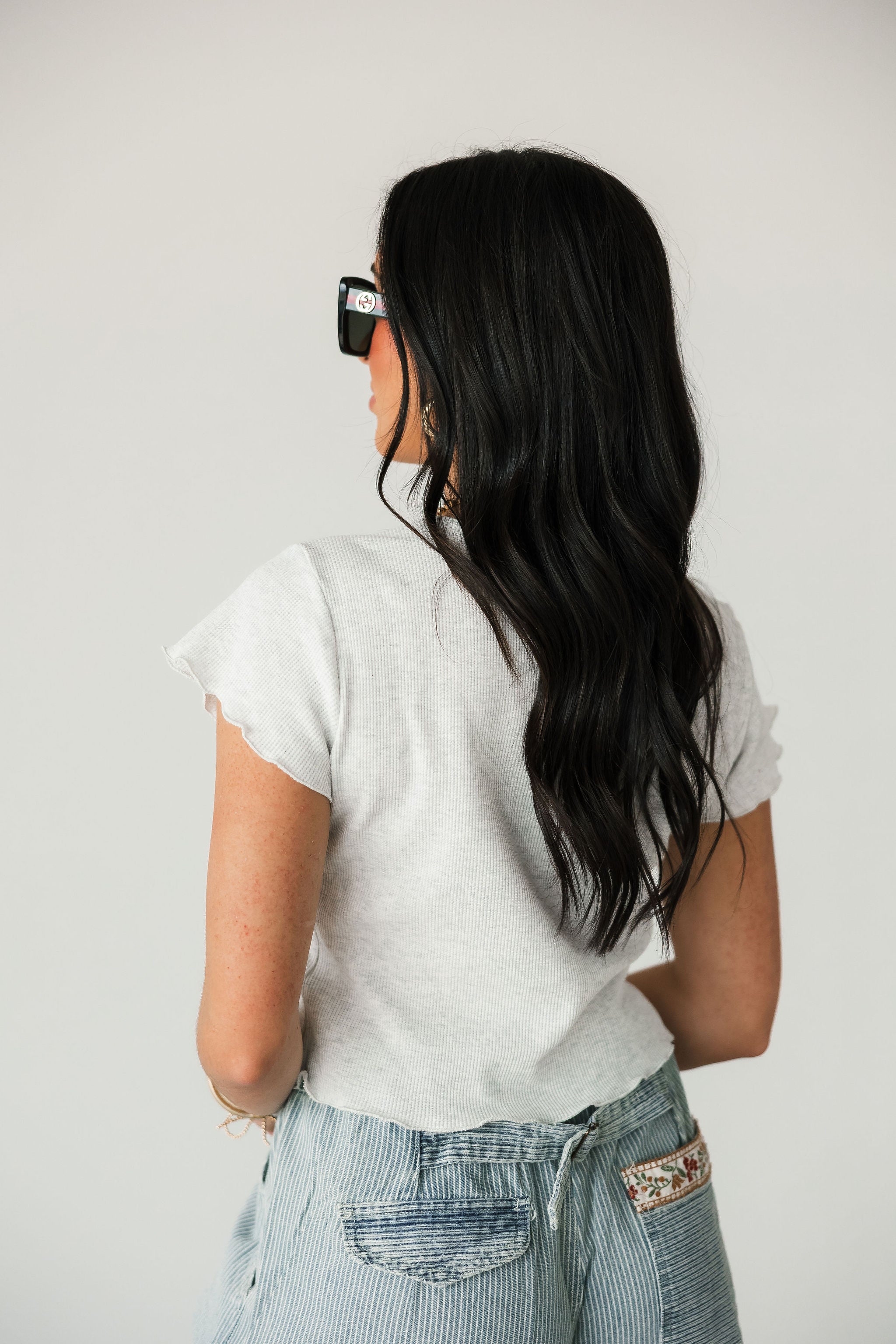 The Waffle Baby Tee in Heather Gray is a relaxed, cropped essential with the softest waffle texture. Designed with a classic crew neckline, short sleeves, and sweet lettuce-hem detailing, it adds just the right amount of charm to a simple silhouette. Lightweight, comfy, and endlessly versatile — it’s the kind of tee you’ll want in every color. Sage is wearing a small.