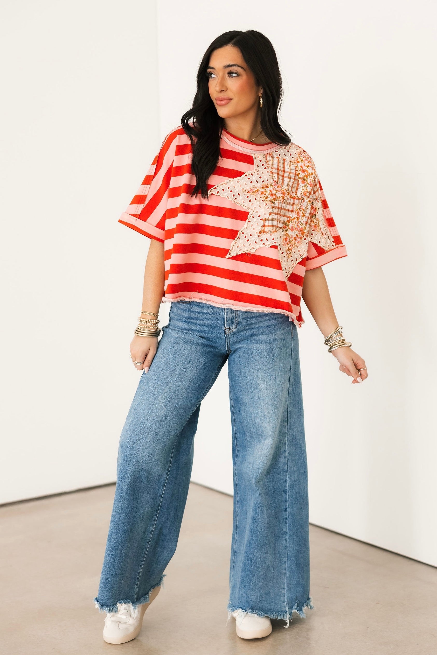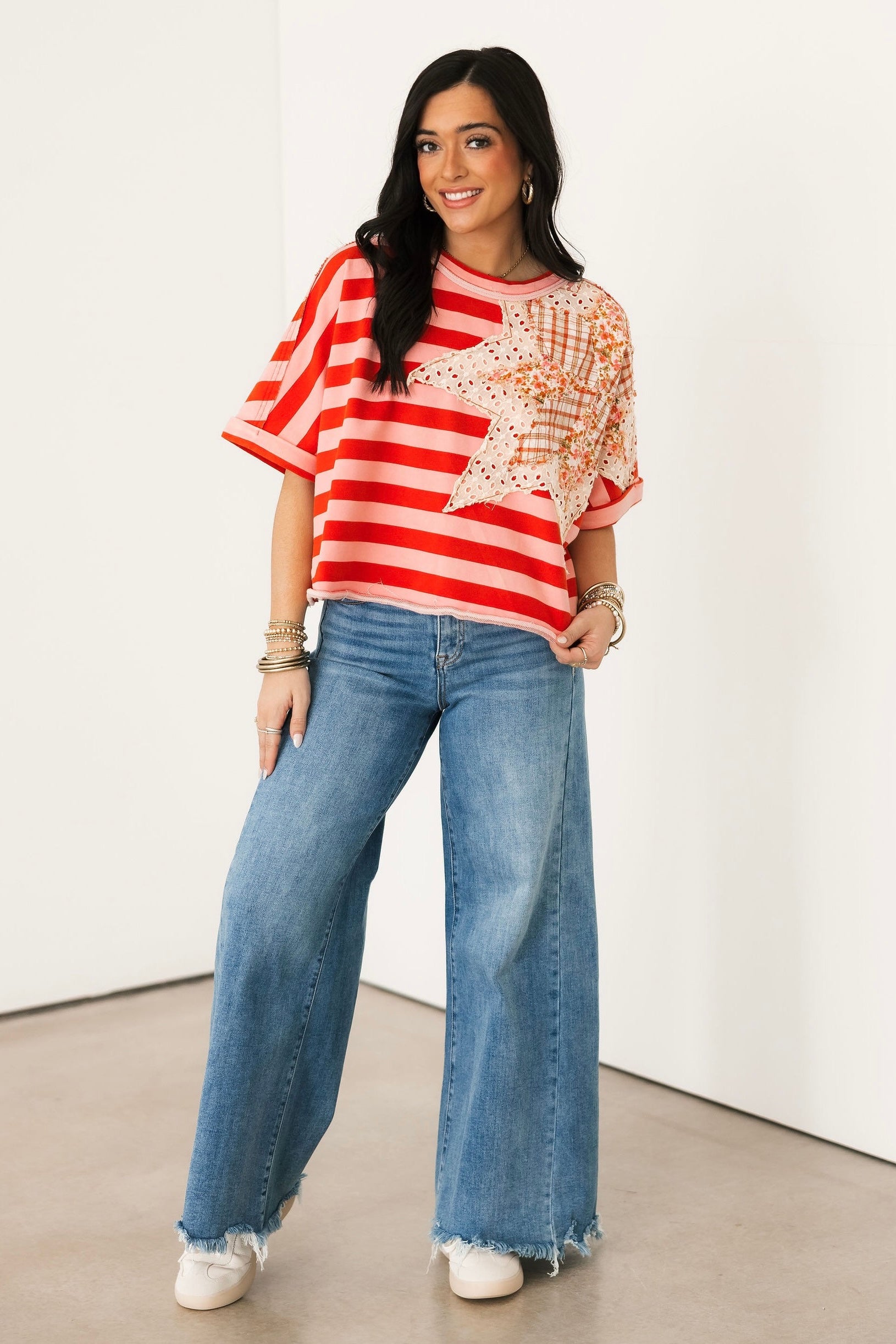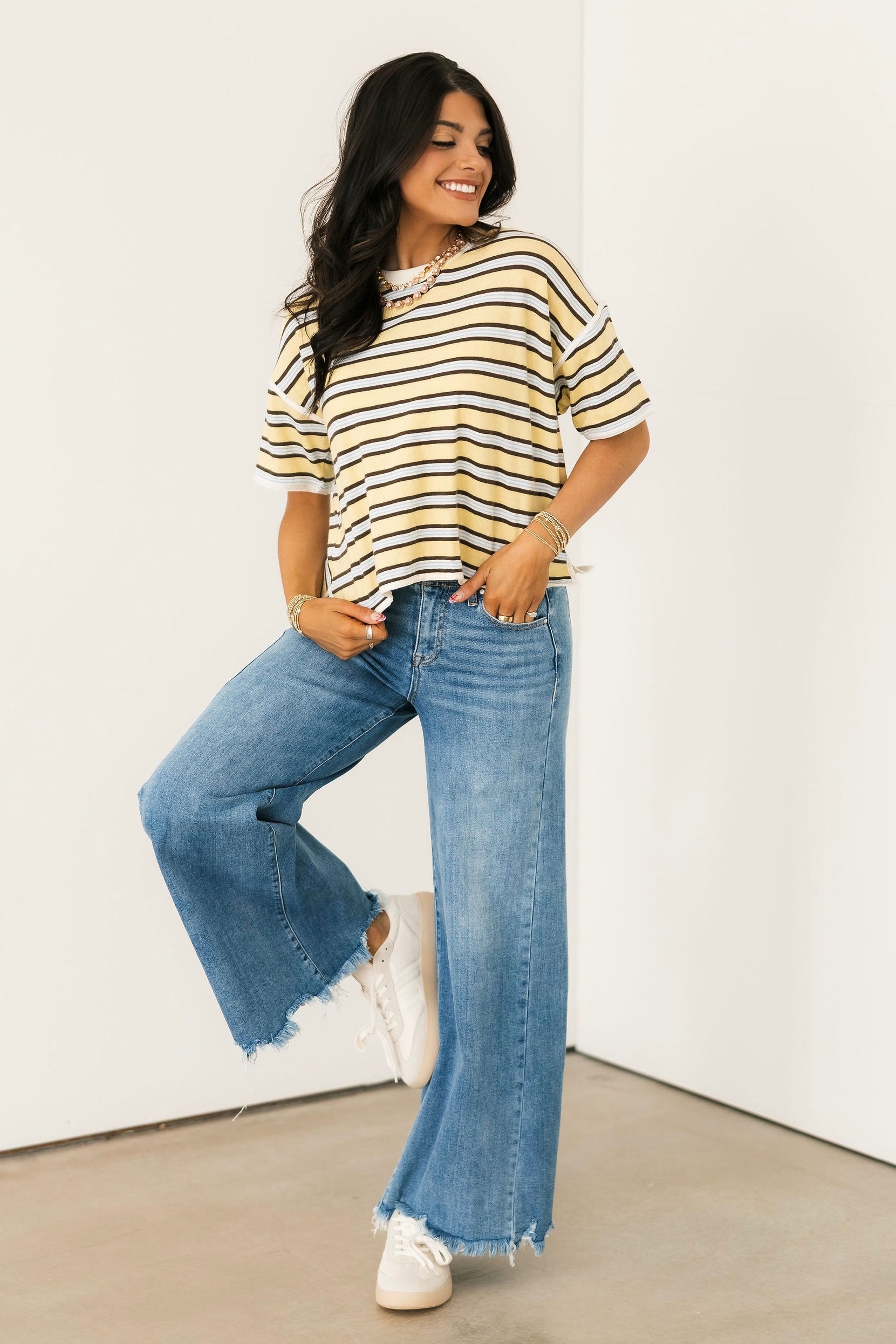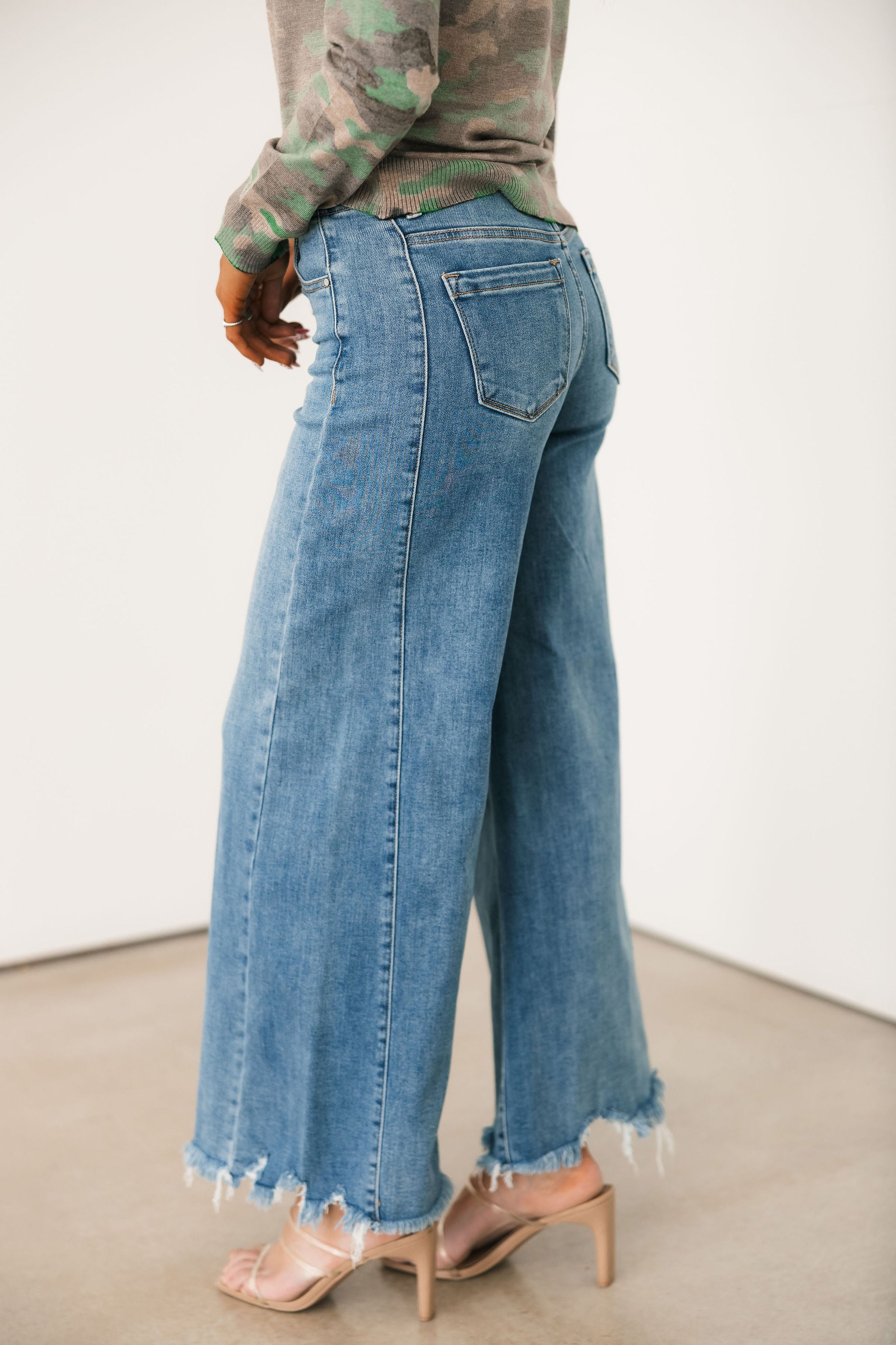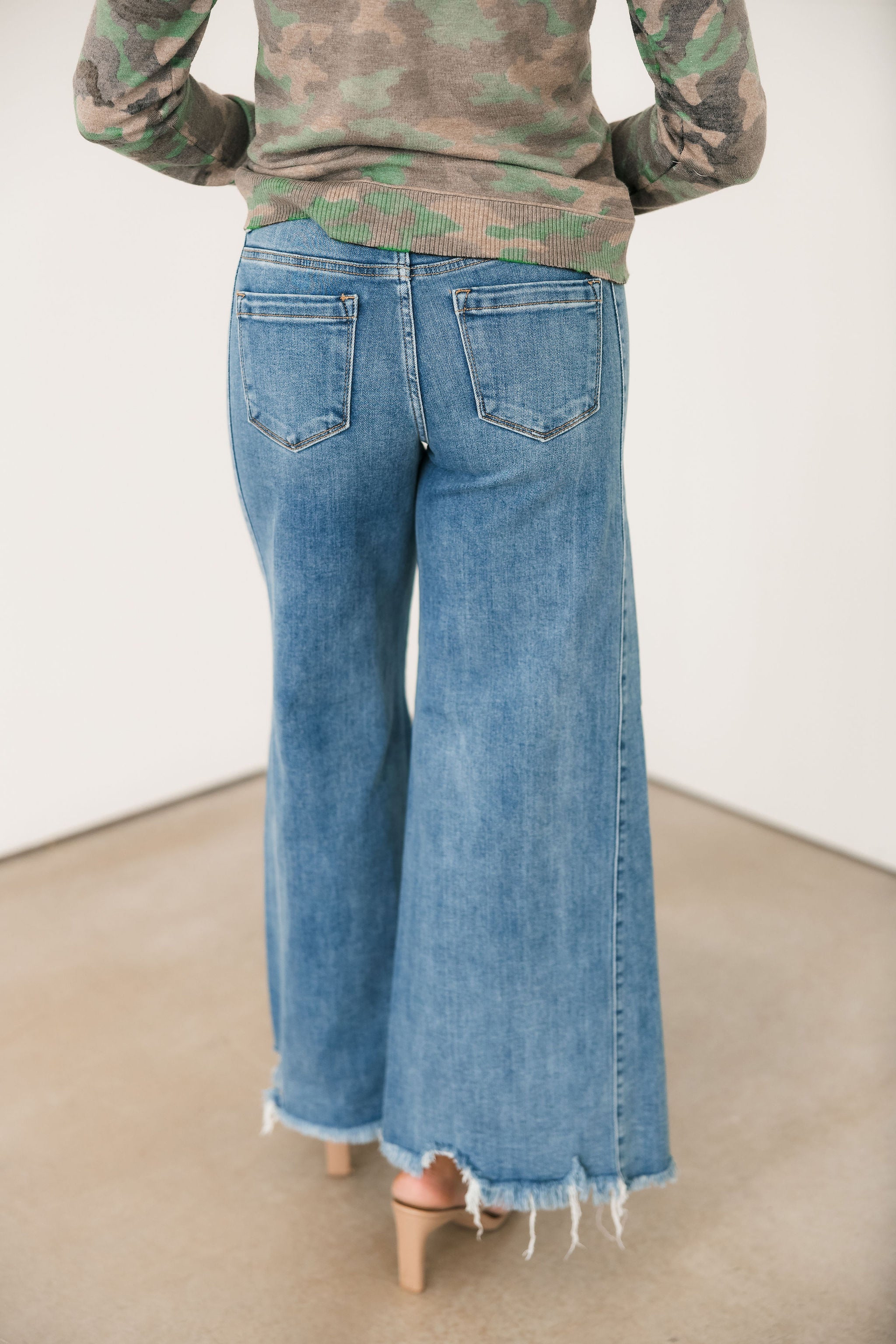 The Wait A Minute Wide Leg Jeans feature a classic dark wash with a wide ankle silhouette and a distressed hem. They’re comfy enough for all-day wear with plenty of stretch and a high waisted fit, but polished enough to dress up, making them a go-to for just about any plan on your calendar. Perfect for teachers who need to stay comfortable while still looking put-together, easy to style for a casual day of errands, and cute enough to dress up for girls’ night with a fun top and heels.