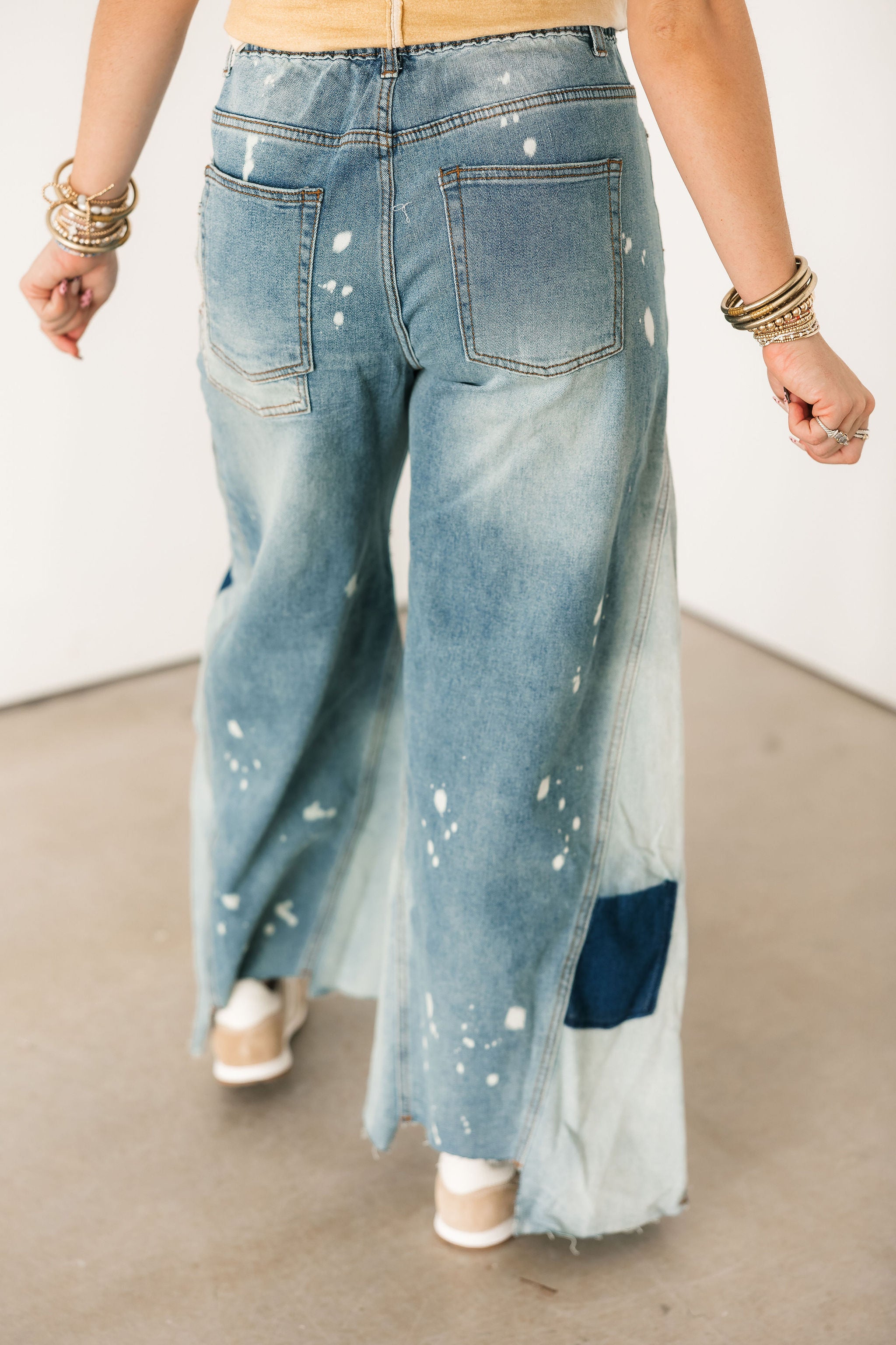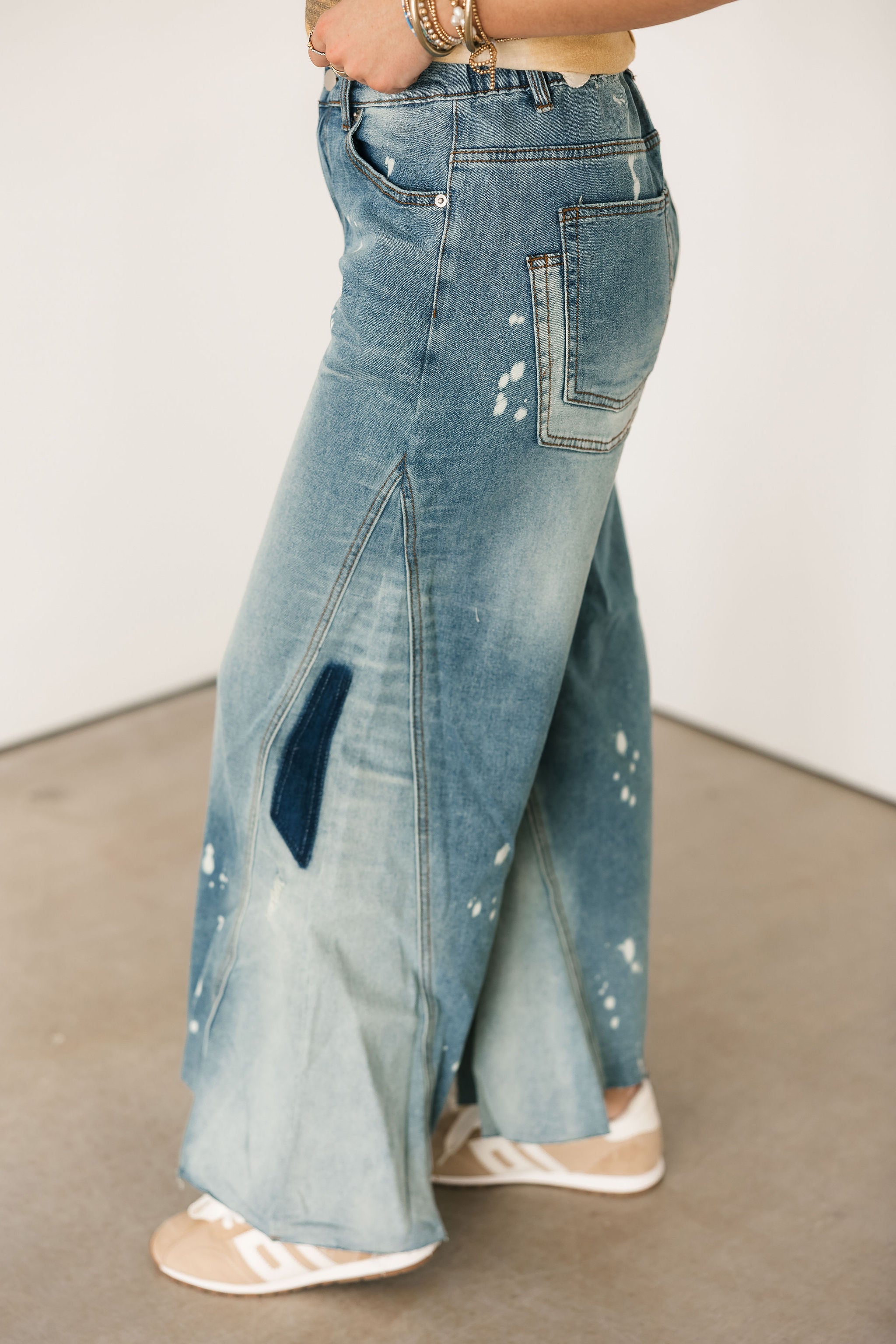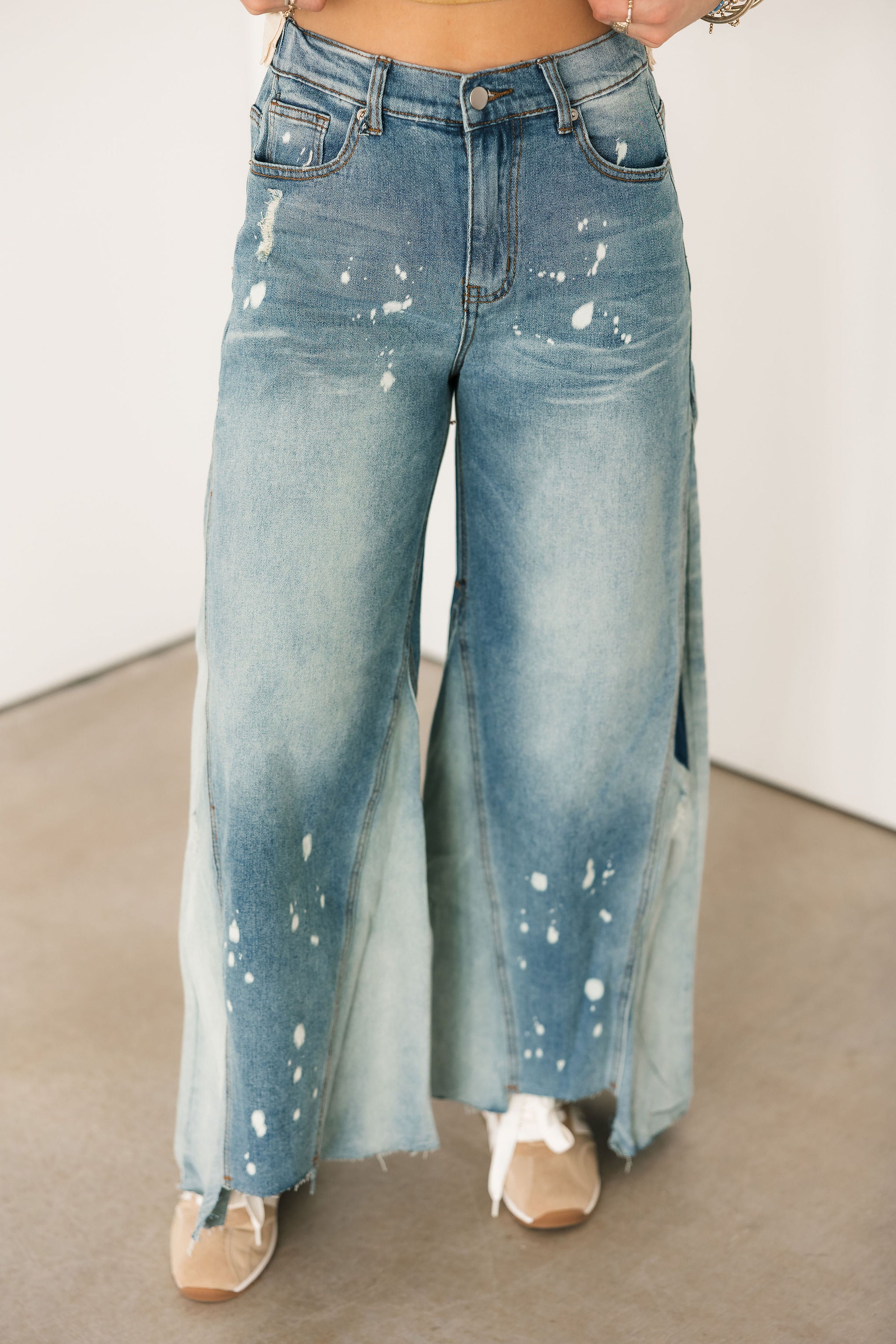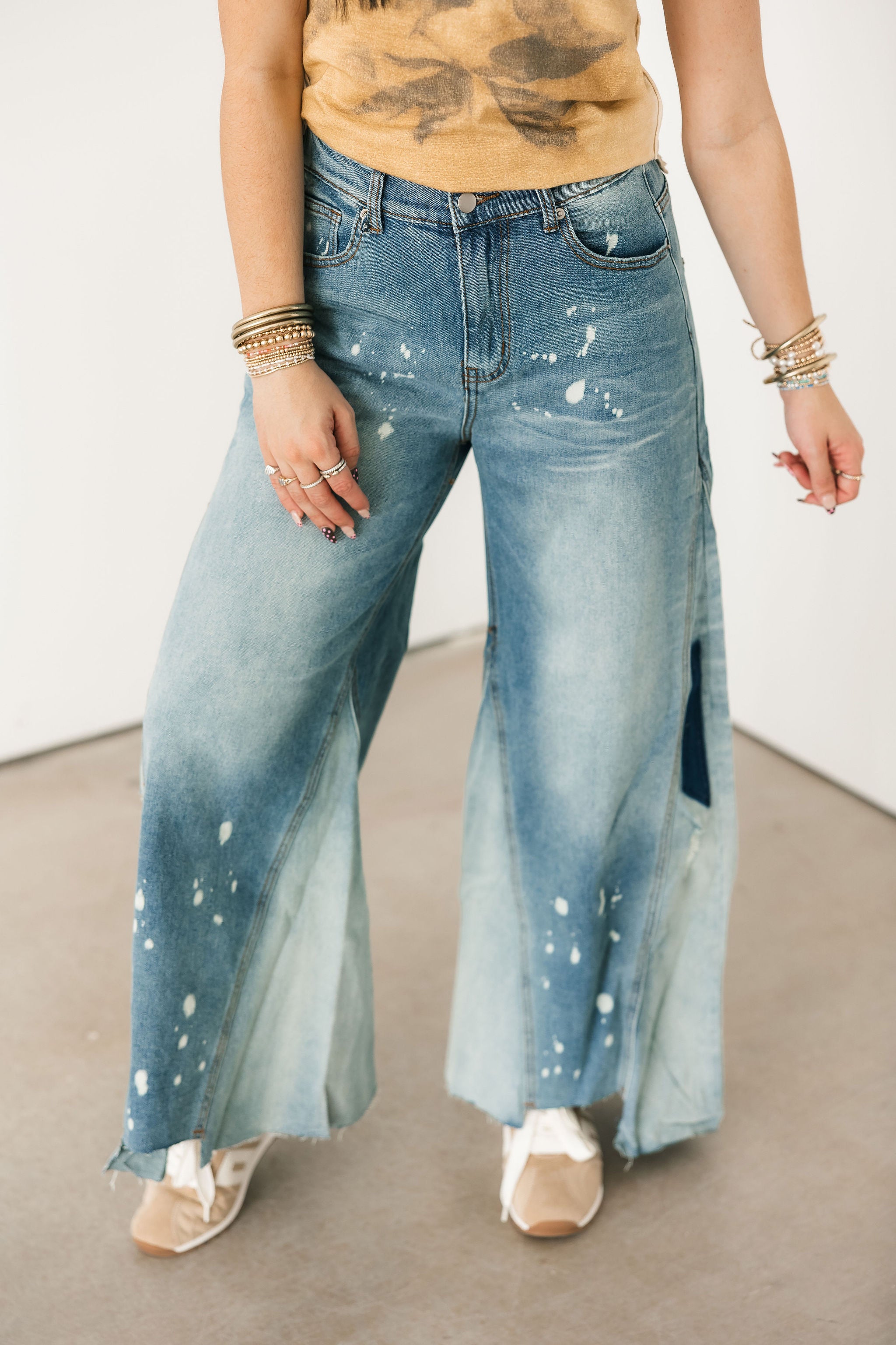 Edgy yet effortless, these jeans bring the perfect lived-in vibe with their mineral washed and bleached detailing. The unique finish gives them that cool, standout look while still being easy to style. Designed true to size with a relaxed fit, they feature a flattering high-rise waist and a wide leg silhouette that elongates and adds a modern touch. Pair them with a fitted tank, oversized tee, or cropped knit for an effortlessly styled outfit. Sage is wearing a small. ✨