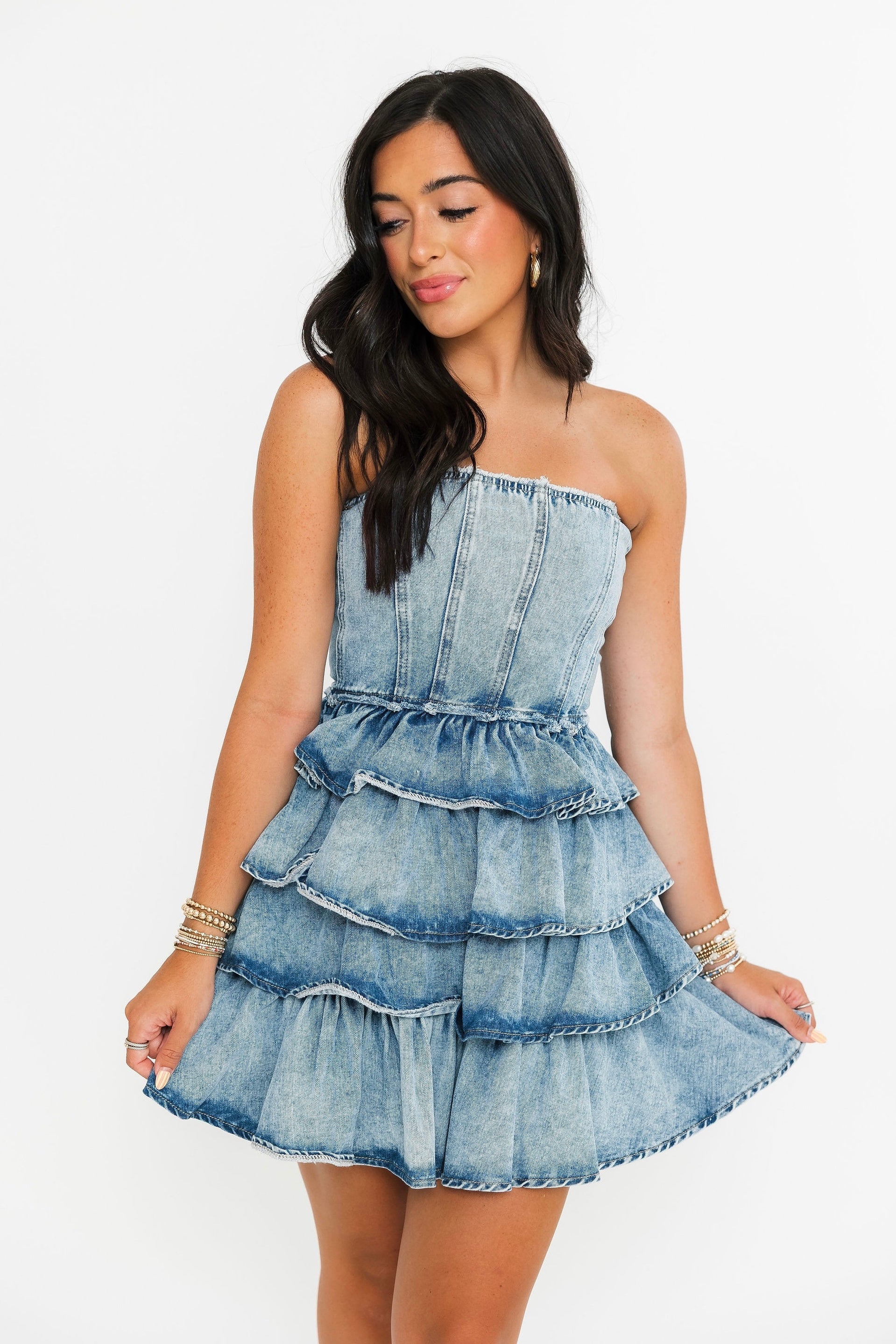 Bring a little edge to your sorority-season wardrobe with the Washed Ruffle Denim Mini. This strapless mini combines the structure of a corset-style bodice with the flirty movement of a ruffled hem, giving you that perfect mix of confidence and charm. The washed denim adds a cool, laid-back vibe while still keeping things polished for rush events or a night out. A secure zipper closure at the back ensures a flawless fit, so you can dance, mingle, and pose for pics without a worry. Sage is wearing a small.