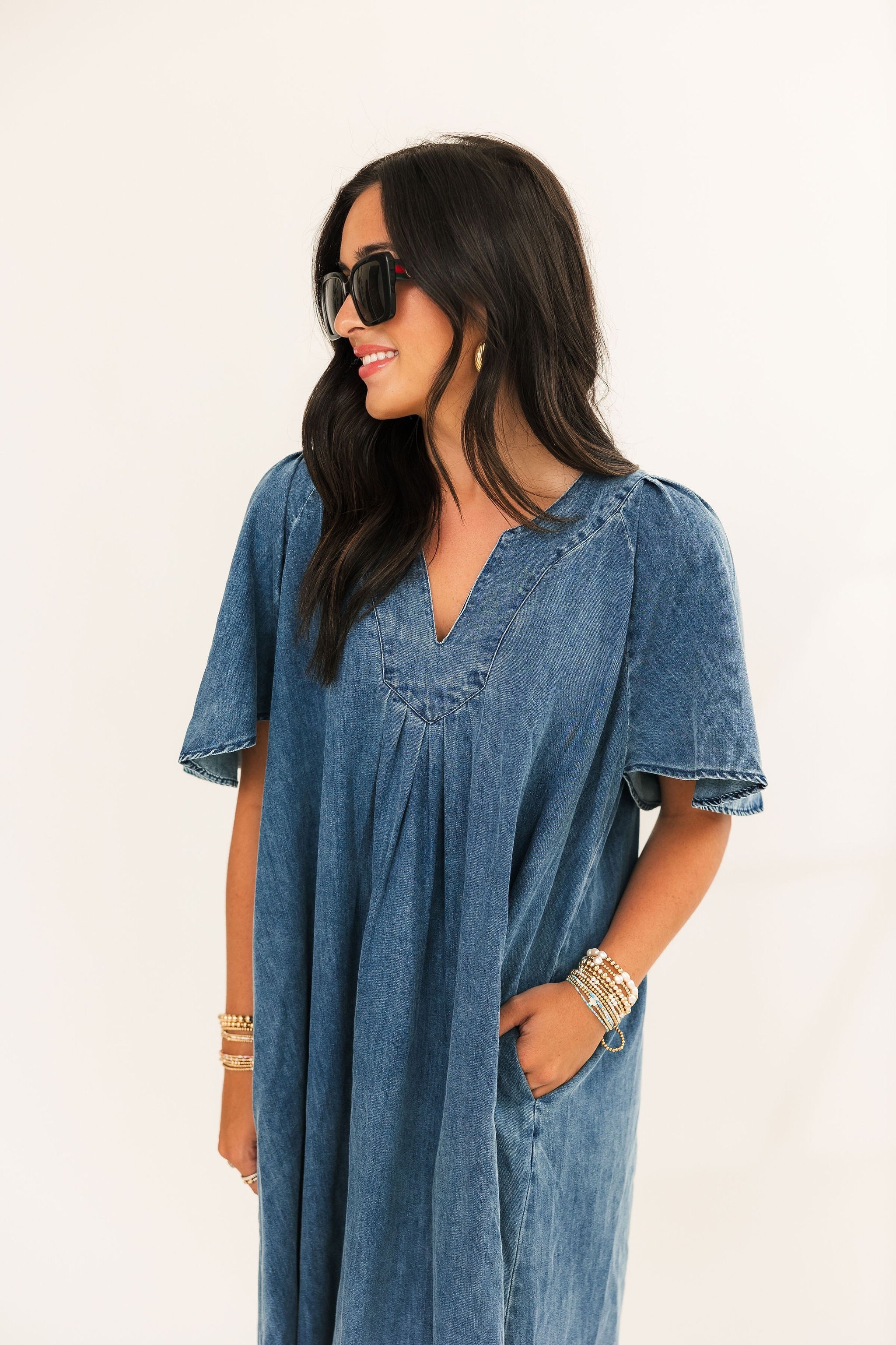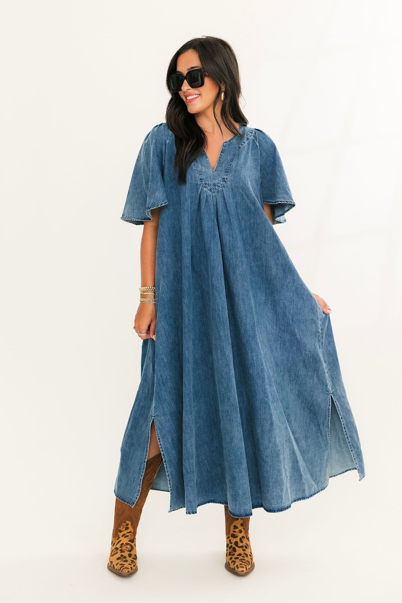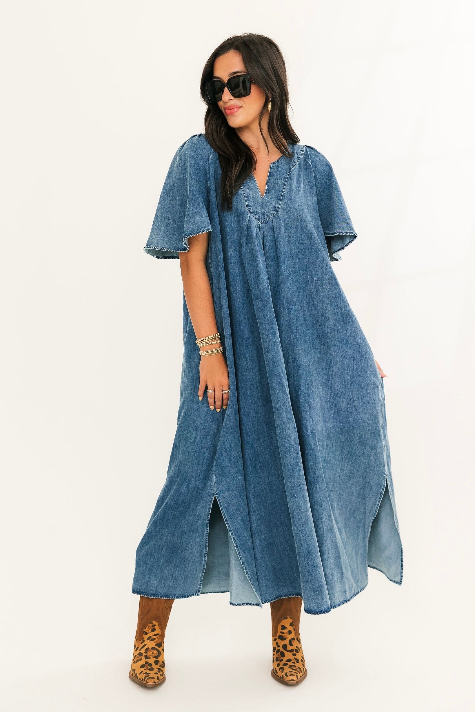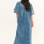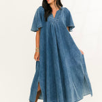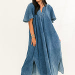 This lightweight denim maxi dress features a flowy, relaxed fit with a flattering V-neckline and short sleeves. Easy to style up or down, it’s the perfect piece for effortless, all-day wear. Pair it with boots, sandals, or sneakers for a versatile look. Sage is wearing a small.
