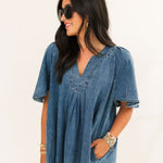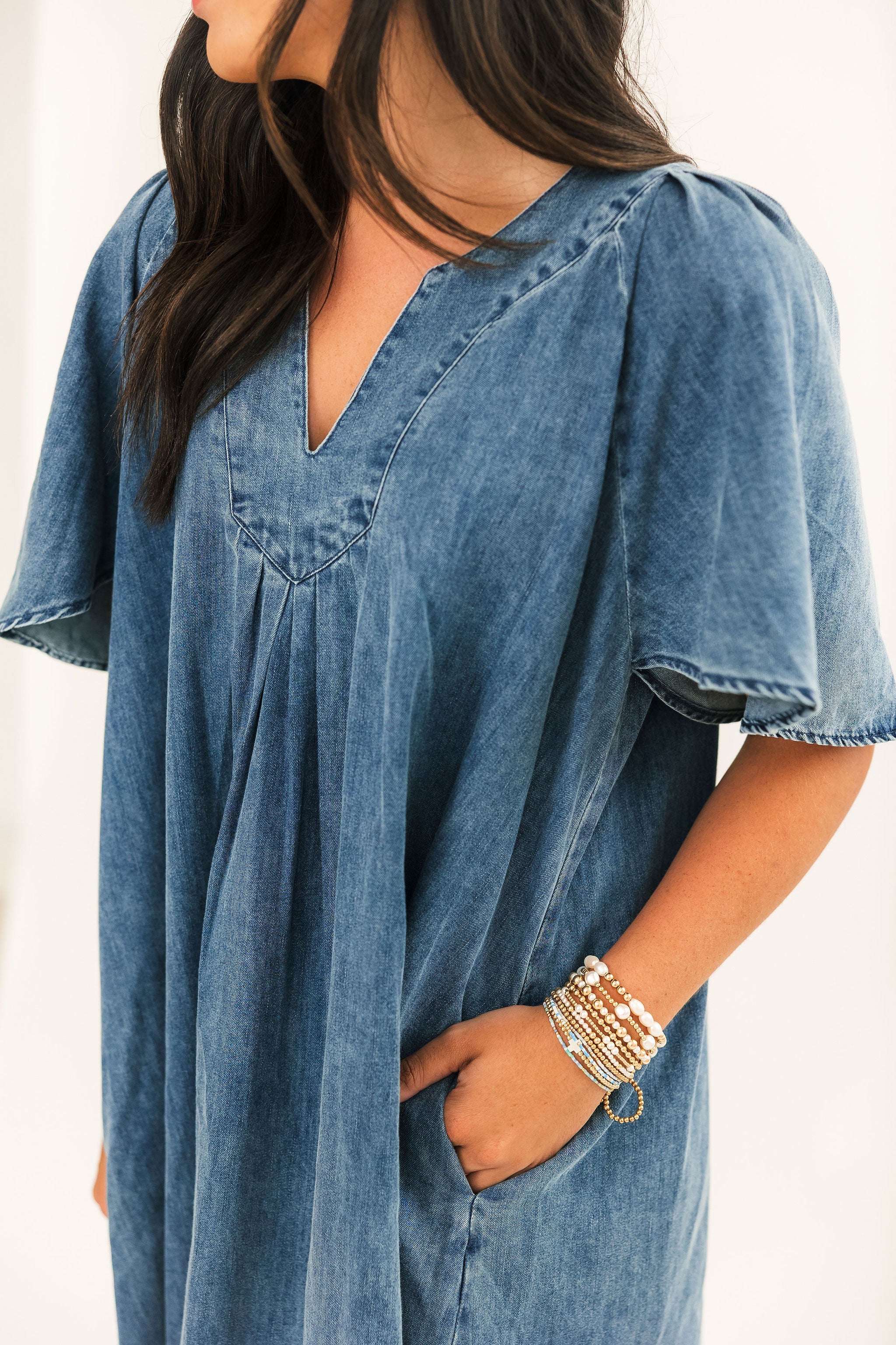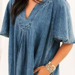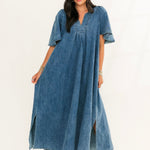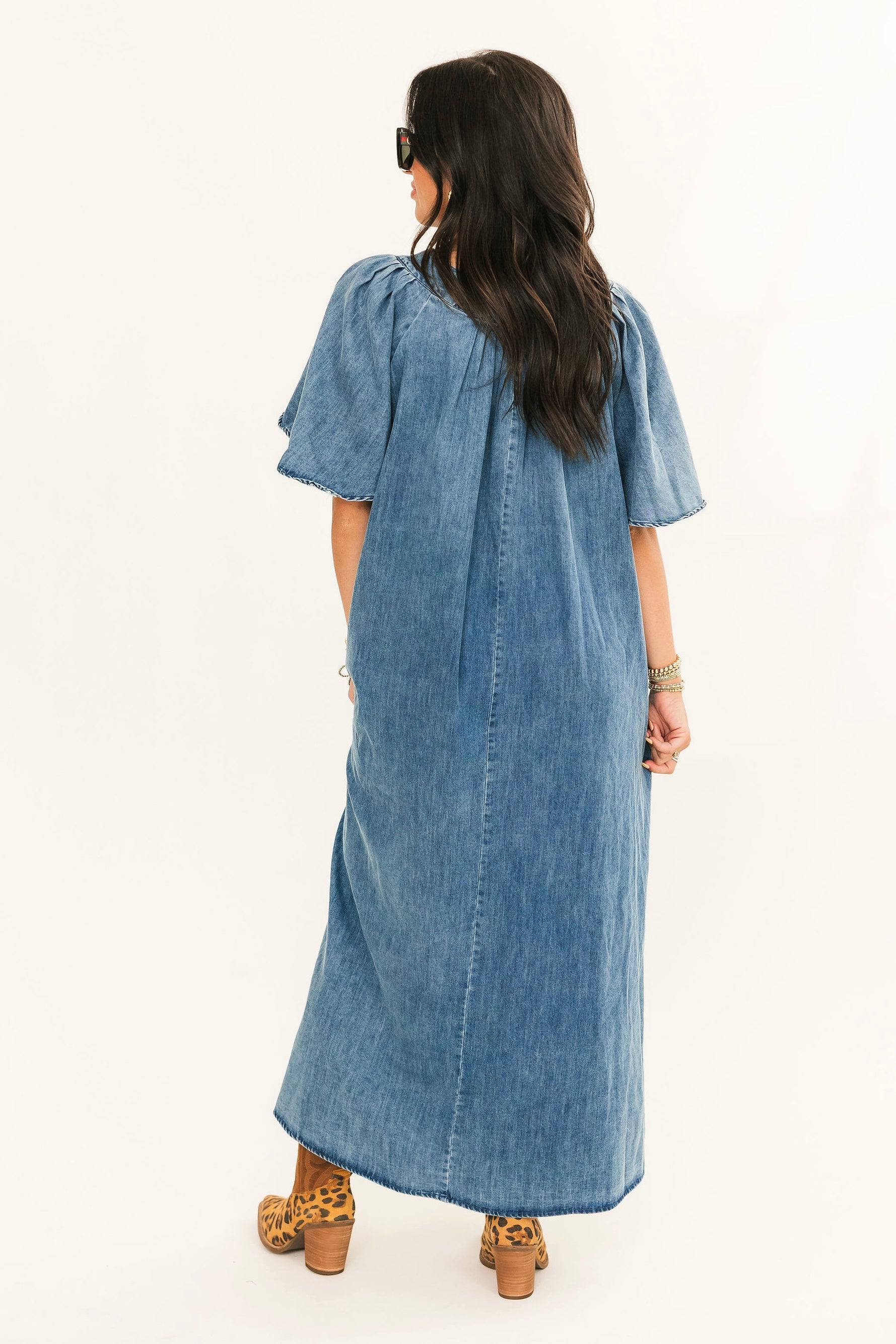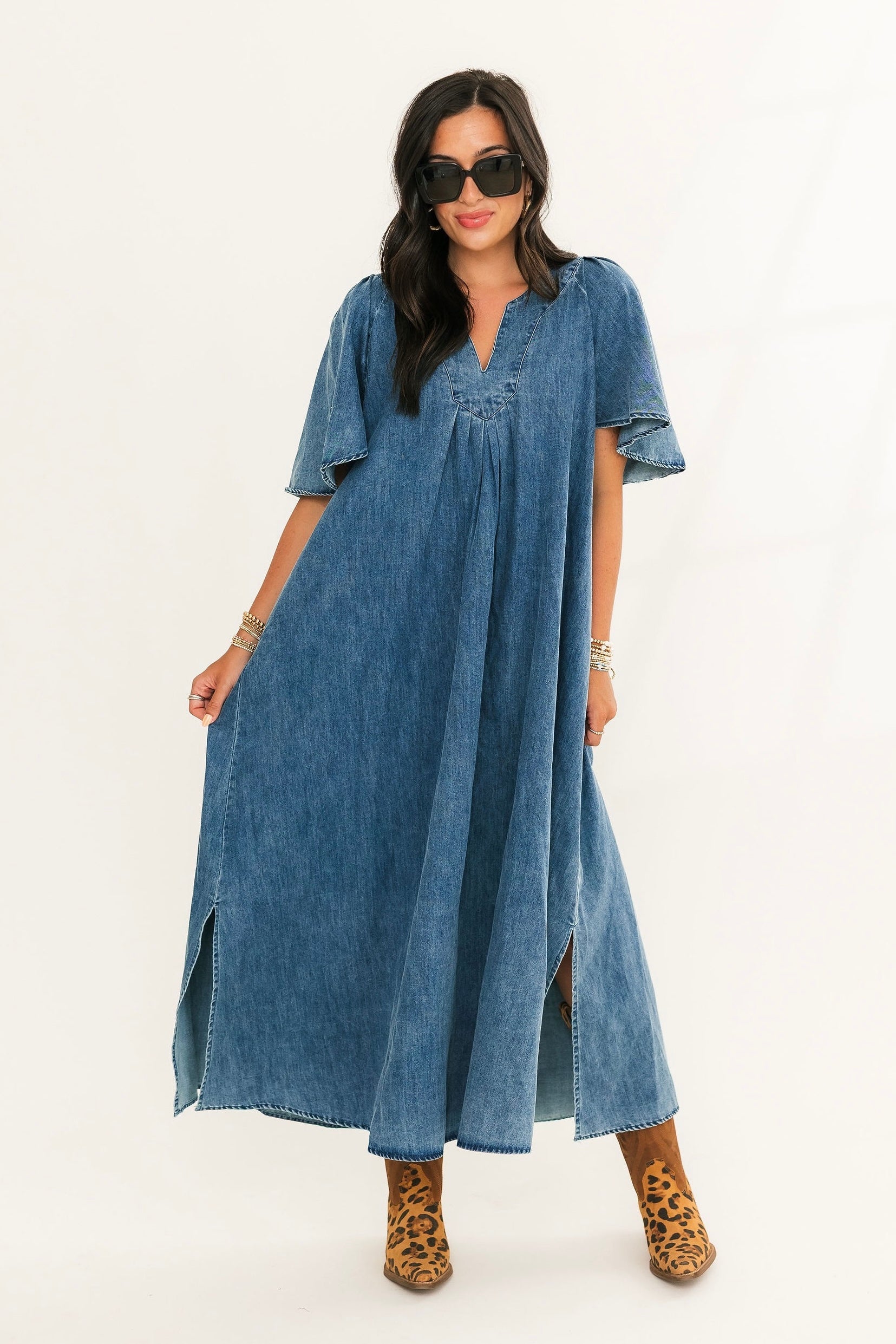 This lightweight denim maxi dress features a flowy, relaxed fit with a flattering V-neckline and short sleeves. Easy to style up or down, it’s the perfect piece for effortless, all-day wear. Pair it with boots, sandals, or sneakers for a versatile look. Sage is wearing a small.