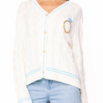 The Queen Of Sparkles White & Blue 'In My Bride Era' Sequin & Pearl Button Up Cardigan features a relaxed fit with a V-neckline, long sleeves, blue trim detailing, and cable knit accents. Embellished with sequins and pearls, it’s perfect for layering, casual occasions, or pairing with matching Queen Of Sparkles pieces for a playful, festive look.