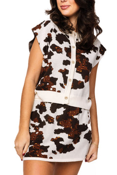 The Queen Of Sparkles White & Brown Sequin Cow Print Skirt features a fitted, stretchy silhouette with an elastic waistband for comfort. Perfect for pairing with your favorite tops or the matching vest for a coordinated, eye-catching look.