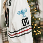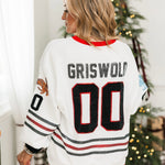 The Queen Of Sparkles White Clark Griswold Jersey Sweatshirt features a relaxed fit with a classic crewneck and long sleeves. Designed with a fun Christmas tree graphic and festive stripe detailing, it’s cozy, playful, and perfect for holiday gatherings, movie nights, or spreading seasonal cheer.