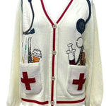The Queen Of Sparkles White Medical Instrument Button Up Cardigan features a relaxed, cozy fit with a V-neck, long sleeves, and full front button closure. Designed for easy layering, it adds a polished yet comfortable element to any outfit