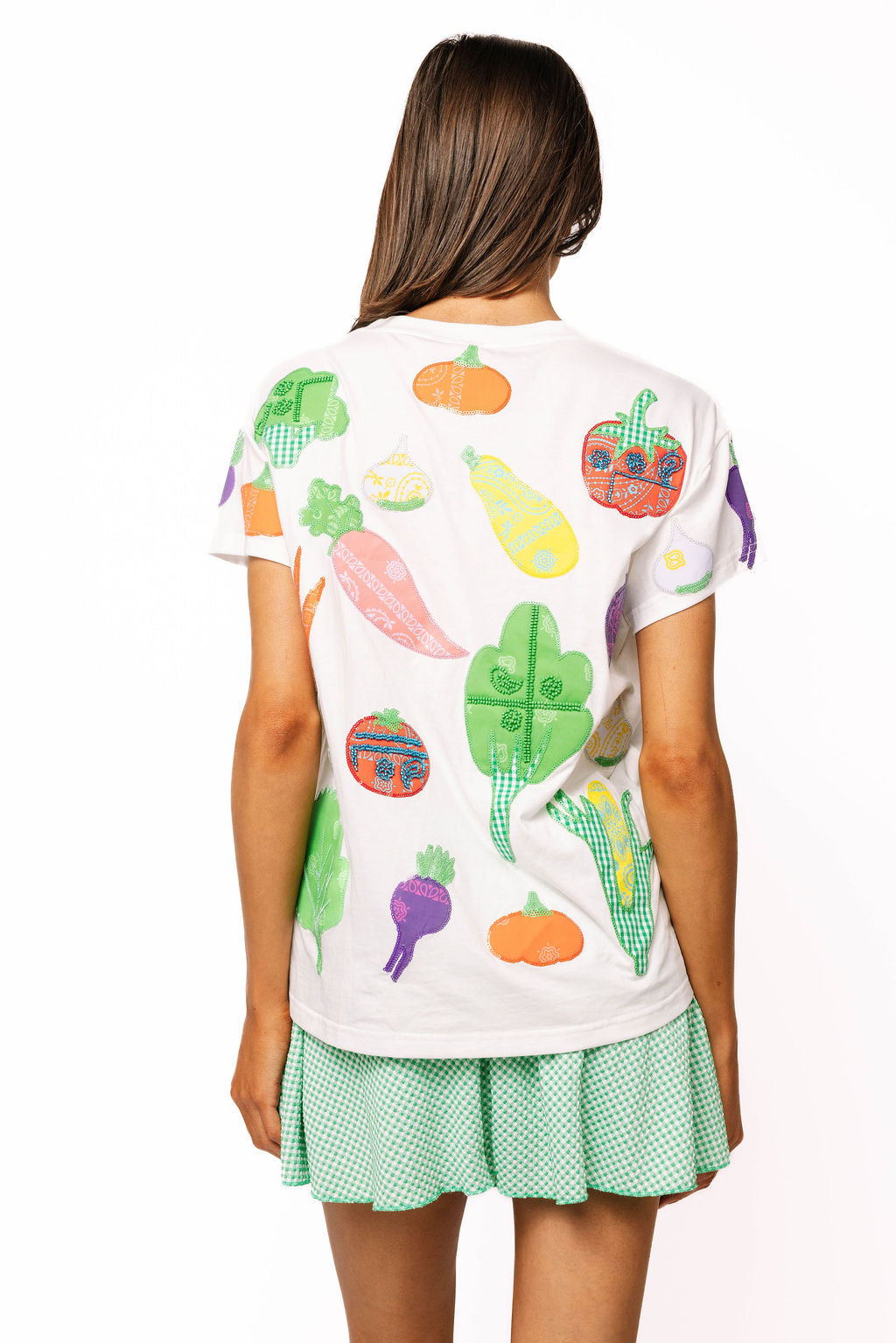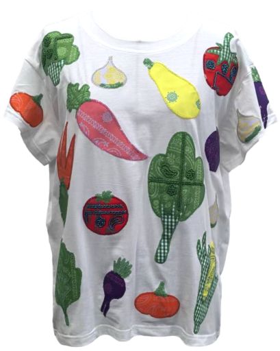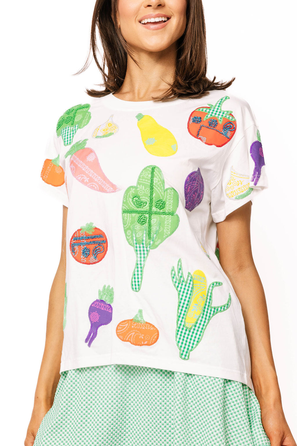 The Queen Of Sparkles White Multi Bandana & Gingham Print Veggie Tee features a relaxed, easy fit with a classic crewneck and short sleeves. Soft and lightweight, it’s perfect tucked into jeans or paired with shorts for an easygoing, chic look.