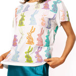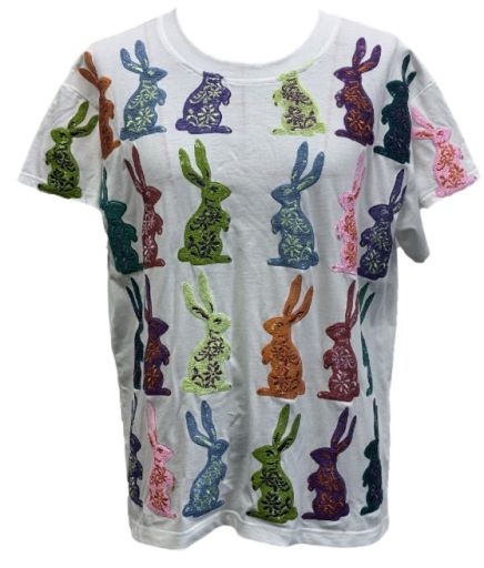 The Queen Of Sparkles White Multi Easter Bunny Tee features a relaxed fit with a classic crewneck and short sleeves. Adorned with colorful Easter bunnies, it’s a playful, everyday-ready piece that adds a fun touch to any spring outfit.