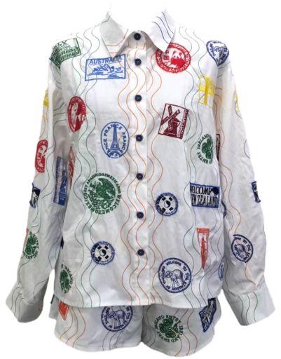 White Multi Passport Stamp Button Up Cotton Top | Queen Of Sparkles
