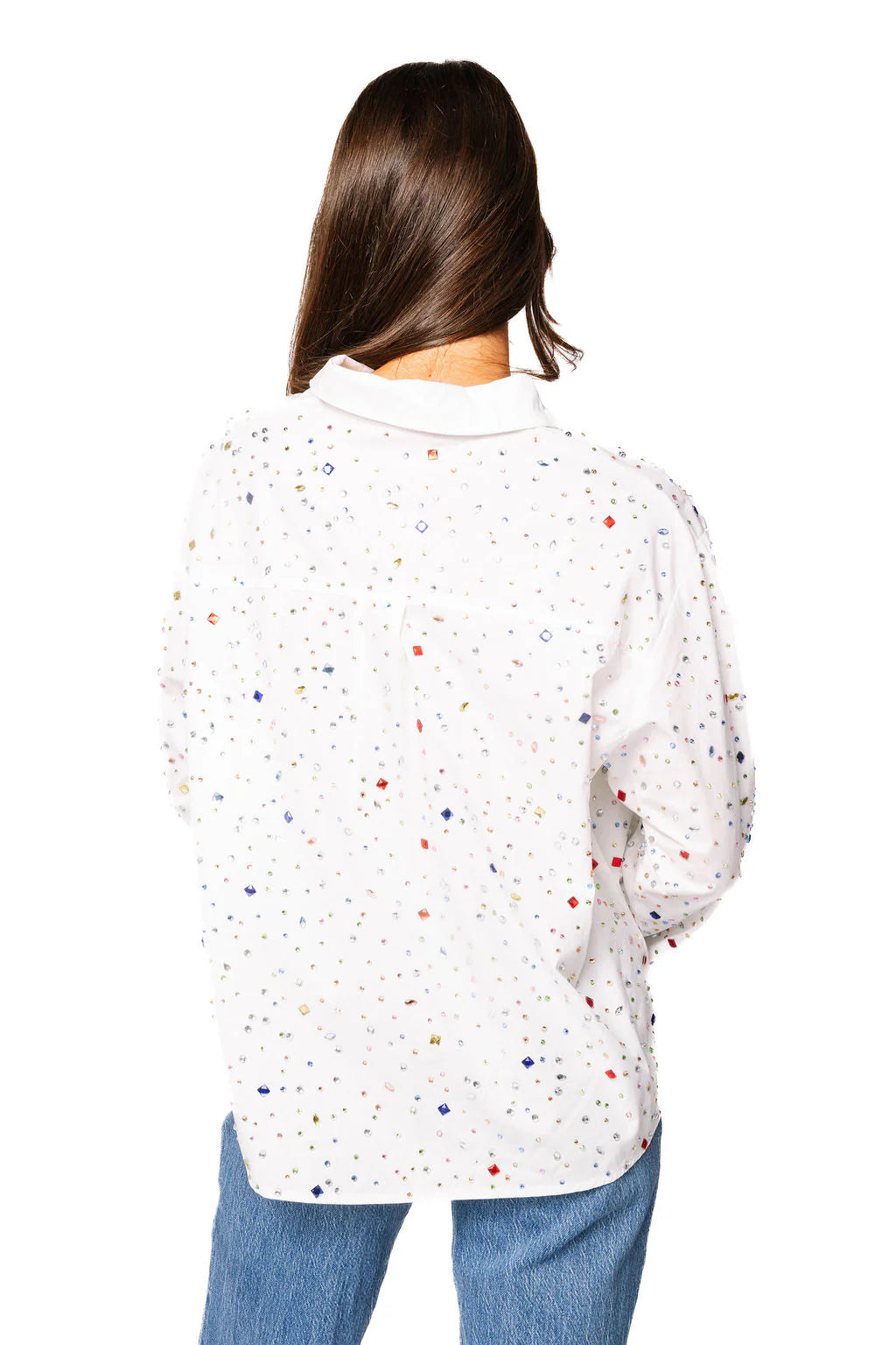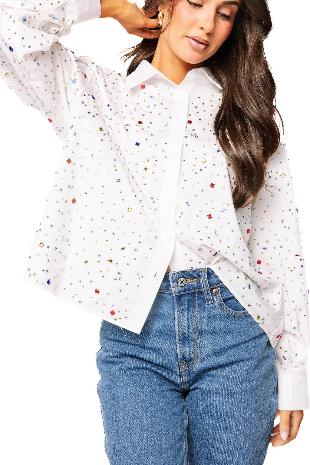 - Why We ❤ It: Sparkle from every angle—this collared button-up top is covered in colorful rhinestones, making it a show-stopping piece perfect for parties, special occasions, or adding a pop of glam to any outfit.