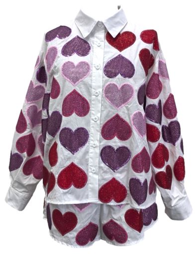 The Queen Of Sparkles White Multi Rhinestone Hearts Button Up Cotton Top features a classic collared neckline, long sleeves, and a full front button closure. With a relaxed yet polished fit and rhinestone heart accents, this cotton top pairs perfectly with denim, skirts, or layered looks.