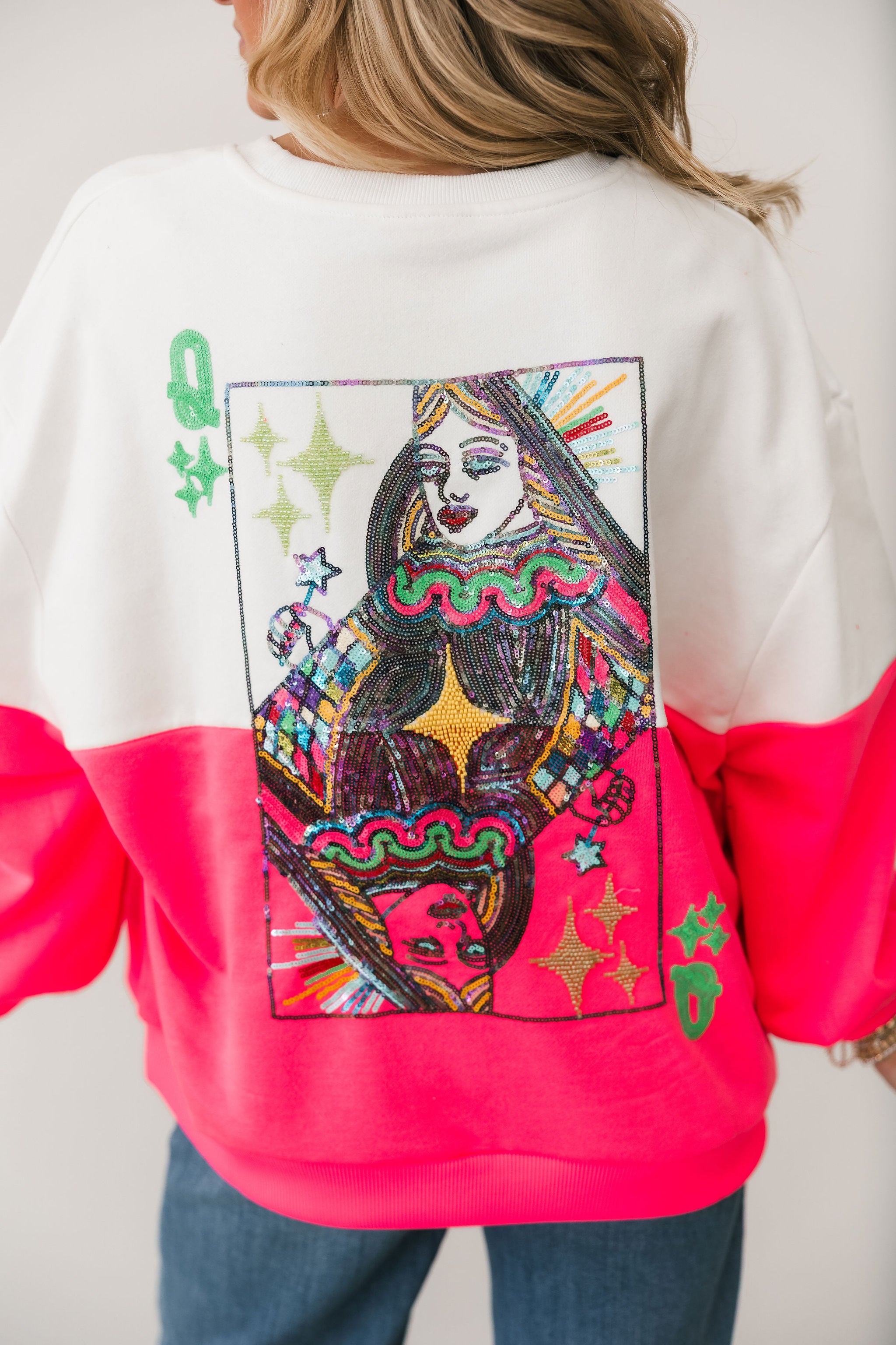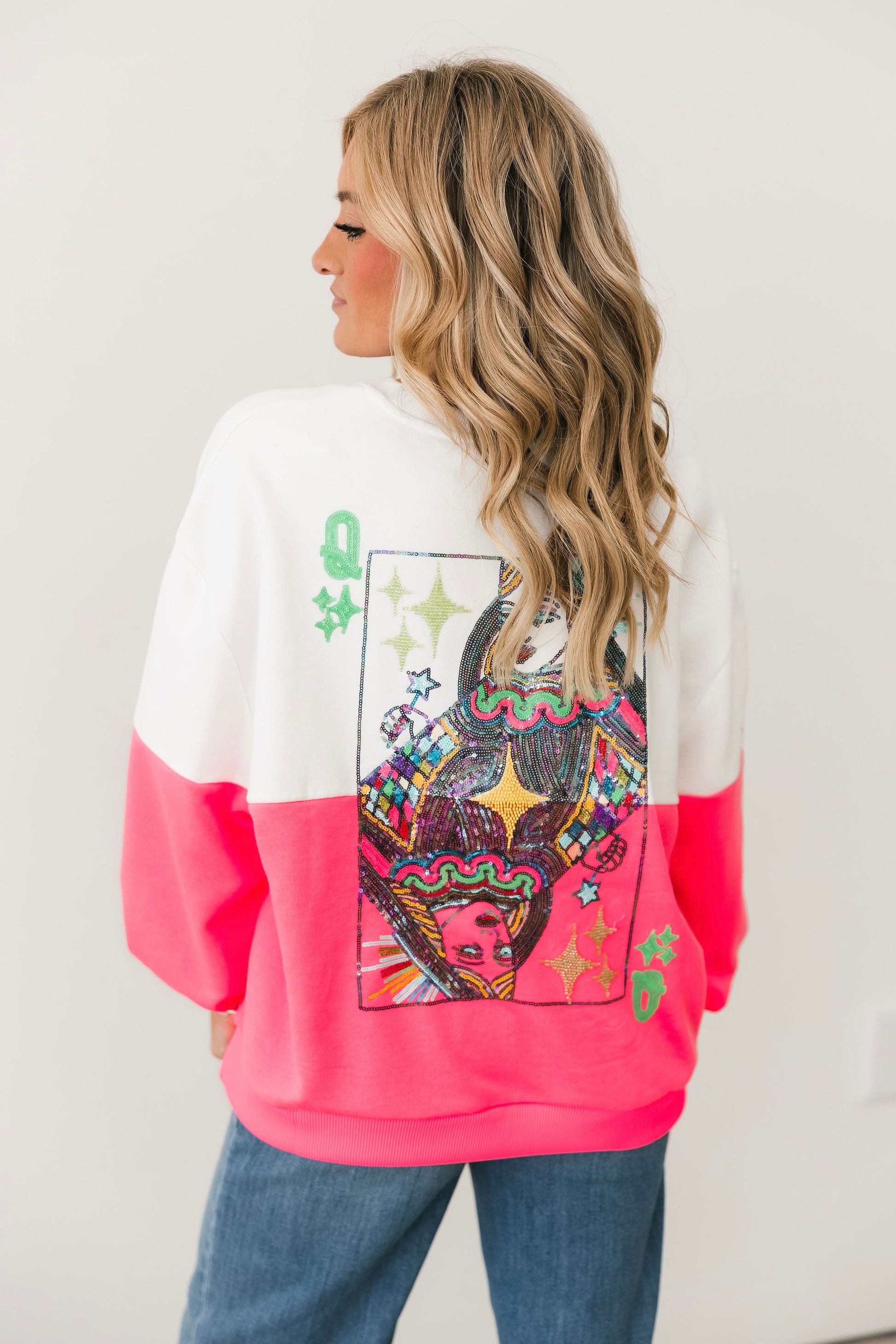 The Queen Of Sparkles White & Neon Pink Colorblock QOS Logo Sweatshirt brings playful energy to your everyday style. Featuring a classic crewneck, long sleeves, and a relaxed fit, it’s designed for comfort with a trendy twist. The white and neon pink colorblock design is finished with the signature QOS logo for a standout look. Lexi Jade is wearing an XS.
