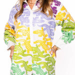 Bring a pop of festive flair to your wardrobe with the Queen Of Sparkles Alligator Button Up Cotton Romper. Relaxed fit with long sleeves and a collared button-up front makes it effortlessly stylish. Eye-catching alligator graphics in classic Mardi Gras colors make this romper a playful must-have for Queen-worthy moments.