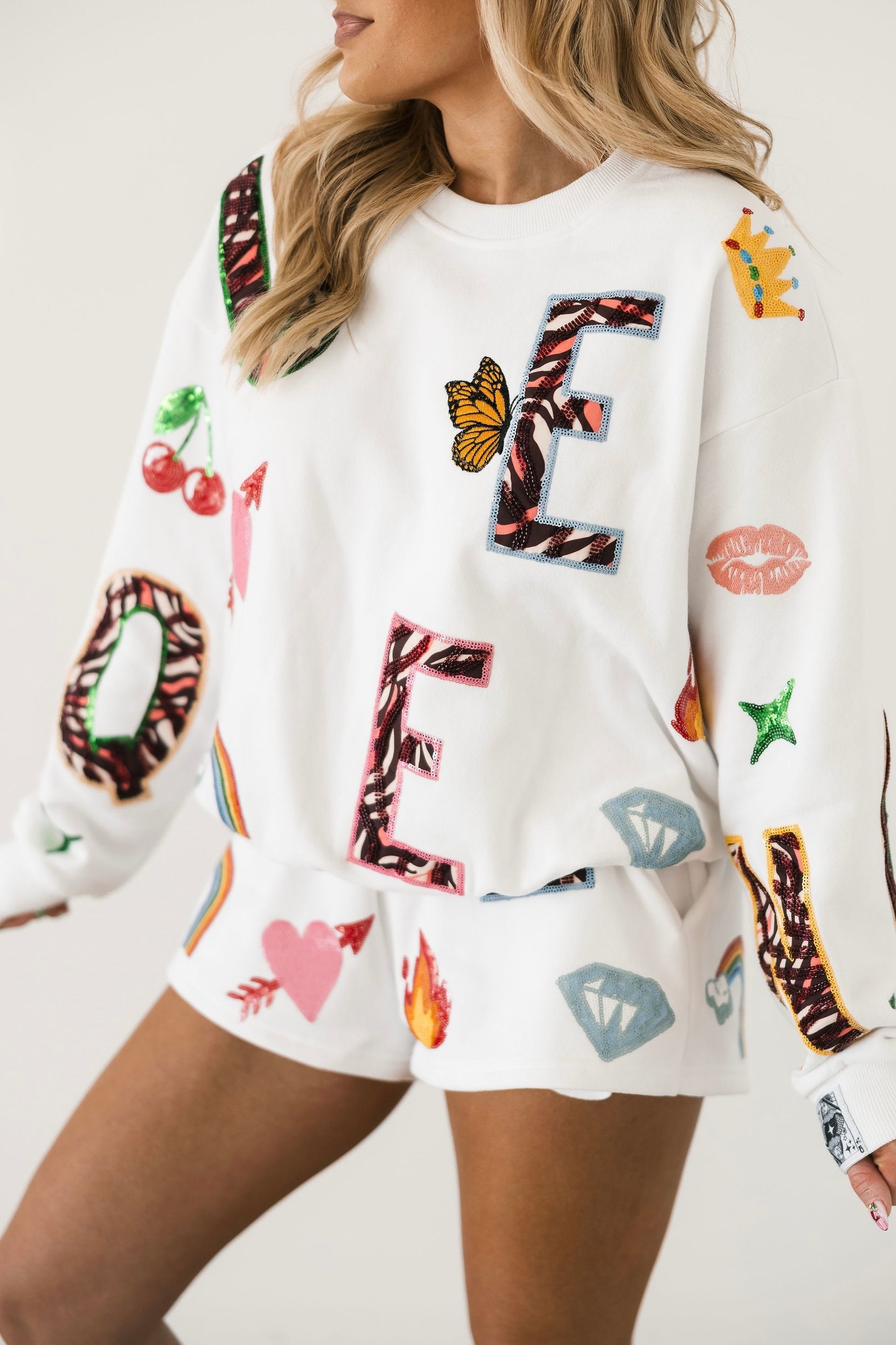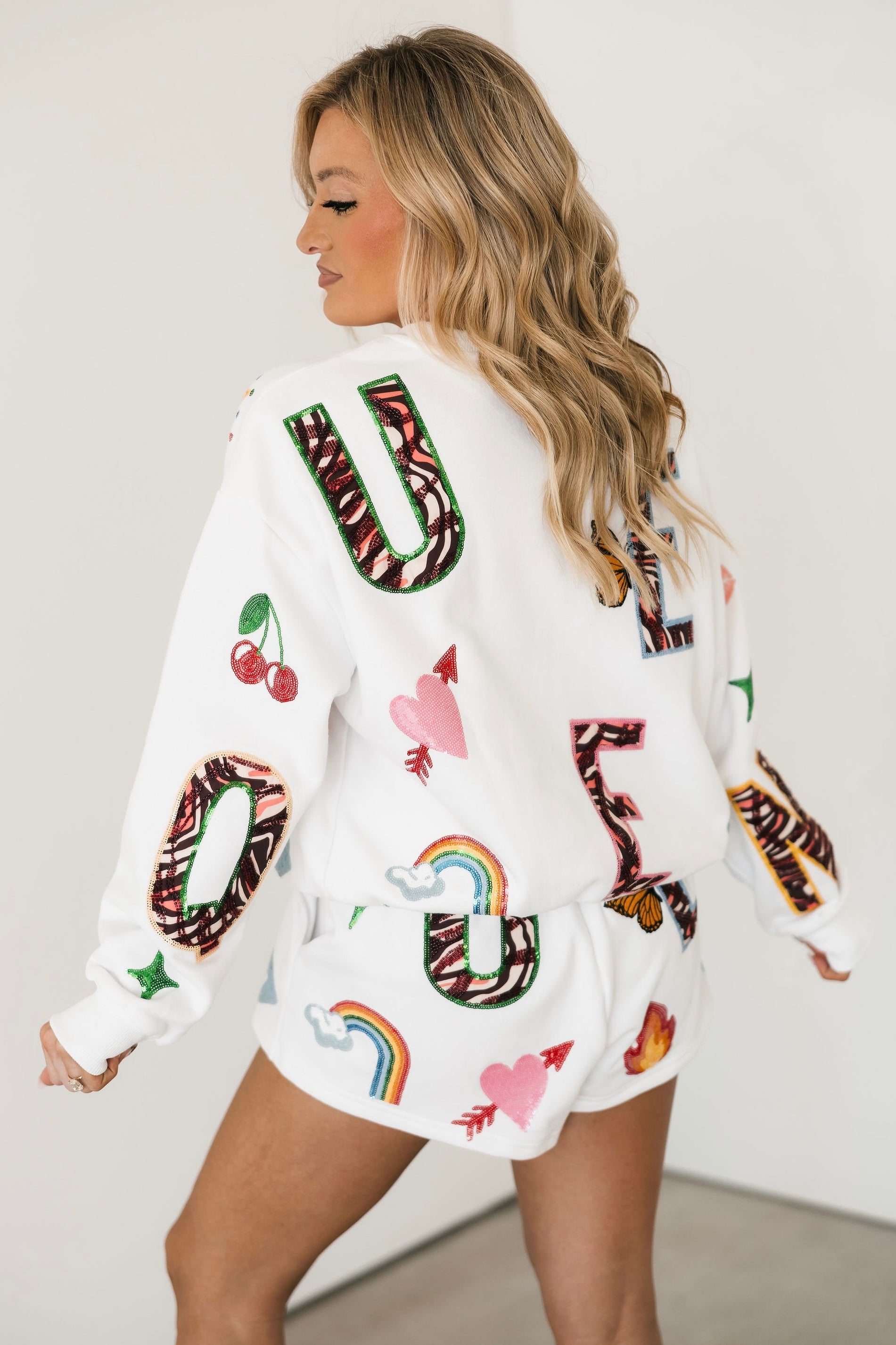 The Queen Of Sparkles White 'Queen' Icon Short features a relaxed fit with an elastic waistband and mid-rise silhouette. Soft and versatile, they’re perfect for lounging, layering, or pairing with the matching sweatshirt for a casual, everyday outfit. Lexi Jade is wearing an XS.