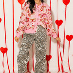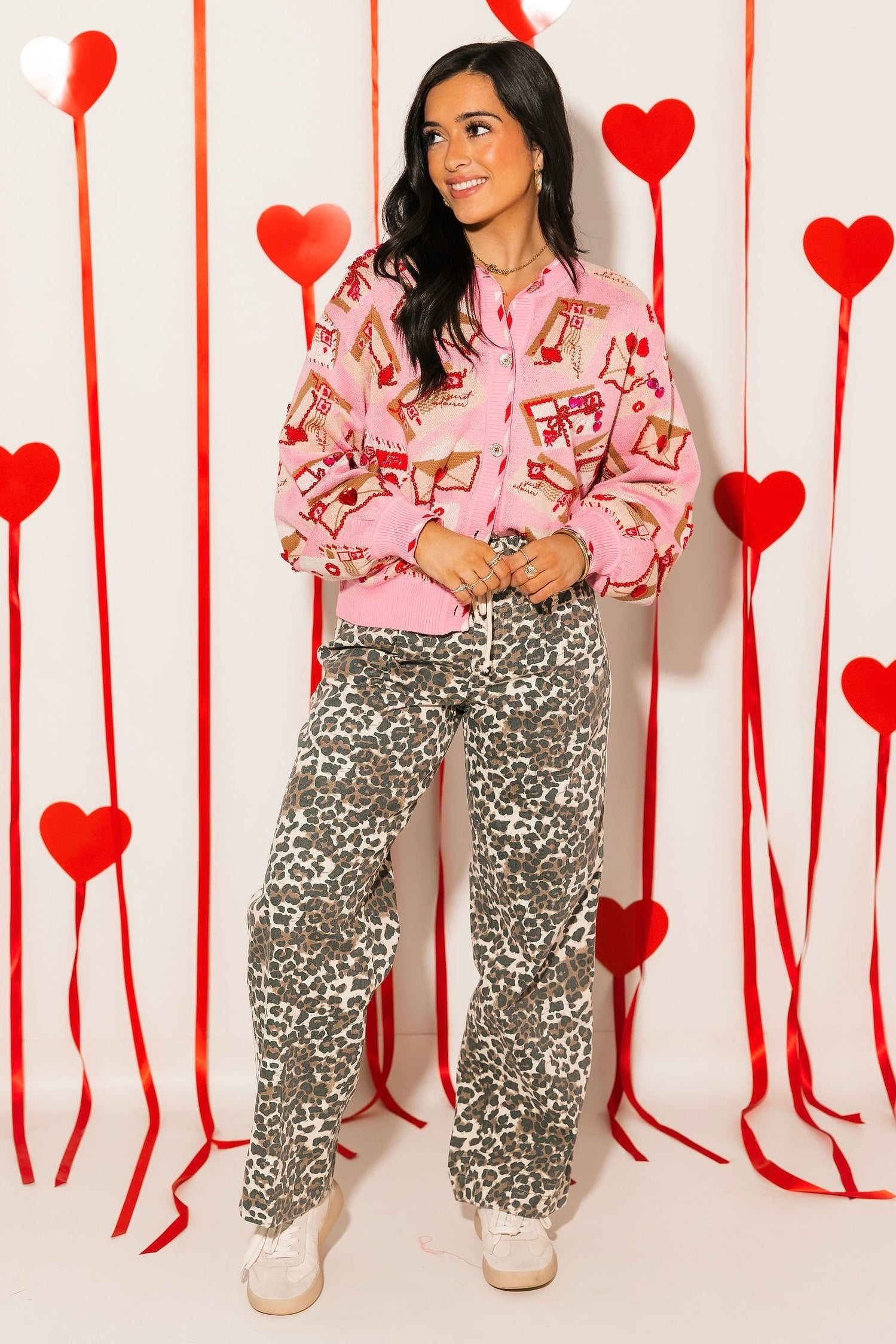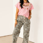 The Wild About You Denim Pants In Red Leopard feature a wide-leg silhouette with an easy elastic waistband and adjustable drawstring for a relaxed, pull-on fit. Designed with an allover cheetah print and finished with contrasting stripe details along the sides, they bring a sporty-meets-bold vibe that styles well with a simple tee or dressed up with a sweater. Lexi is wearing a small.