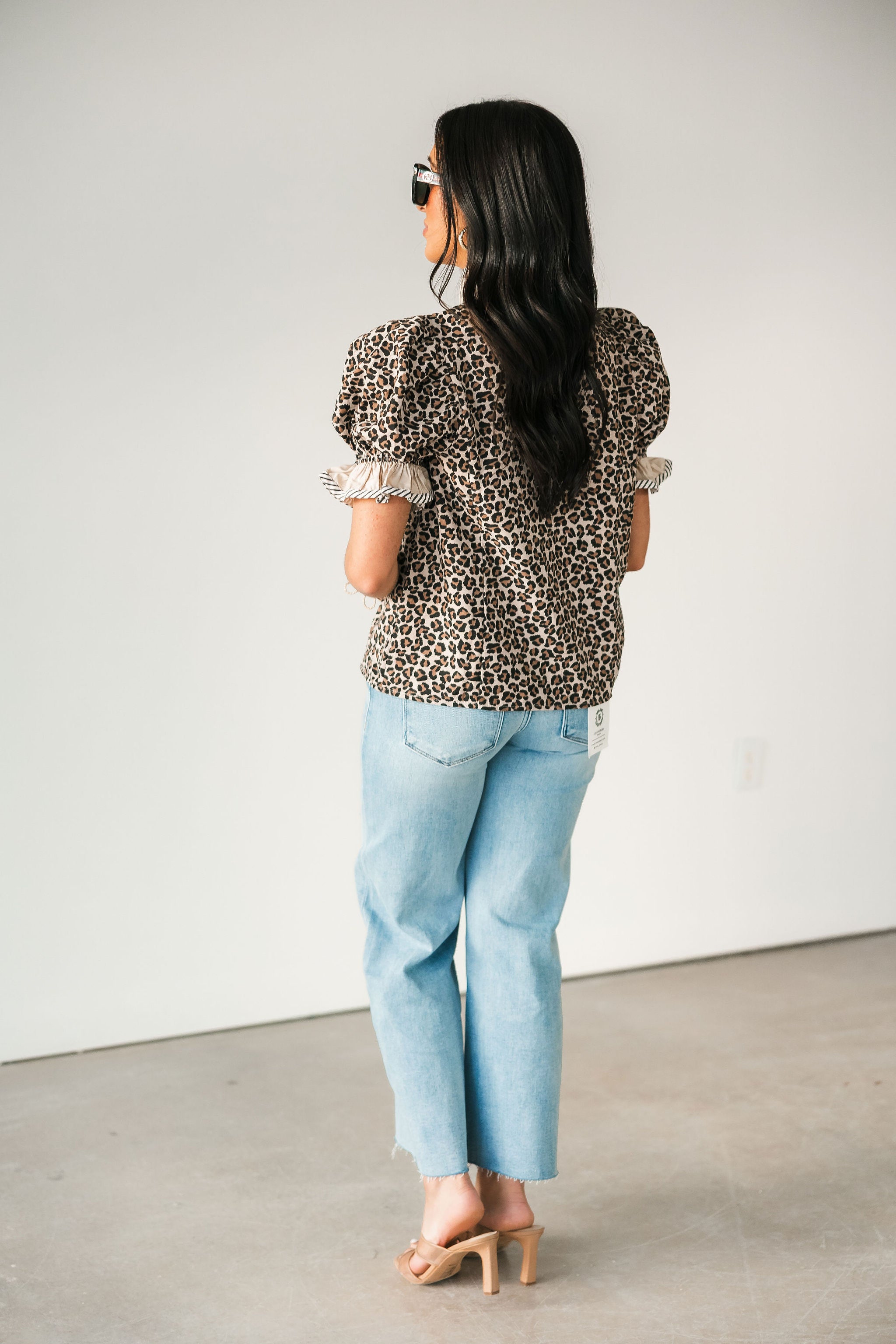 The Wild Whisper Top in Leopard brings together playful charm and chic design. Featuring a relaxed fit, this top is crafted with puff short sleeves, a flattering V-neckline, and feminine ruffle detailing that adds movement and dimension. The stripe hem detail gives it a unique contrast, making the leopard print stand out even more. Easy to dress up with trousers or keep casual with denim, it’s the perfect piece when you want something bold yet wearable. Sage is wearing a small.