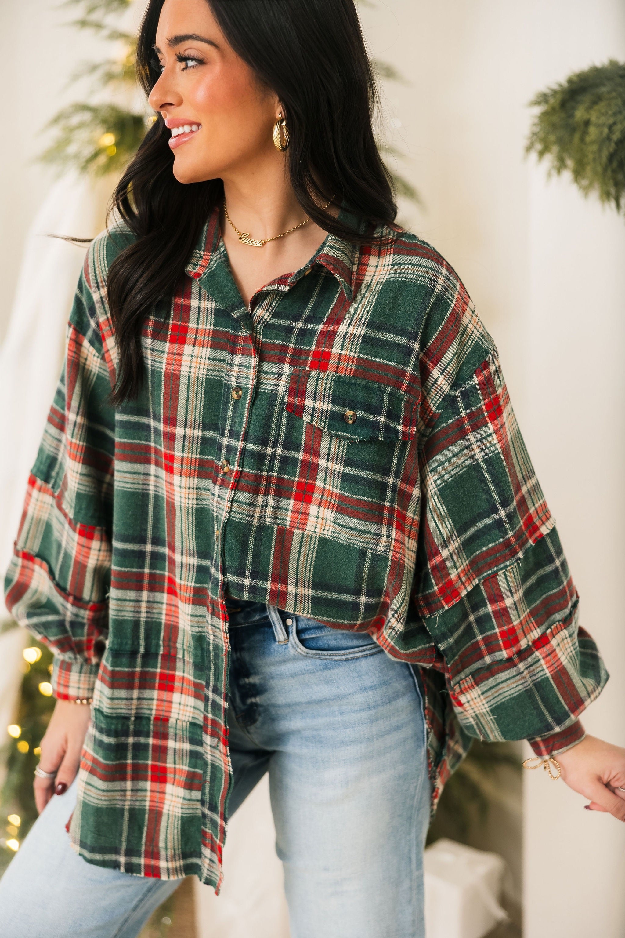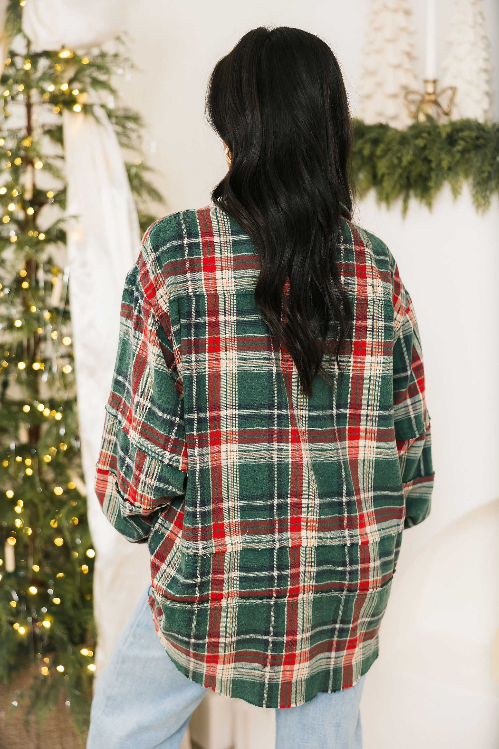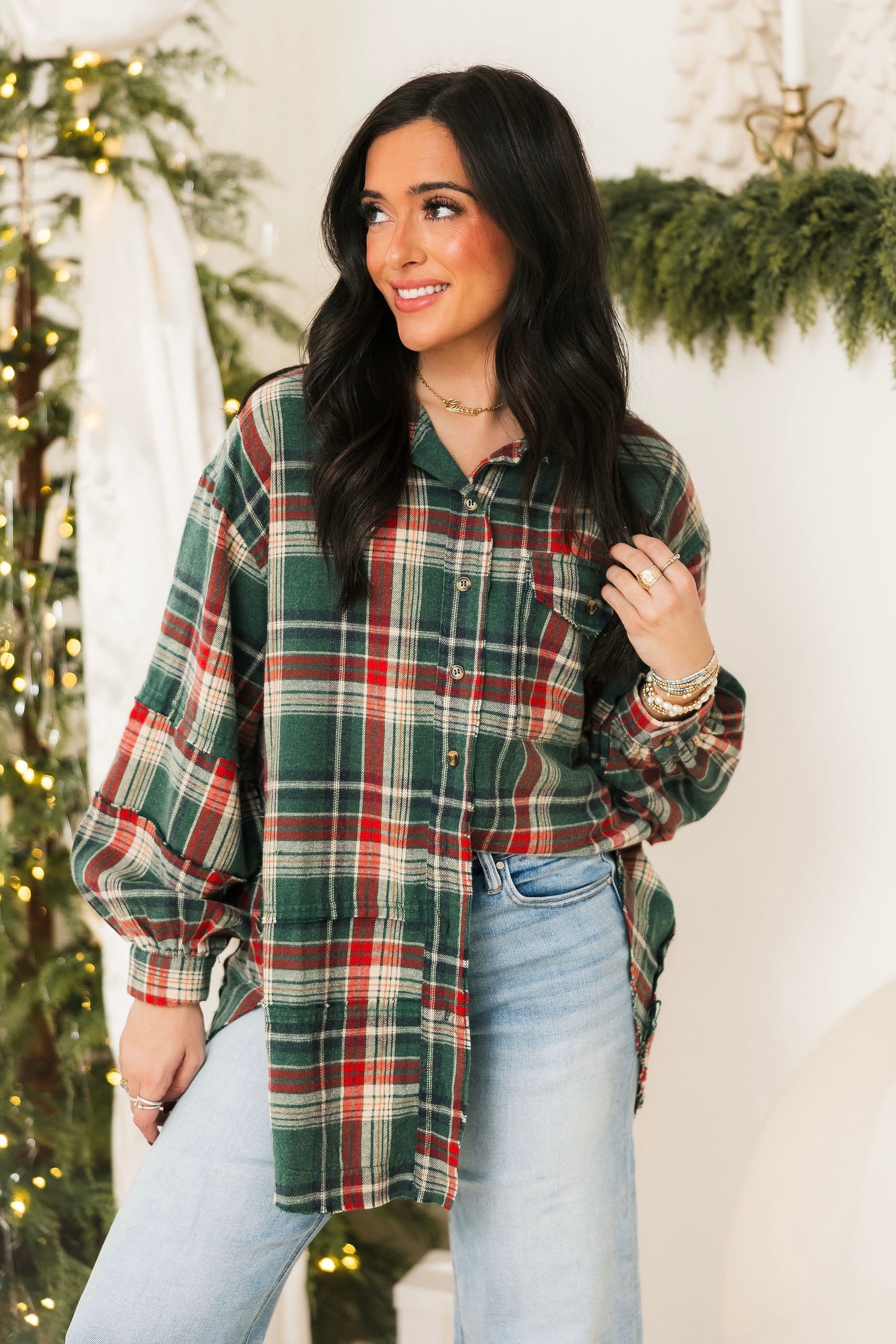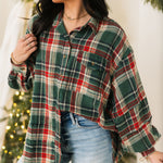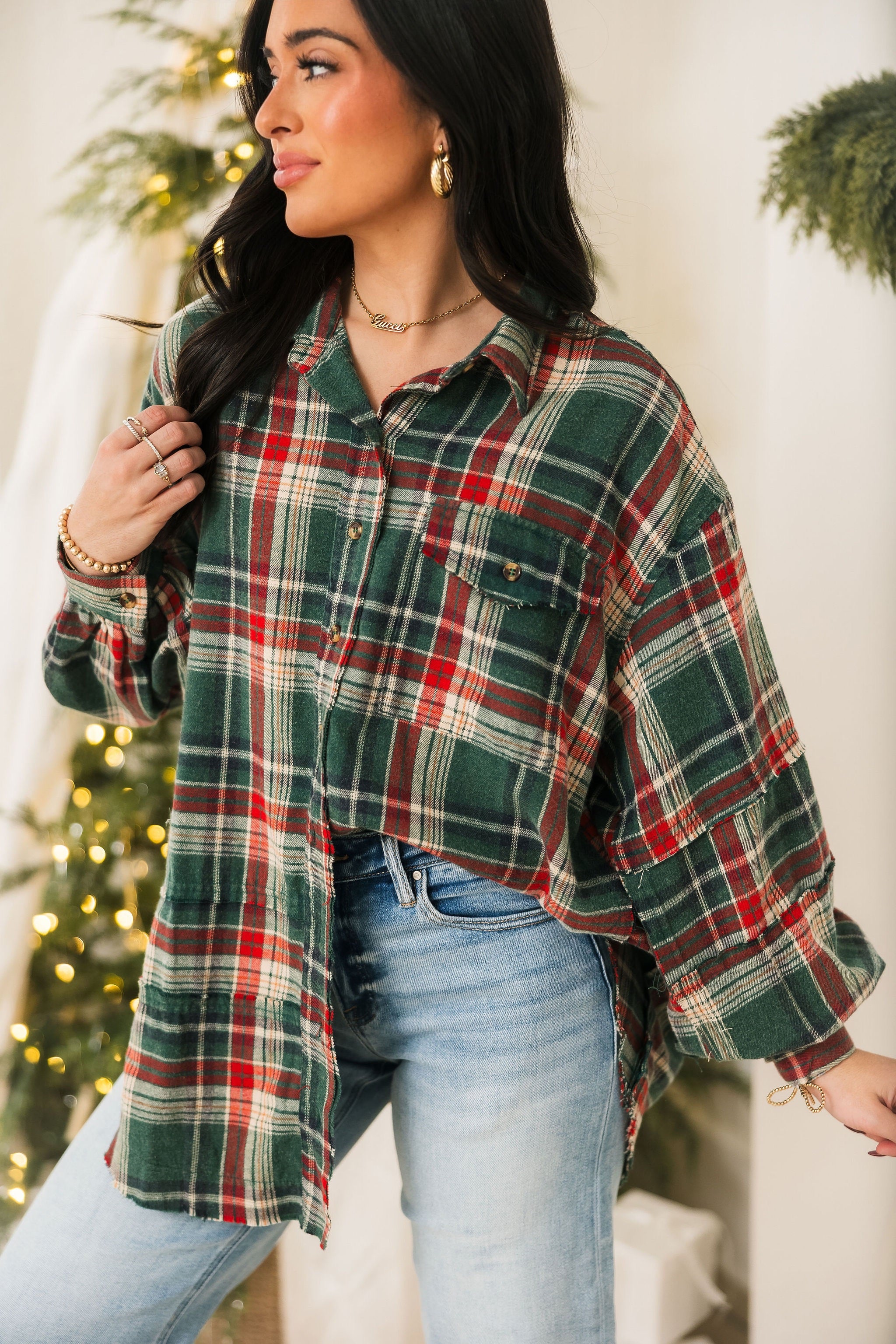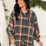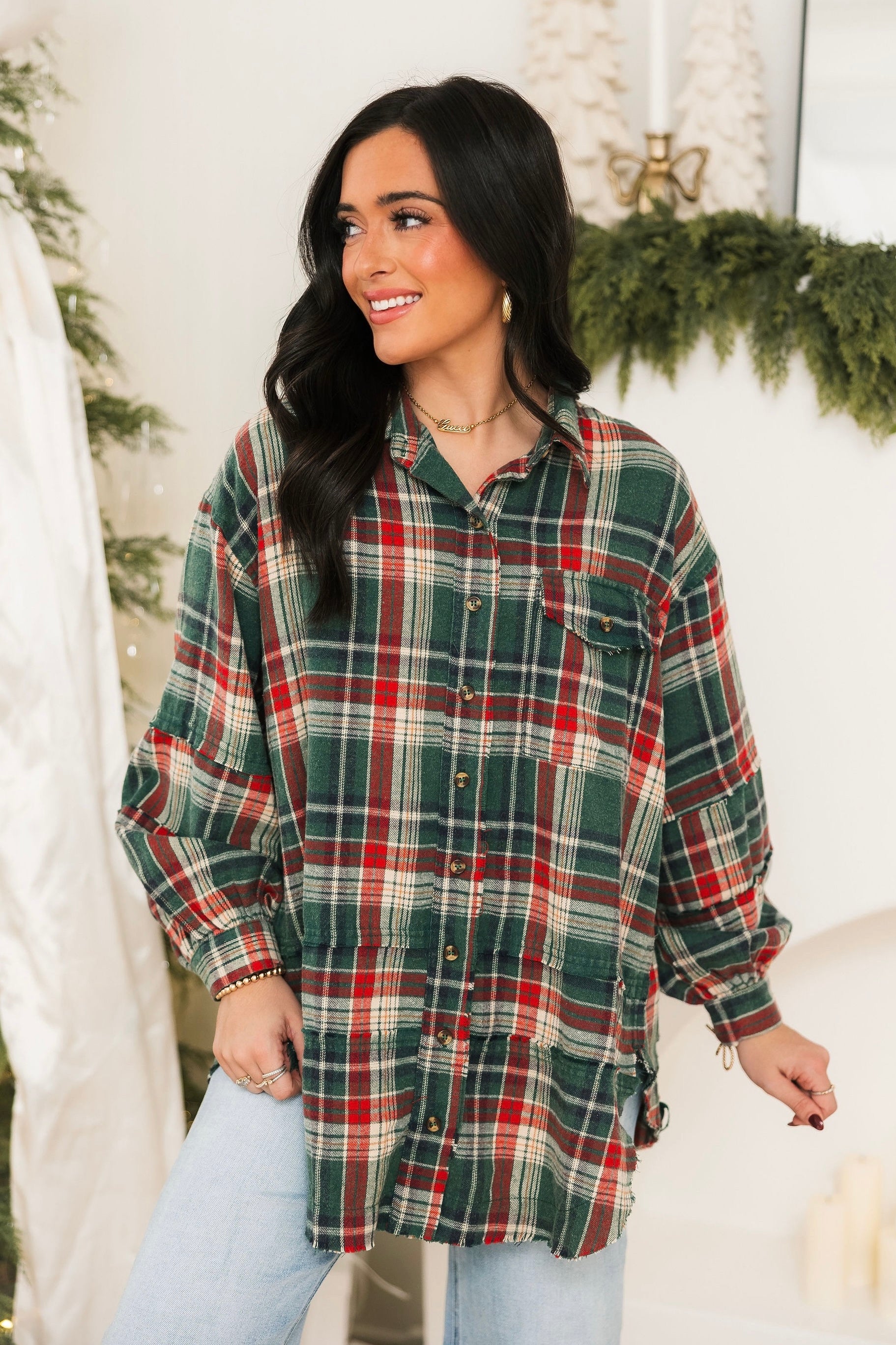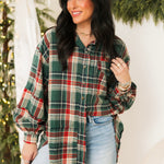 The Wildwood Oversized Flannel Shirt is all about cozy, relaxed style. With its soft fabric, raw-edge curved hem, and effortless drape, it’s the perfect piece for layering on crisp days or lounging in comfort. Sage is wearing a small.