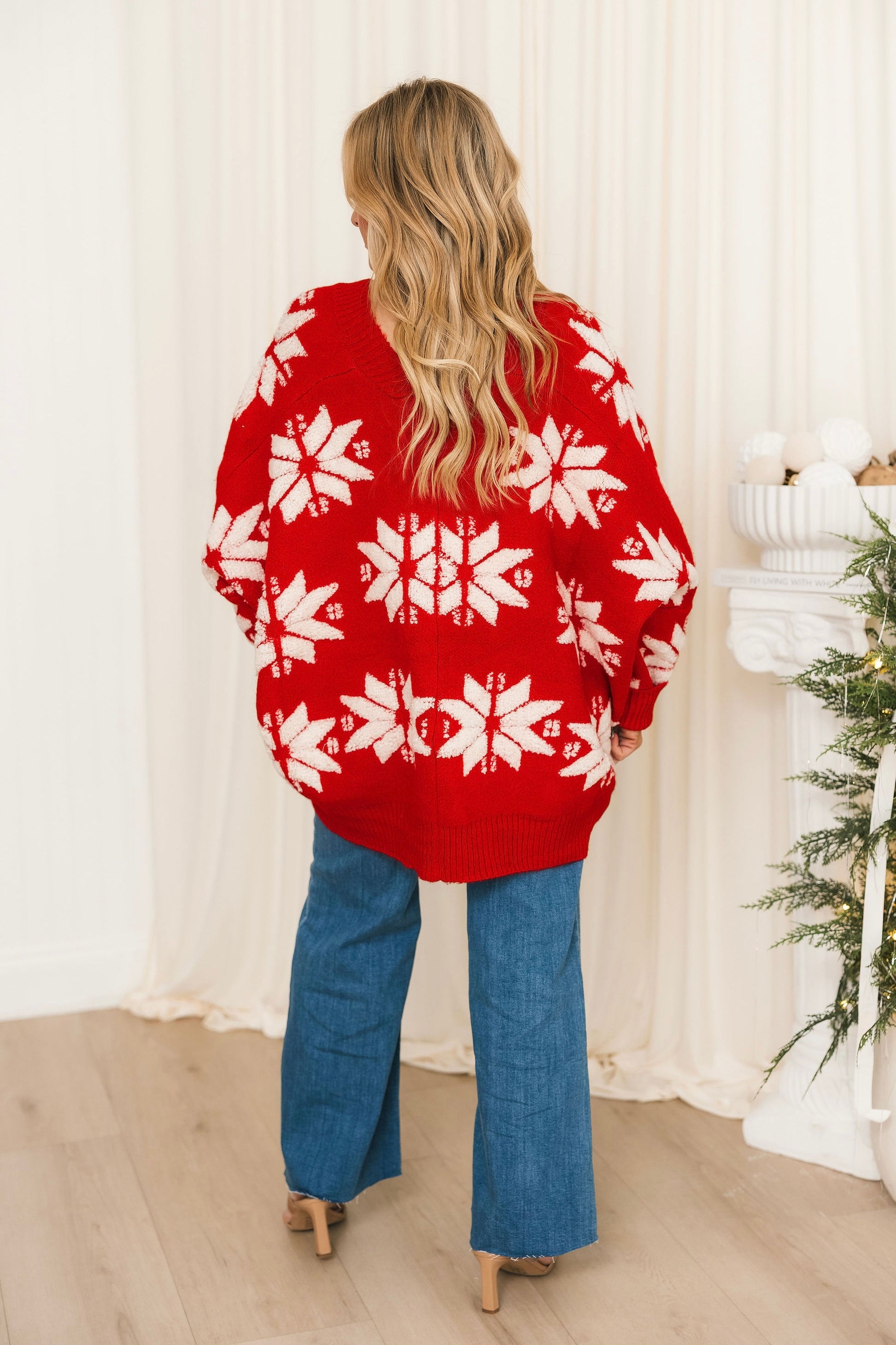Cozy up in the Winter Star Snowflake Cardigan, the ultimate cold-weather layer. Designed in a soft knit with a relaxed, oversized fit, it features a classic button front and timeless snowflake pattern that feels perfectly festive yet wearable all season long. Lexi is wearing a small.