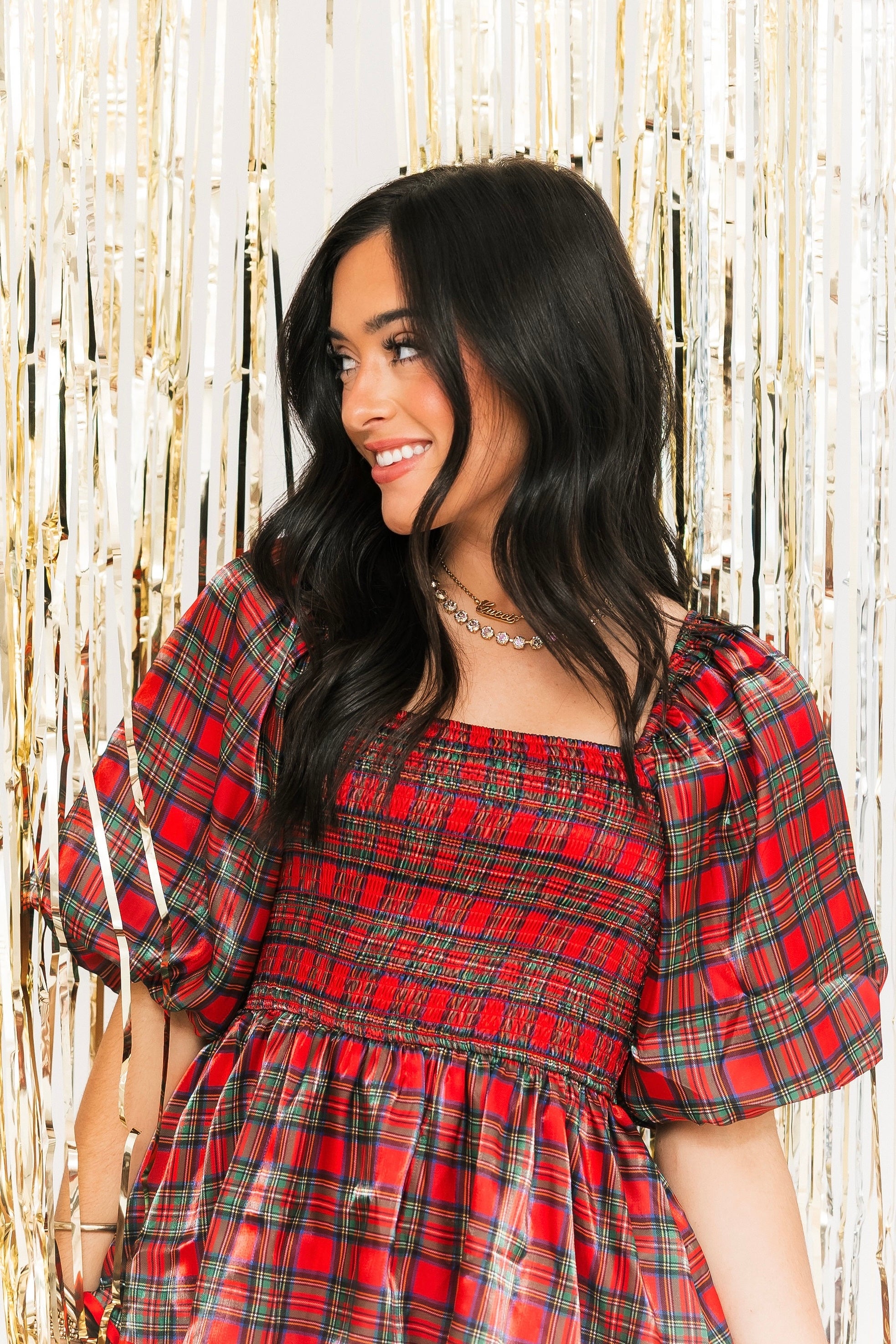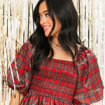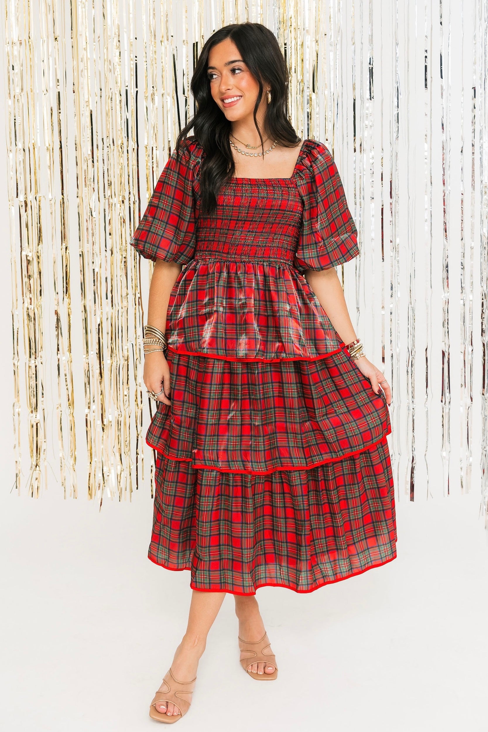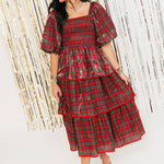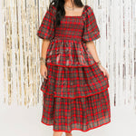 The Winterberry Plaid Dress is the perfect mix of timeless charm and holiday spirit. With its smocked bodice, puff sleeves, and tiered skirt, this midi dress flatters every figure while keeping things sweet and effortless. Sage is wearing a small.