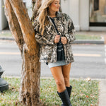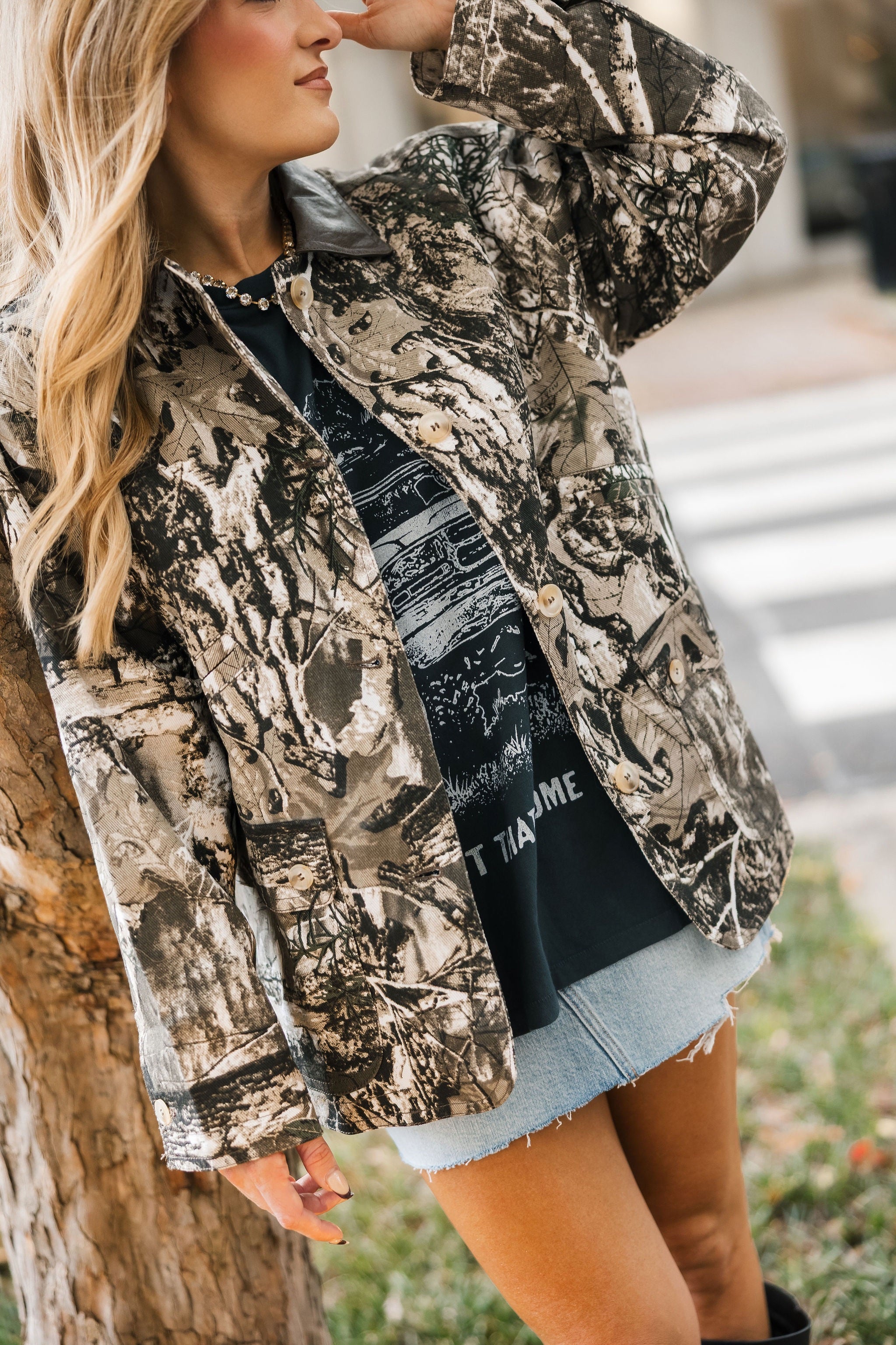 Layer up in effortless style with this camo-print shacket, designed with a boxy, oversized fit that’s perfect for year-round wear. Featuring a button-up front, collared neckline, and roomy front patch pockets, it’s the ideal blend of rugged and cozy. Lexi is wearing an xs.