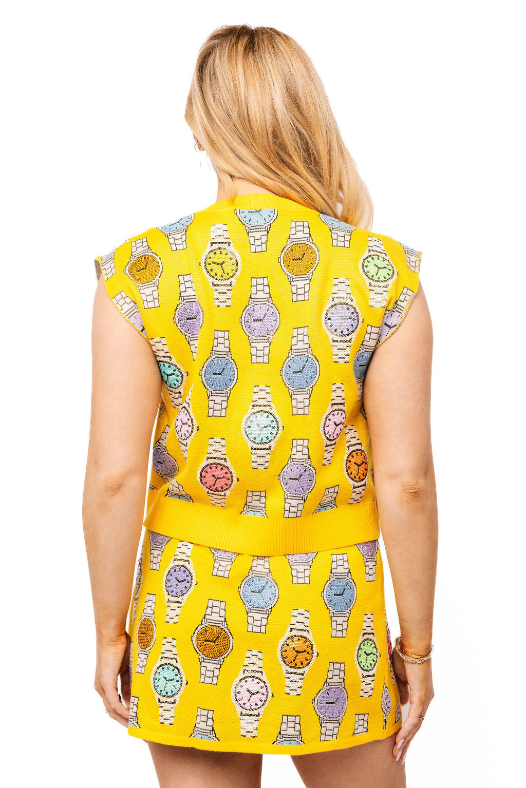 Playful and statement-making, this vest features a colorful watch design that adds instant personality to your look. The bright yellow base makes it a standout for spring styling. Designed with a boxy, relaxed fit, it layers effortlessly without feeling fitted. The classic crewneck and front button closure keep it structured and easy to style, while the sleeveless cut makes it perfect for pairing with denim, over dresses, or with the matching skirt. 💛✨