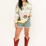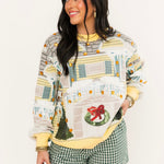 The Queen Of Sparkles Yellow Trim Griswold House With Wreath On Door Sweater features a relaxed fit with a classic crewneck and long sleeves. Finished with a sparkling Griswold house graphic and festive yellow trim, it’s the perfect playful nod to everyone’s favorite holiday classic. Cozy, whimsical, and made to stand out—it’s a must for movie nights, parties, and all your seasonal celebrations. Safe is wearing an XS.