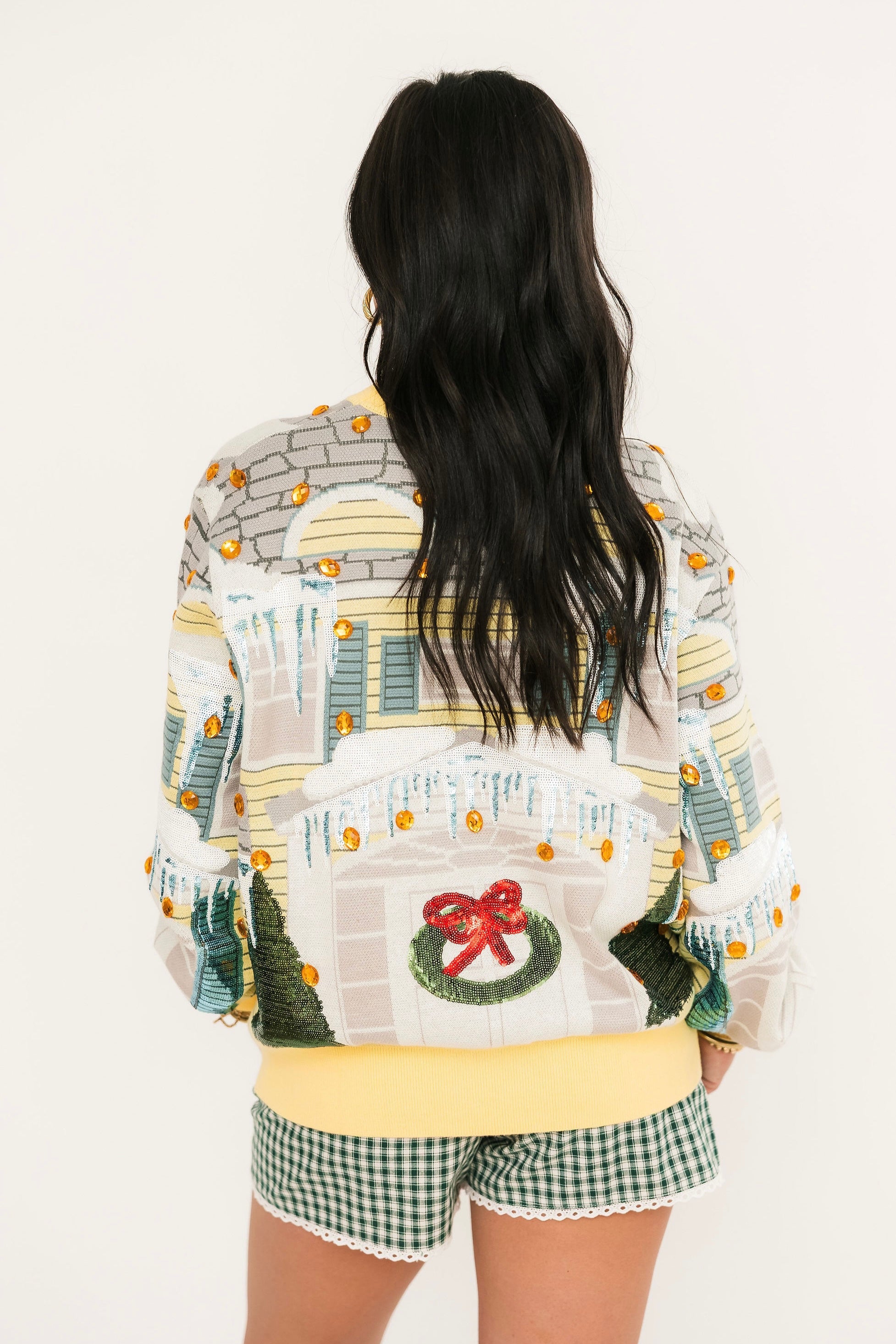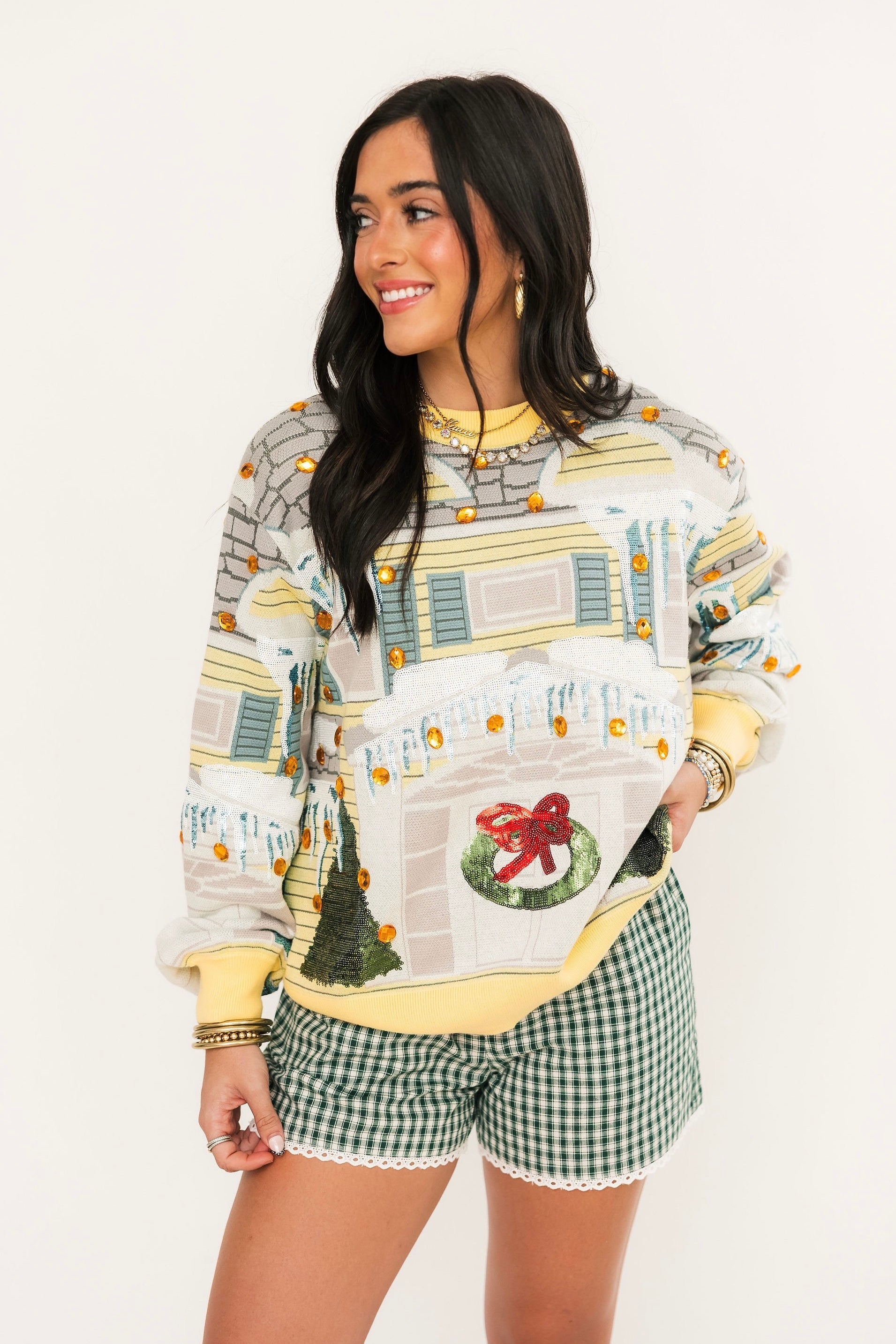 Yellow Trim Griswold House W/Wreath On Door Sweater | Queen Of Sparkles